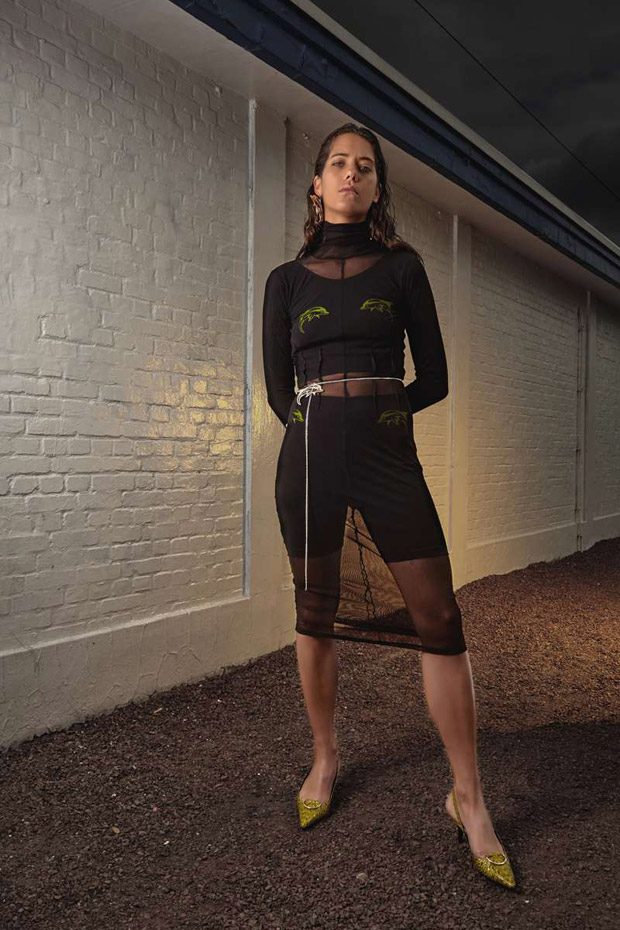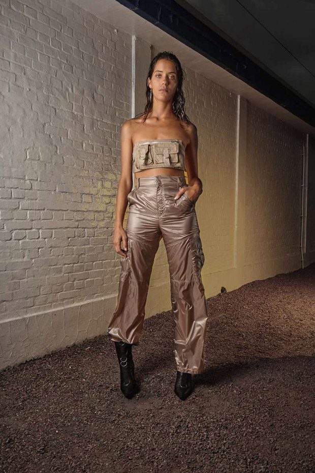 “Technical fabrics are finished with tent-like details and clash with soft mesh jerseys that make one think of mosquito nets. These delicate materials are put together with more bold metal elements and personalised webbing tape that showcase a slight hint back to a more industrial city scape, considering we are never tourists all
