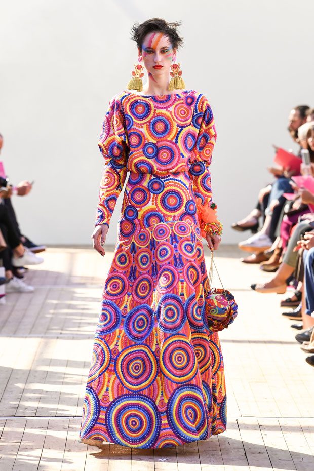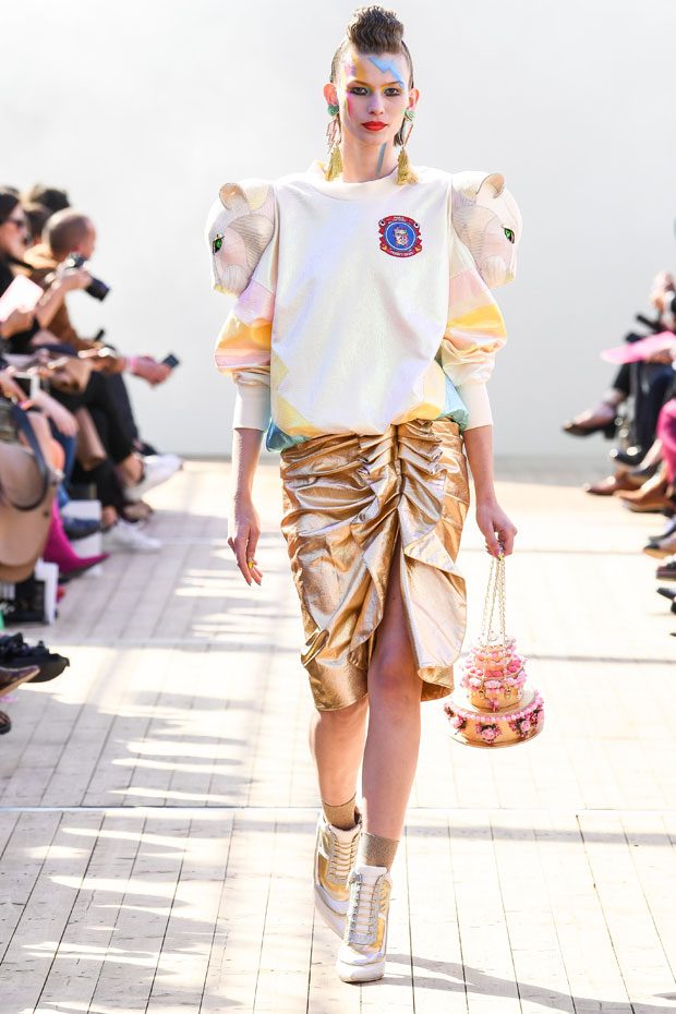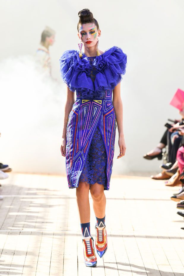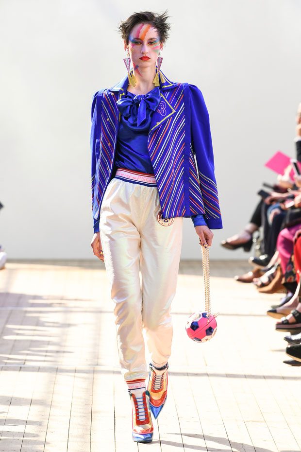 An 80s aesthetic infuses the entire collection, along with a heavy dose of sex appeal from plunging necklines to thigh-skimming hemlines, all teamed with vertiginous stiletto ‘football’ boots in shining neon pvc, glitter and aertex. Airbrushed 80s prints nod to the work of iconic illustrator Antonio Lopez, and recall the graphic tropes of the era – stenciled leopard print and polkadots, bold stripes and zingy zig-zags, and illustrated motifs like lipsticks, roller-skates, cocktails and cds, which also embroider pale wash 80s denim jackets. The sense of nostalgia continues, with the return of one of Arora’s iconic circle prints from his first Paris collection, reimagined in satin stitch threadwork and patch-worked onto sporty hooded raincoats. Shiny sportswear meets 80s glamour thanks to ostentatious frills and ruffles on rich rose brocades. – from Manish Arora