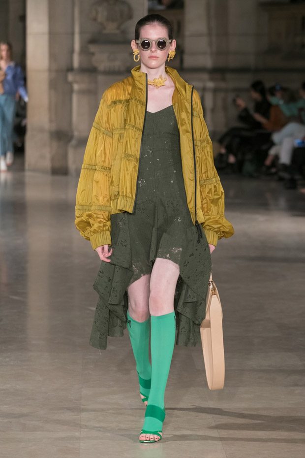 Existence as a perpetual search for self – continually editing, modifying one’s identity in a form of daily annihilation – is at the core of the collection. The sci-fi film of that name – Annihilation – resonated with Ma , as Lena, the film’s protagonist, is so driven by her thirst for knowledge and ultimately a search for her true self, that it outweighs any fear of her bizarre surroundings. The film’s action takes place in The Shimmer, an inexplicable environment of ongoing mutation. The designer draws parallels between the Shimmer and modern China – whereby global influences enter, get reflected and then mutated. Throughout the SS19 collection this mutation of influences into a visibly Chinese aesthetic is taking place. Traces of the Glimmer are found in the fabrication – rainbow shimmer sequins, glistening satins, embroidered serpent skin on lace and acid yellow waterproofs.