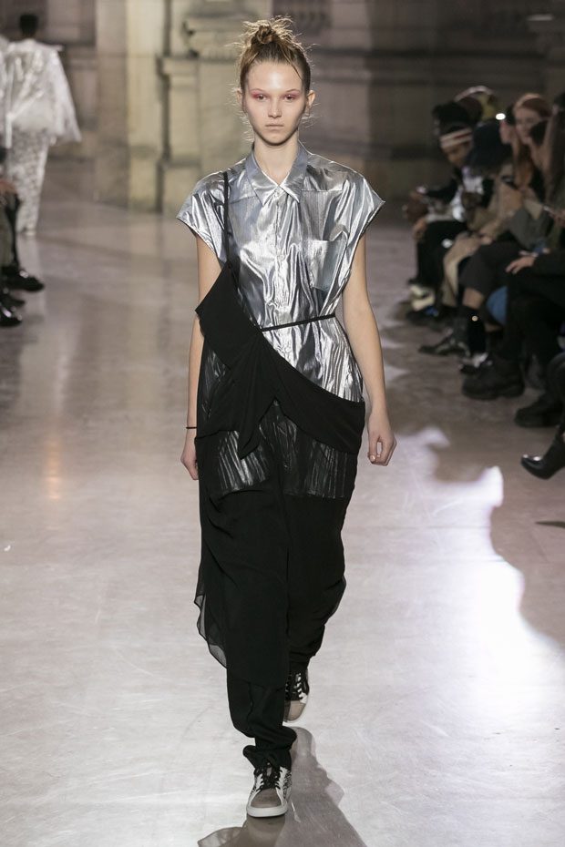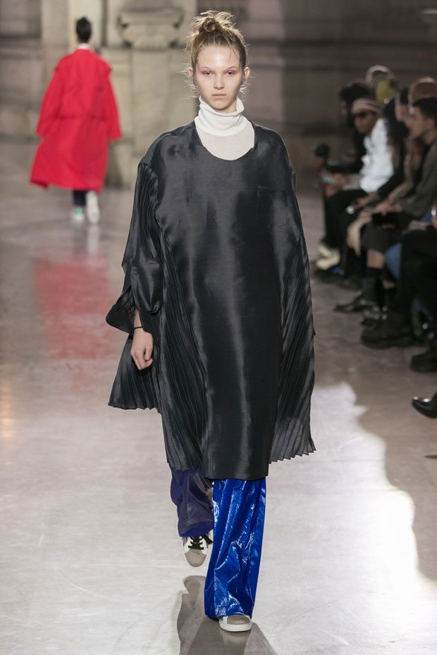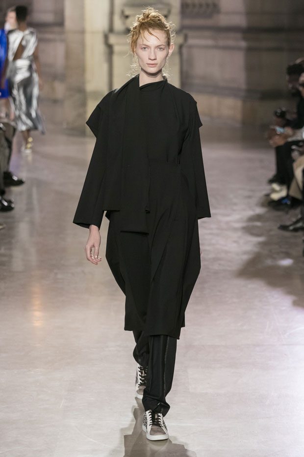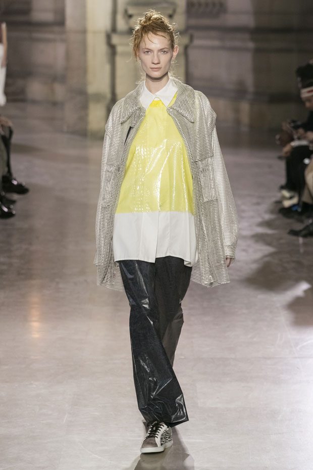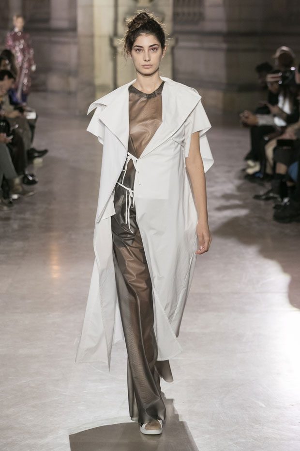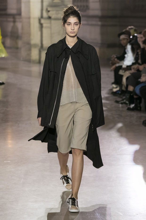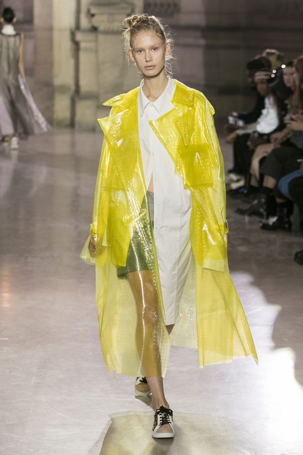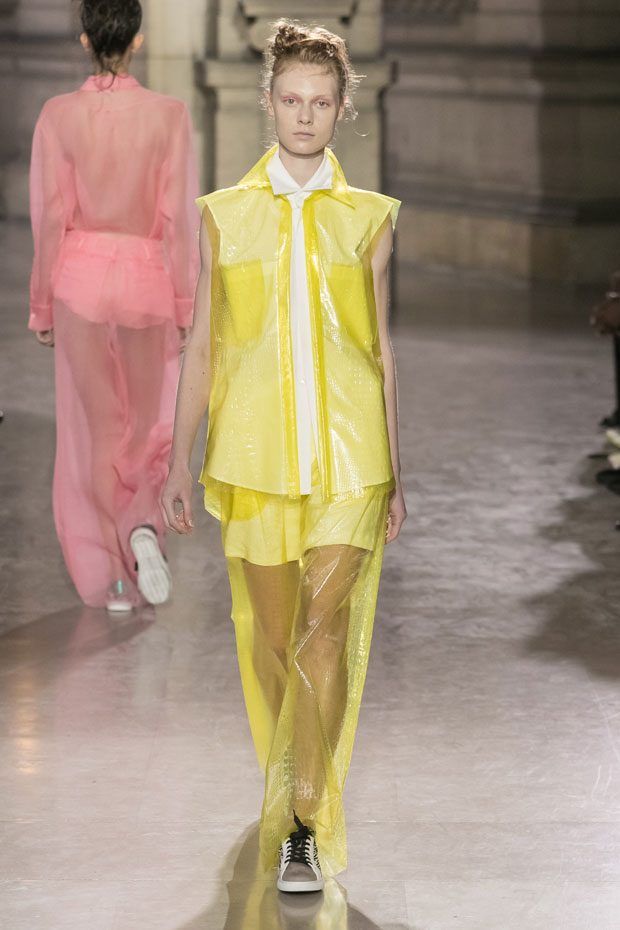 Discover Moon Young Hee Spring Summer 2019 Collection, presented during the last day of recently finished Paris Fashion Week. Combining the technic materials and asymmetric cuts, the collection features soft color palette infused with shades of red, yellow and metallics.