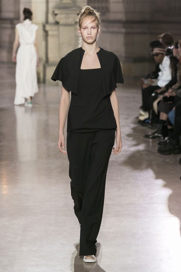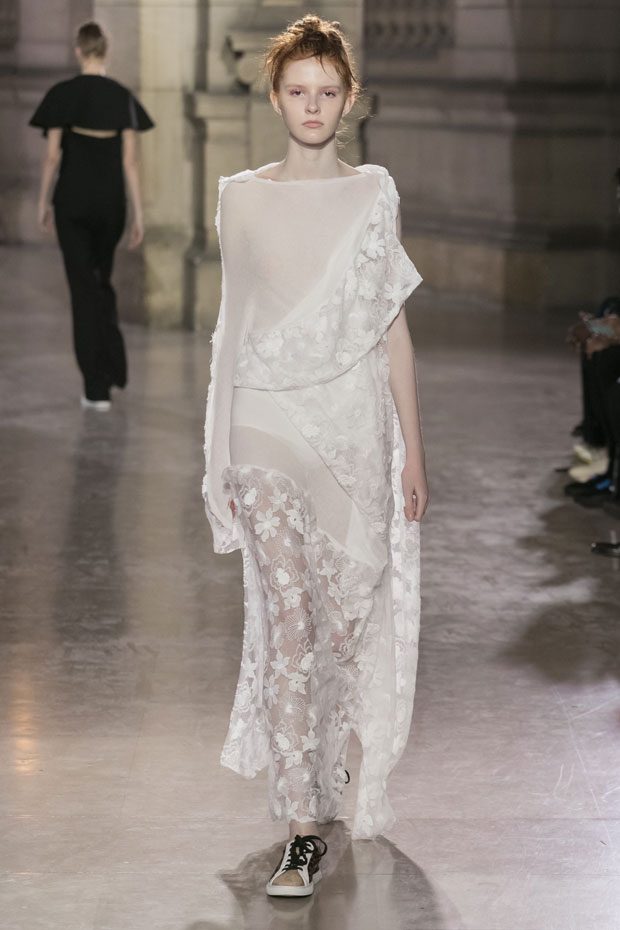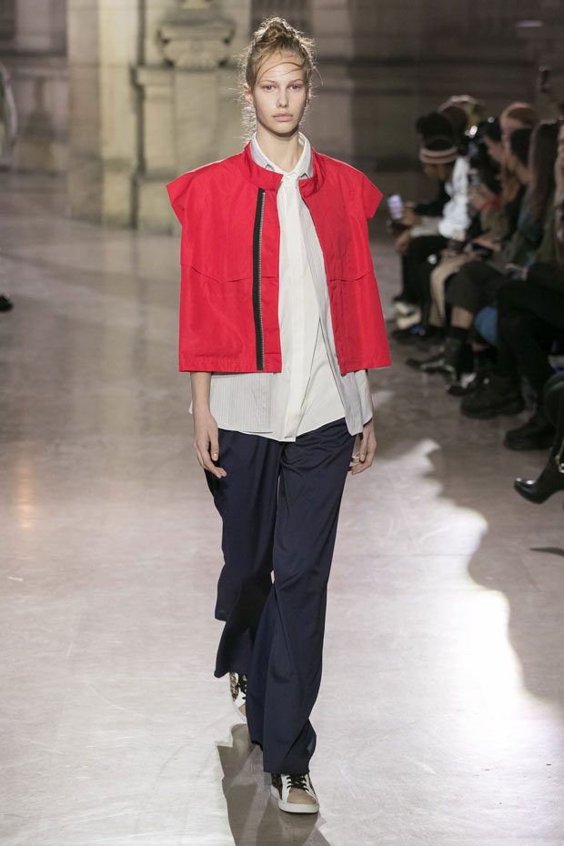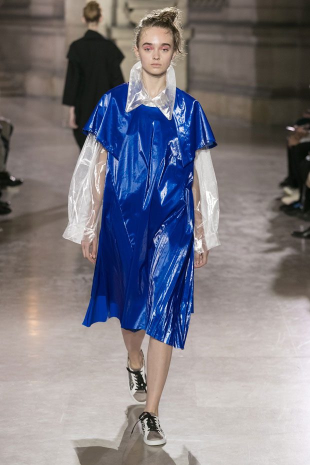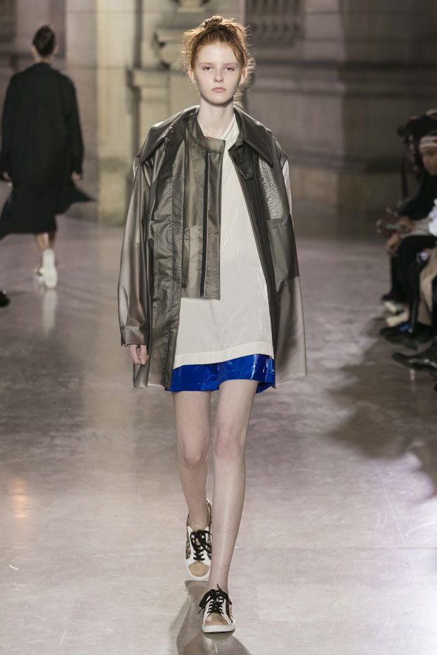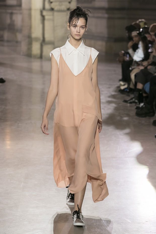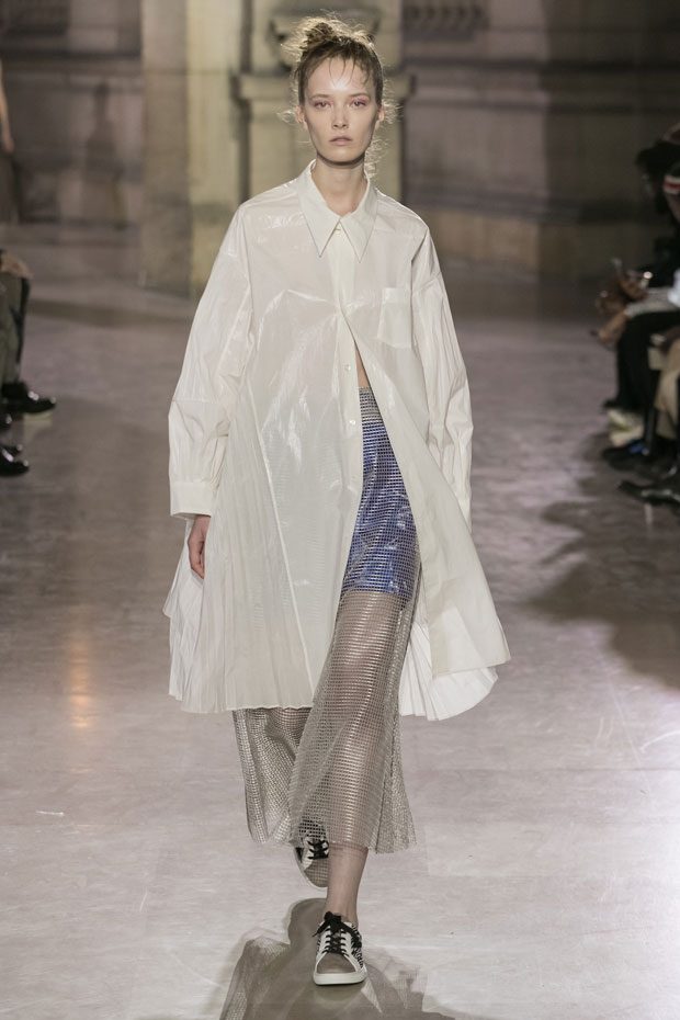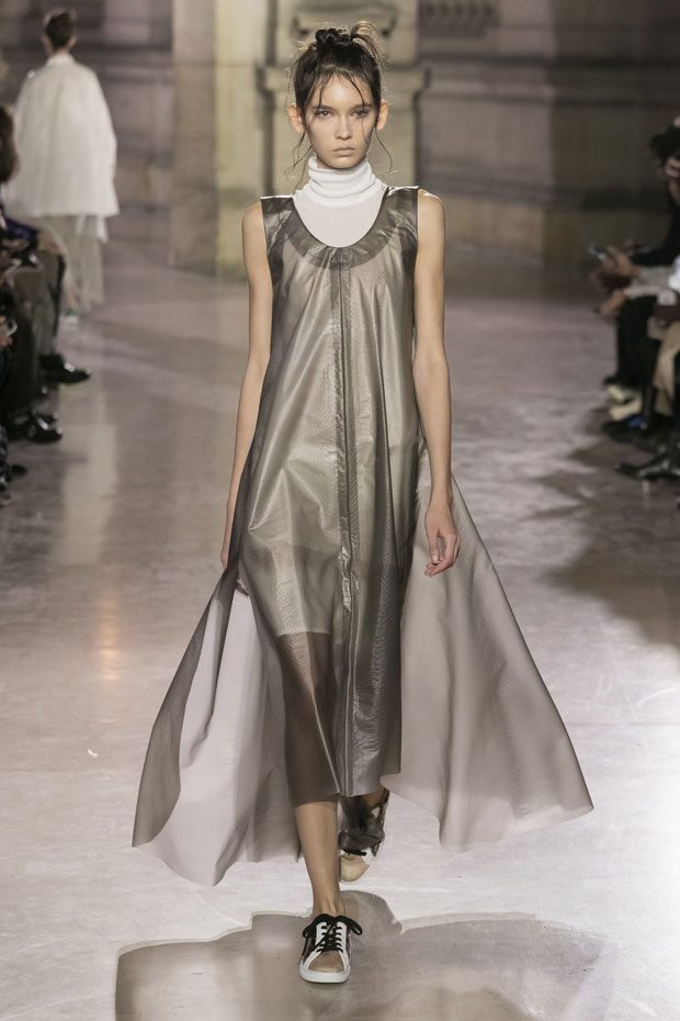 Discover Moon Young Hee Spring Summer 2019 Collection, presented during the last day of recently finished Paris Fashion Week. Combining the technic materials and asymmetric cuts, the collection features soft color palette infused with shades of red, yellow and metallics.