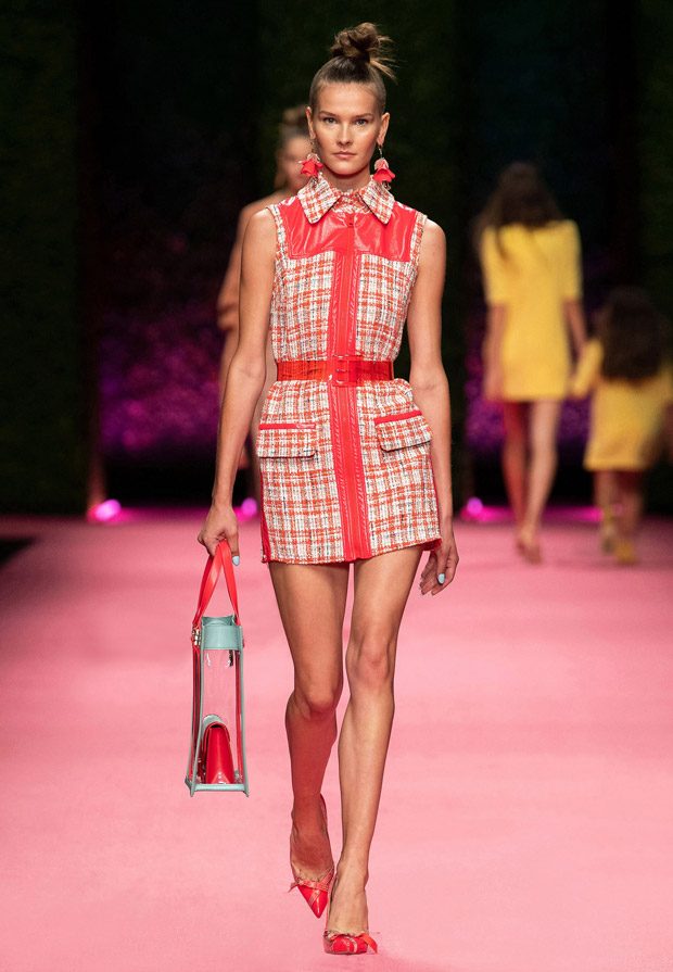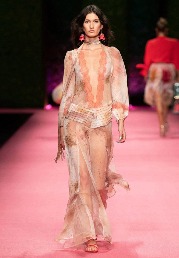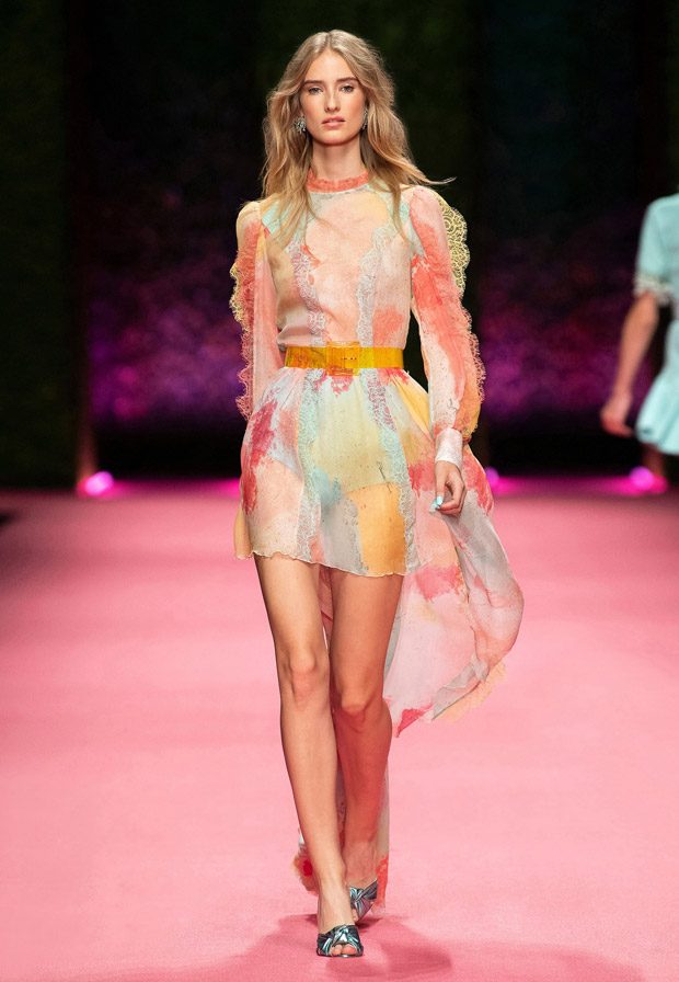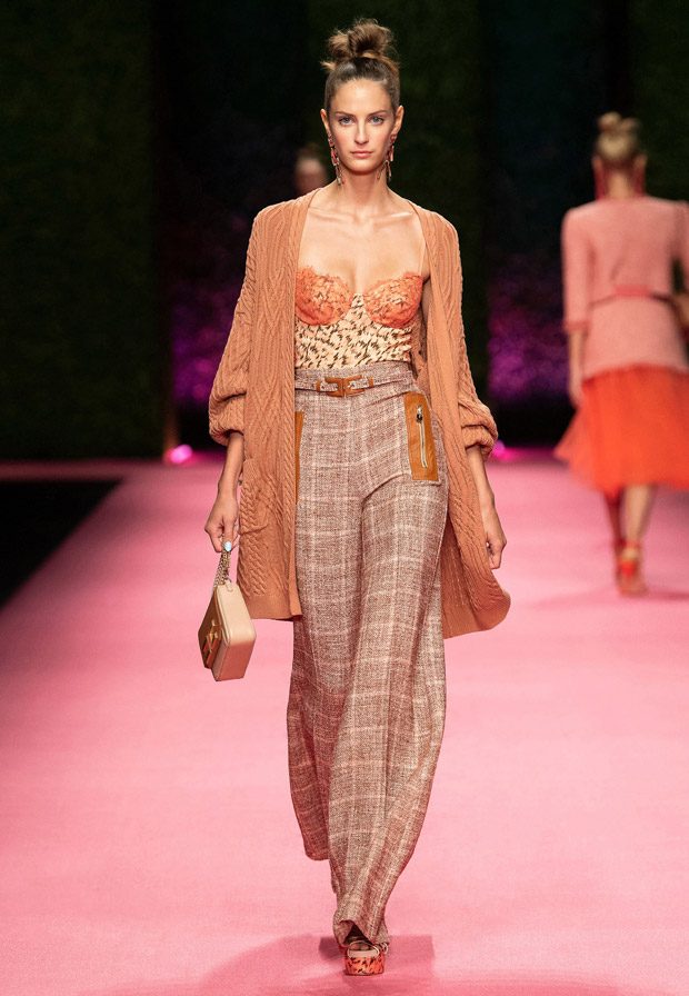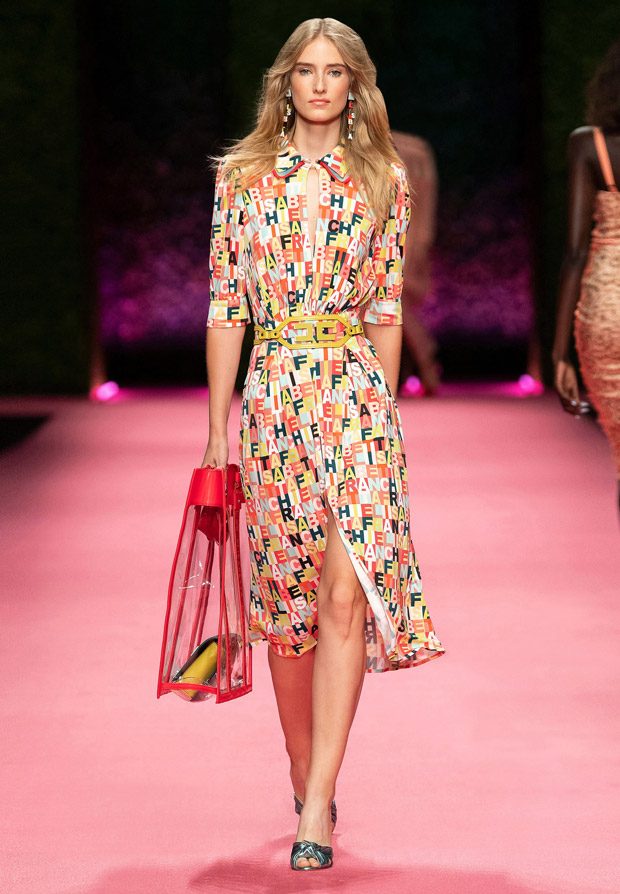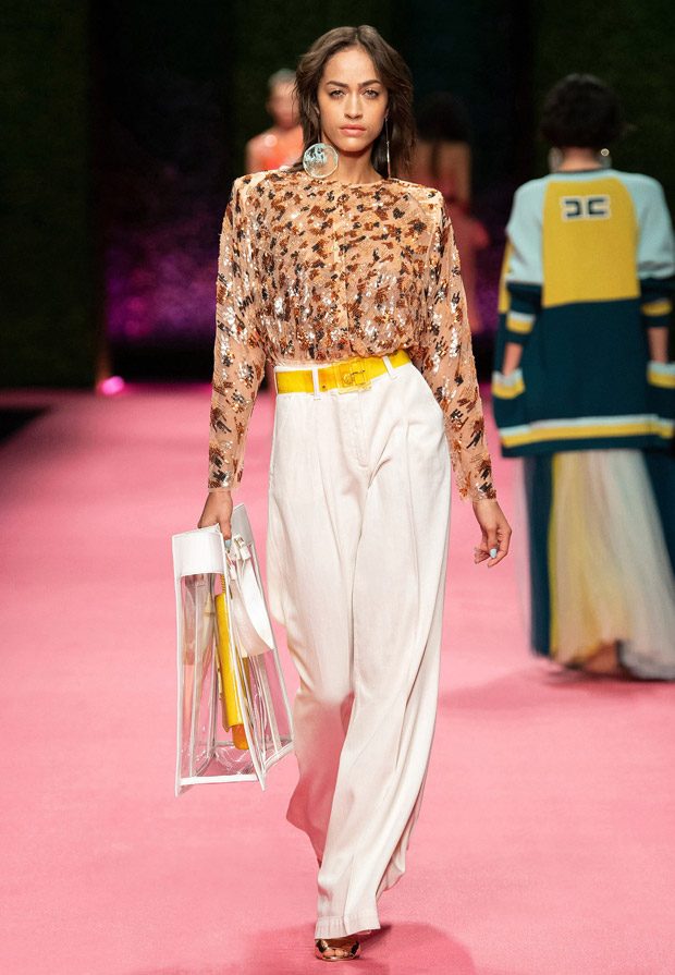 For Spring Summer 2019, ELISABETTA FRANCHI, is making dreams come true for her customers: her wearer, that prefers to dress in glamorous and sophisticated pieces, is moving in a totally new dimension where time and space does not exist. Thus, she is wearing the creations of her dreams and is making her own visions come true. Therefore the borders from reality and surreal moments are creatively blurred and this game is highly inspiring to observe. In her dream reality, everything you can imagine becomes real: for instance traditional elements are presented in unconventional and unique shapes. Prints remind us of romantically coloured skies with soft reflections. These light reflections are enhanced by a bunch of plastic materials that team up with the fabrics of this collection. That unique pairing is interesting to observe and underlines the unique approach of these pieces!