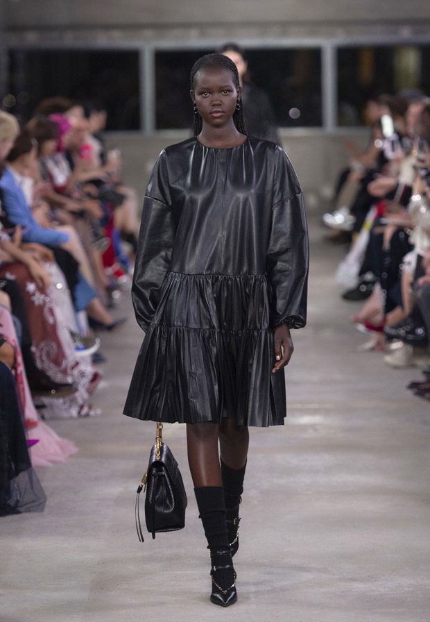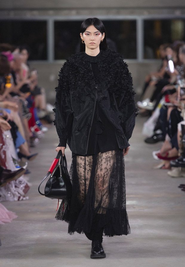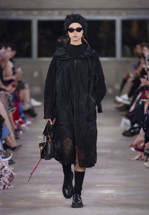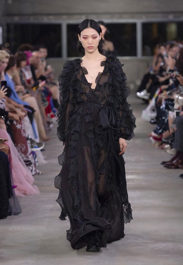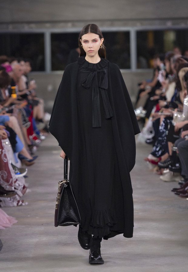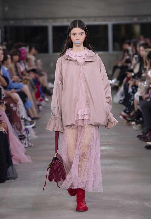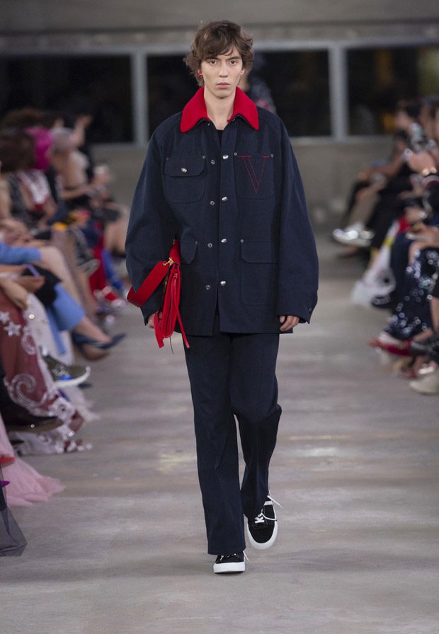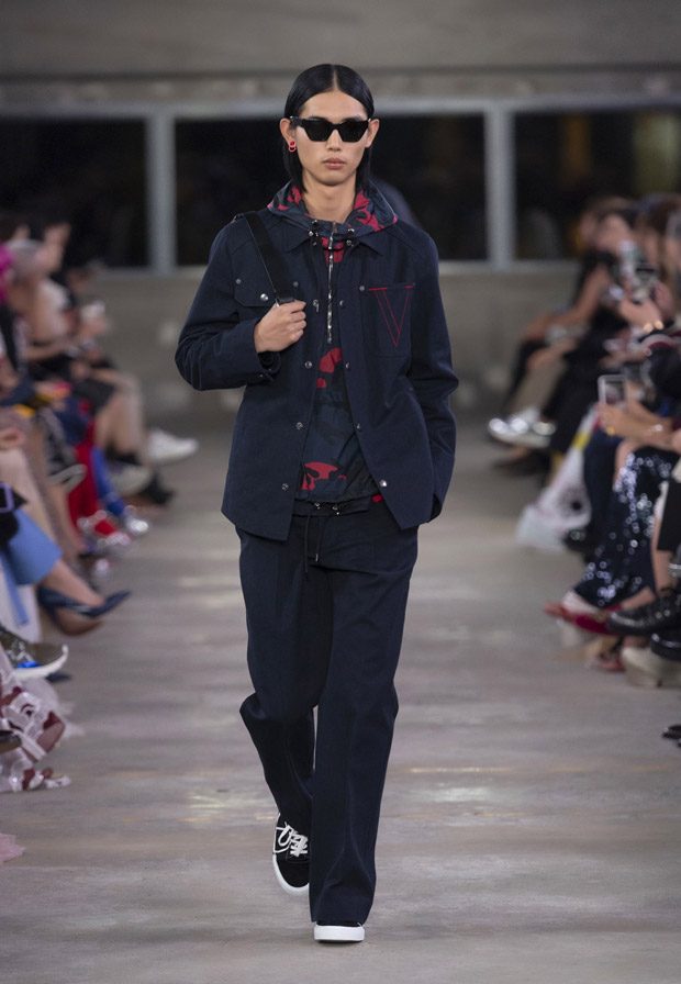 The iconography of the Maison – the ruffles, the lace, the grace, and then the flowers, the colors, the motifs – is interpreted in a wabi sabi key. Volumes are purified, ruffles are crushed, pleats are misaligned. Black and red are splashed onto prints, the V logo marks allover. Familiar signs are transposed and seen anew. Change is in the point of view: a quest for imperfect perfection. The code becomes inclusive, keeping the street as the horizon.