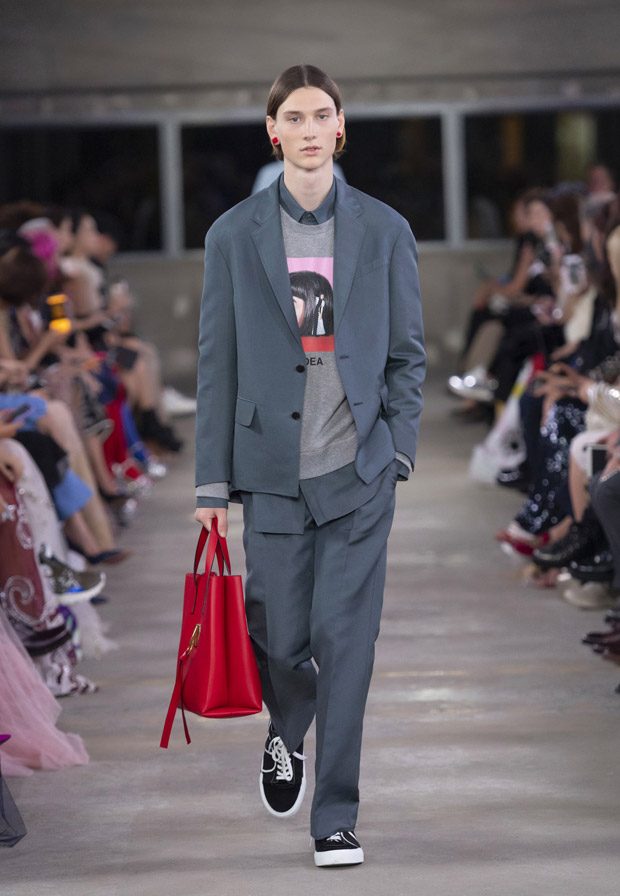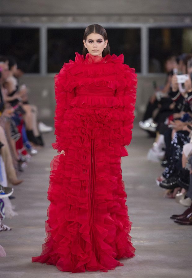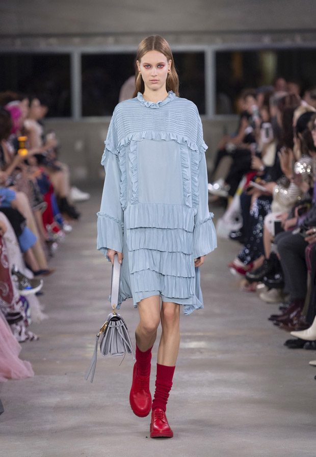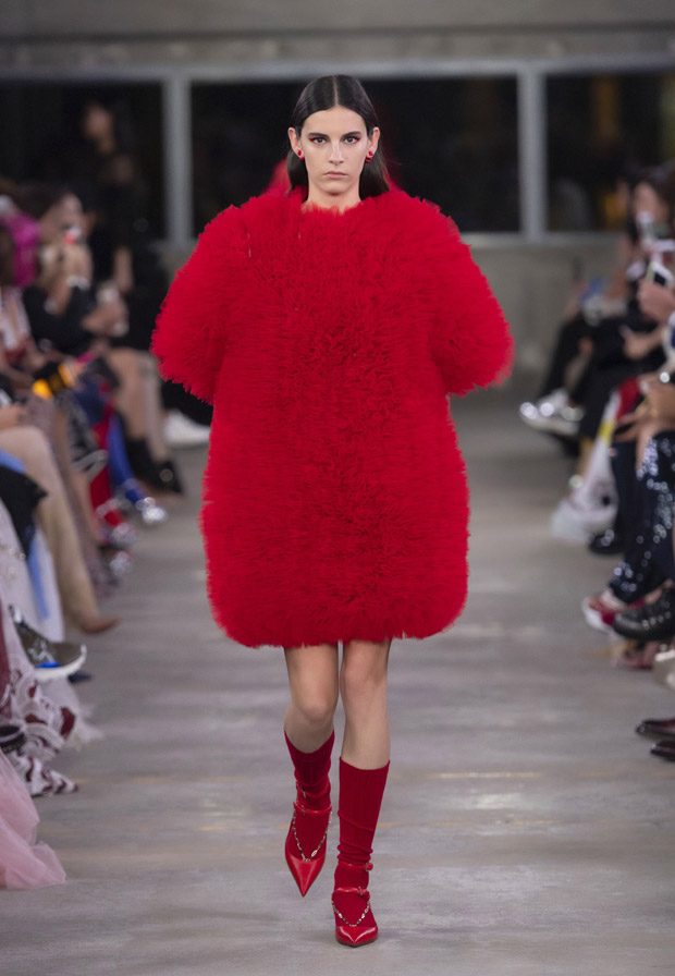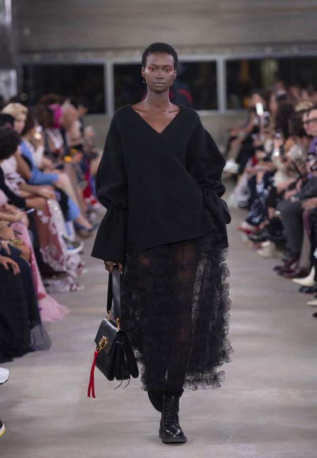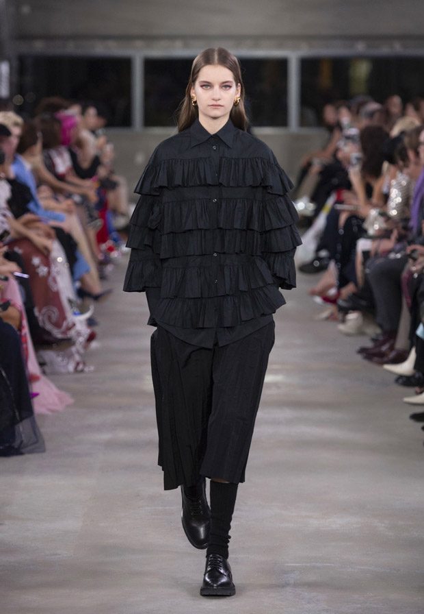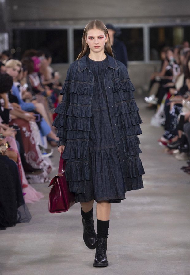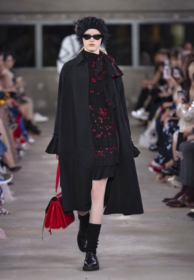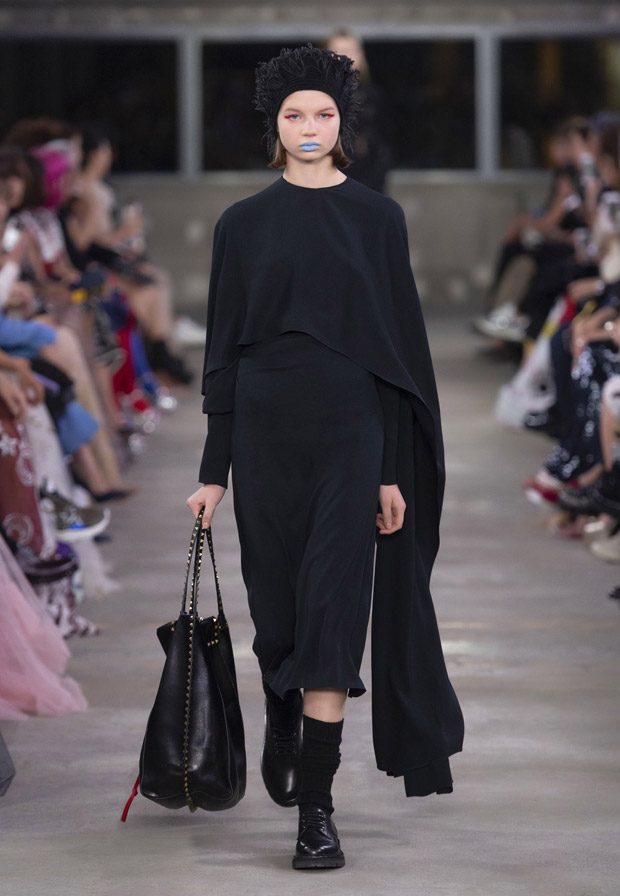 The iconography of the Maison – the ruffles, the lace, the grace, and then the flowers, the colors, the motifs – is interpreted in a wabi sabi key. Volumes are purified, ruffles are crushed, pleats are misaligned. Black and red are splashed onto prints, the V logo marks allover. Familiar signs are transposed and seen anew. Change is in the point of view: a quest for imperfect perfection. The code becomes inclusive, keeping the street as the horizon.