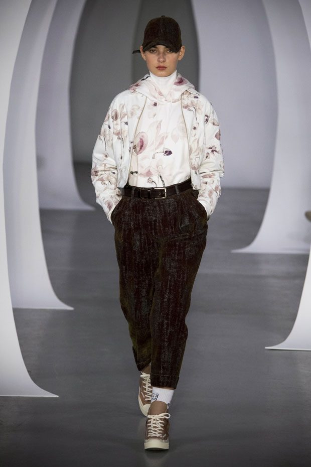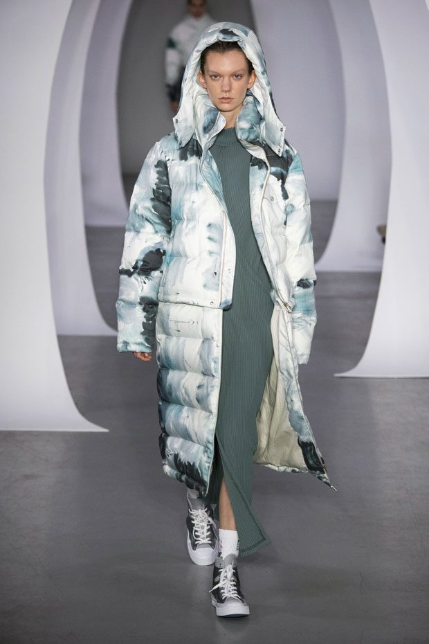 Feng Chen Wang was born in China’s Fujian province and – despite the country’s one-child policy, then still in effect – grew up in the company of two siblings. One brother, one sister. One, two, three. Life for Feng and her larger-than-allowed family was not always easy. Among other challenges, her mother was often forced to hide during her pregnancy, sometimes by submerging herself in the local river. And it’s this story, these trials, that Feng explores for Autumn/Winter 2019. Feng’s mother is represented by the lotus, a symbol not only of the holy seat of Buddha, but of perfection and purity – the flower rises from the mud and blooms in exquisite beauty, just like her mother emerged from the river and brought life into the world. The lotus lends more than symbolism to the clothes, though: the flower’s delicate layered petals are echoed in the garments, which contain hidden colours and compartments. Feng’s personal history and Chinese heritage permeate this collection: from the lotus flower and the ‘???’ symbols, to the painting with brush strokes – a traditional art form and the designer’s first creative outlet – which appears as prints. Three renderings, completed by Feng herself, depict her and her siblings, bound together in love. Feng’s story, and indeed the lotus flower, are a reminder that great beauty can rise from the mud of this life. It’s a reminder that’s needed as much as ever. – from the designer