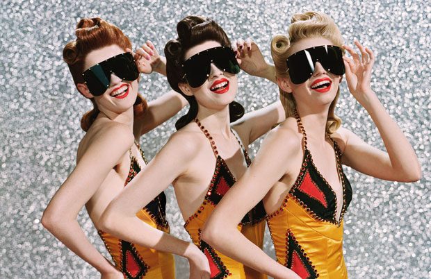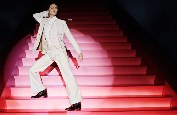 In imagery that recalls the technicolour, on-screen theatricality of the song and dance numbers made famous by talented performers, this campaign delivers maximum glitz and glamour. Colourful sets with grand stages and staircases alternate with more surreal dream sequence backdrops. The mood is playful, knowing and evokes the joyful outlook of the famous musical films of the 40s and 50s. In another set of photographs, Gucci mimics the highly stylised black and white publicity stills created by the studios at the time to promote their stars as perfect role models. A variety of characters from Gucci’s musical are given the silver screen treatment and shot in black and white with dramatic lighting in the style of the many famous movie star portraits in the 30s and 40s. Like those of the period, these pictures exude cool, elegant glamour. – from Gucci