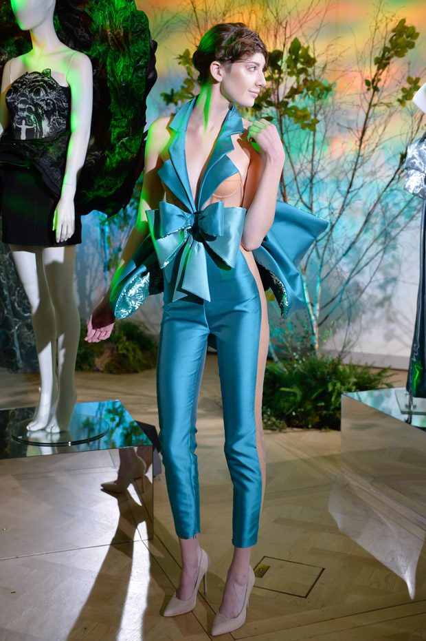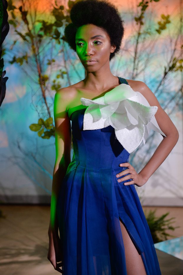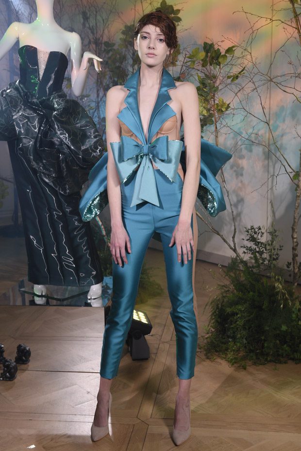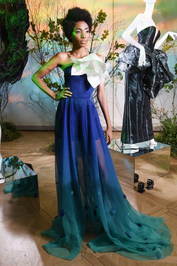 This collection also sees sculptural 3D moulage snowdrop flower décolletés in tandem with the Maison’s signature diamond silhouette in a new deconstructed version, floaty princess cut skirts, silhouette-accentuating tuxedo gowns and playsuits with cone-shaped sides. Recovered fabrics, reused materials and recycled plastic, juxtaposed with precious and semiprecious stones, campaign the Creative Director’s concerns towards waste and pollution, as well as global warming.” – Gyunel Couture