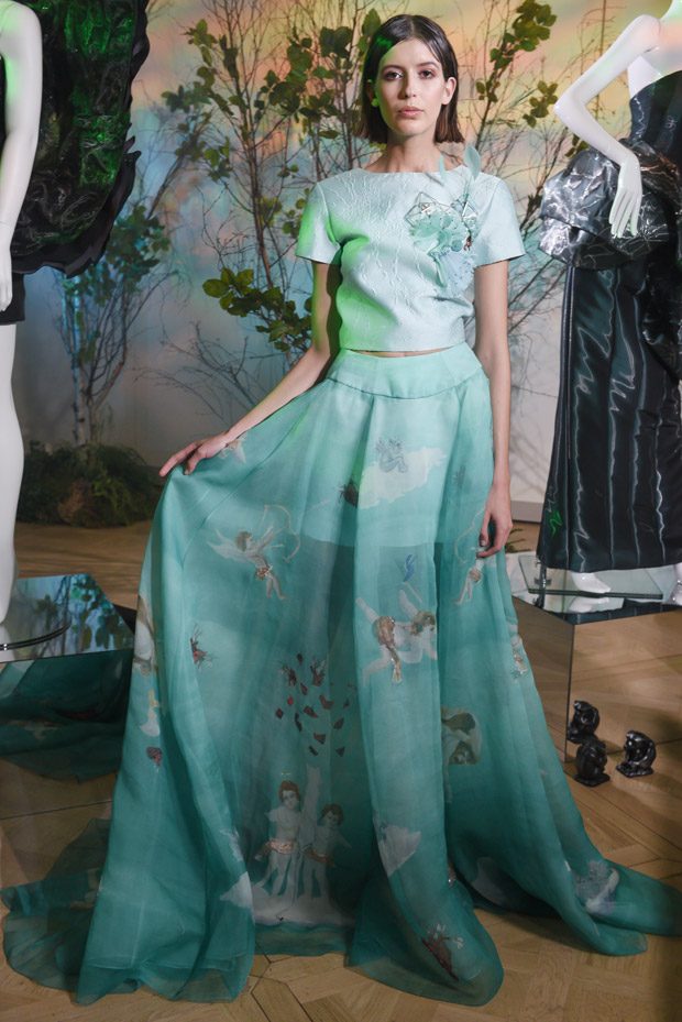“Created during the 16th century and situated in a wooded valley beneath the castle of Orsini, the garden is populated by grotesque sculptures and small buildings scattered among the natural vegetation that immediately captured Gyunel’s attention. As a result, the colours this season consist of forest greens, metallic silvers, burgundy reds, and navy-cobalt-teal contrasts. Further inspiration was taken by the envisioning of forest queens and nymph-like creatures entangled in a night feast away from city lights. Bomarzo’s Orcus, gargoyles among cherubs and cupids blowing away hearts taken from Gyunel’s watercolour paintings, alongside her autograph autumn snowdrop variations in ombre dominate this latest print theme, whereas raised-texture jacquards, feather-shaped lurex pleats and metallic flower weaves on liquid organza are the season’s highlight fabrics.