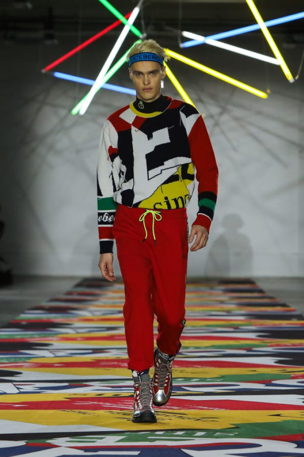 Logo ski flag shapes in danger zone primaries are puzzled together with black to form sweaters. A blizzard of crazy puzzle graphics slice across a classic twill shirt layered over sleek polo necks topped with roomy, glossy parkas. A new punk-grunge graffiti logo peaks across knit hoodies and zip jackets. ICEBERG red coats, high-vis acid green full looks and slashed logo sweaters mean you will always stand out on the slopes or the street. Deep purple, a new colour for ICEBERG men, crops up as a velour tracksuit kept cosy under teal blue jackets or zips over a luxury ice hockey shirt. Après ski ICEBERG men and women are offered sporty yet sophisticated alternatives with women in sparkling sequins drifting over jacquards, jackets and 2 piece sets and men in snow-tipped navy polo shirts worn with matching joggers, a new coat shape is tailored in high sheen wool and knit is inserted into soft leathers. – from ICEBERG