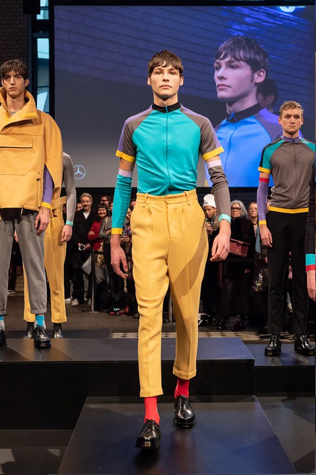 Ivan Mandzucik, who is originally from Serbia, but based for a long time in Berlin, presented his menswear collection on the 16th of January 2019. The designer founded IVANMAN in 2010 and is, since then, known for his authentic look, classic silhouettes, creative details and geometrical pattern choice. With this line, he stayed true to his significant style, that is known for a highly interesting mix of avantgardistic elements with classy ones, but added sundry new, inspiring inspirations. All creations of this charming collection stay incredibly wearable and are the perfect addition for a bunch of everyday occasions. Contrary elements are often harmoniously united in one look: for instance very sharp lines team up with bold colours or even over- sized tendencies. Sporty inspirations clearly shine through, for example some pieces we know mainly from running- and bycicle racing. These creations are paired with rather severe, serious ones: it is all about contrasts!