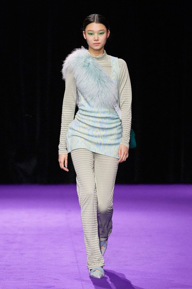 “Today they number in the millions, and the diffusion of Asian traditions throughout South America is a palpable force. This rich and colorful exchange of stories mixes with the contemporary realities of alpine life, as extreme conditions see both men and women layering bright, ethnic textiles with modern tactical garments. In our interpretation, the drama of the Andean colour palette (from Cusco to Machu Picchu) meets piles of fuzzy texture and a touch of Parisian sophistication. Couched in the Ayahuasca dreamscape show set by the artist Pablo Amaringo, this collection invokes discovery and exploration through mind, body, and spirit.