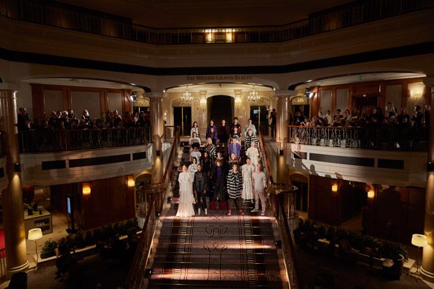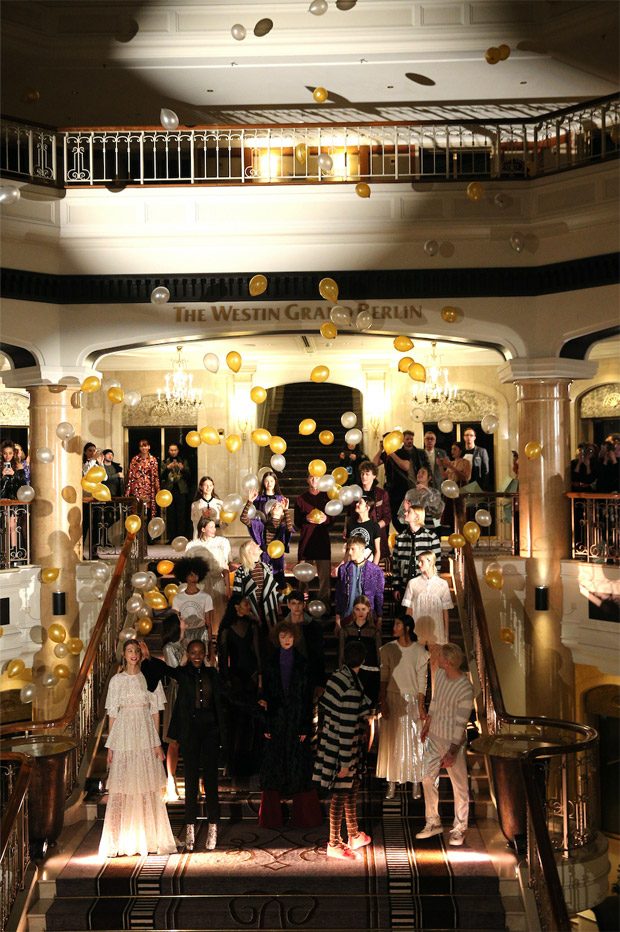 For his 25th anniversary collection “Heroes“, German designer Marcel Ostertag choose an incredibly glamorous location: The Hotel Westin Grand, which is located in the heart of Berlin. This endlessly elegant hotel underlined the festive atmosphere of this compelling collection. When balloons were falling down the ceiling at the end, we knew we witnessed an unforgettable evening.