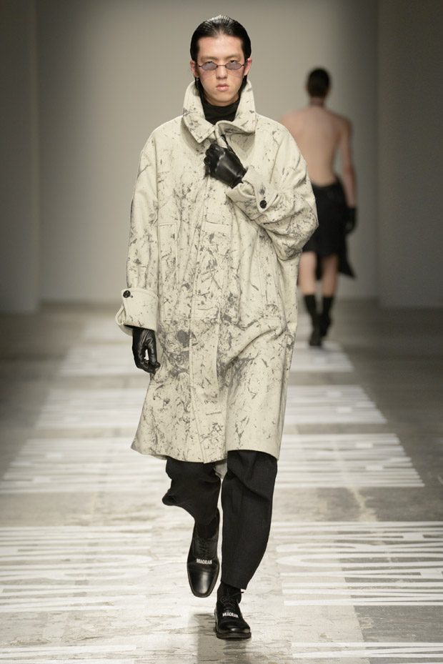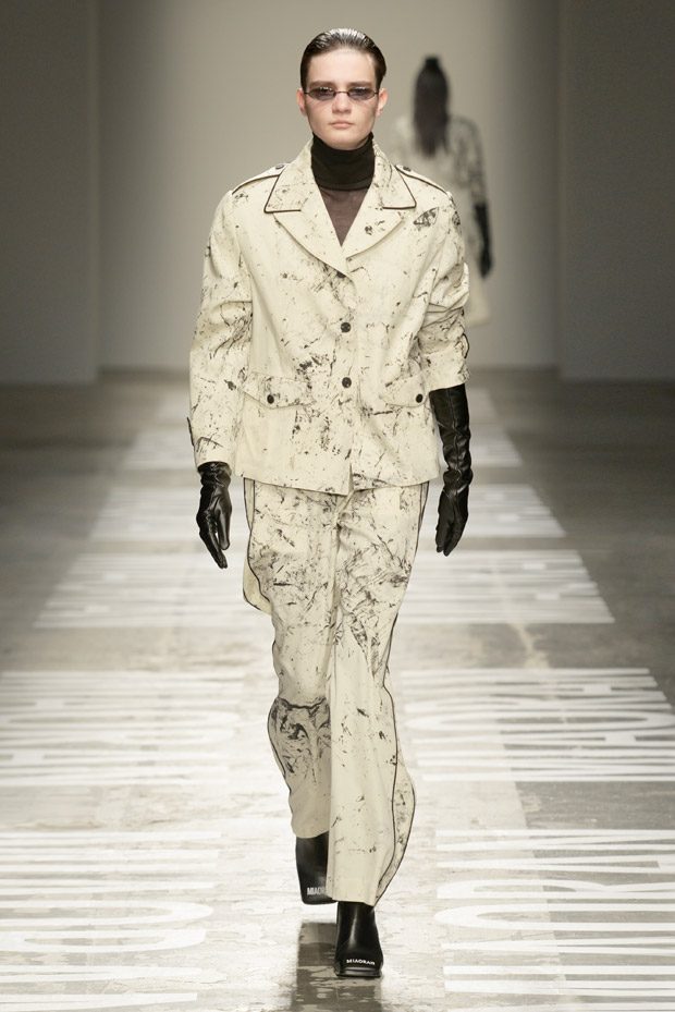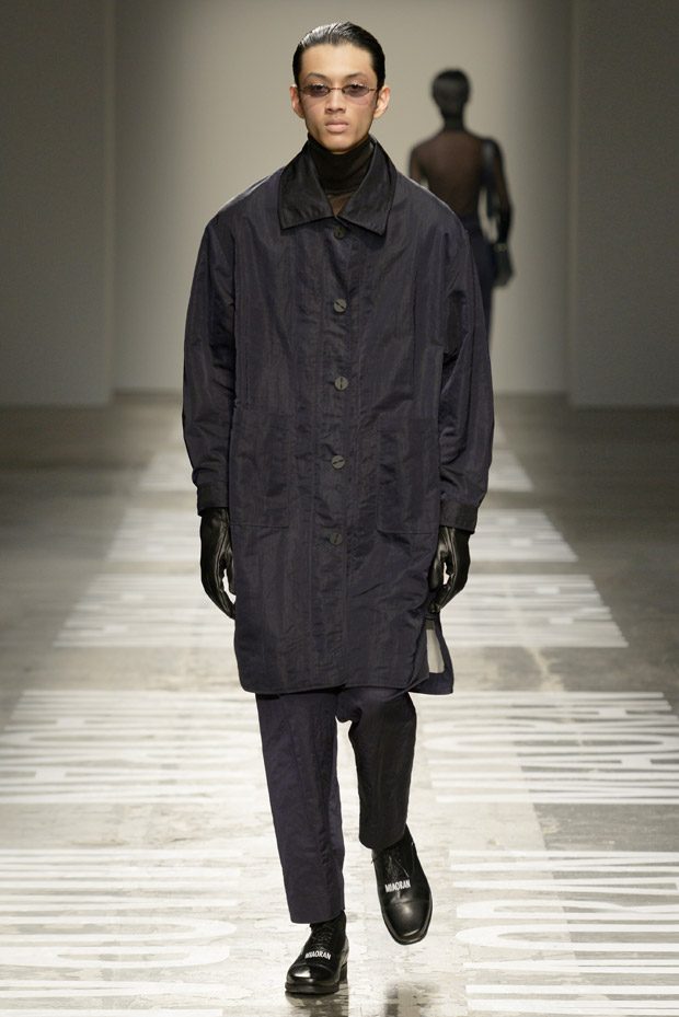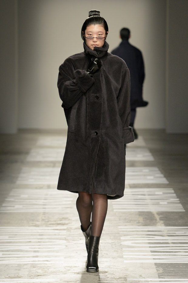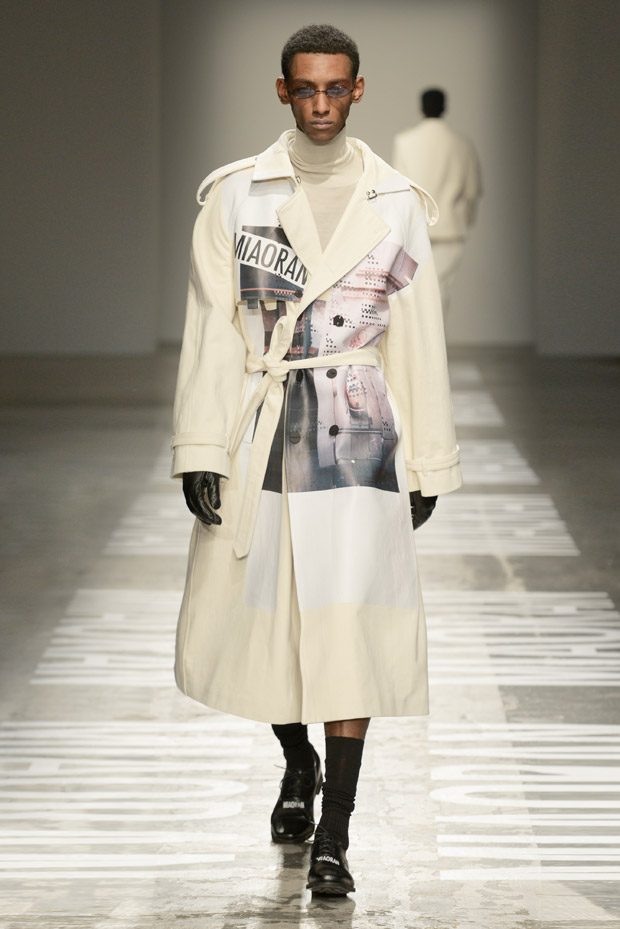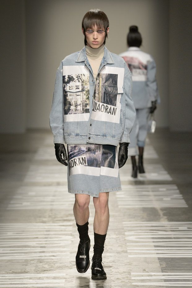 “Photos taken on casual strolls around the city are blown up and film printed onto clothes, while Chinese motifs are printed on the inside, or turned into macro jacquards on knits. Washed denim in big shapes provides a workwear tingle. Milan’s smog leaves a dusty patina over coats as the familiar is subverted playing with proportions and textures.