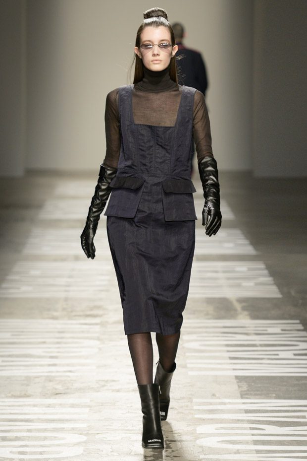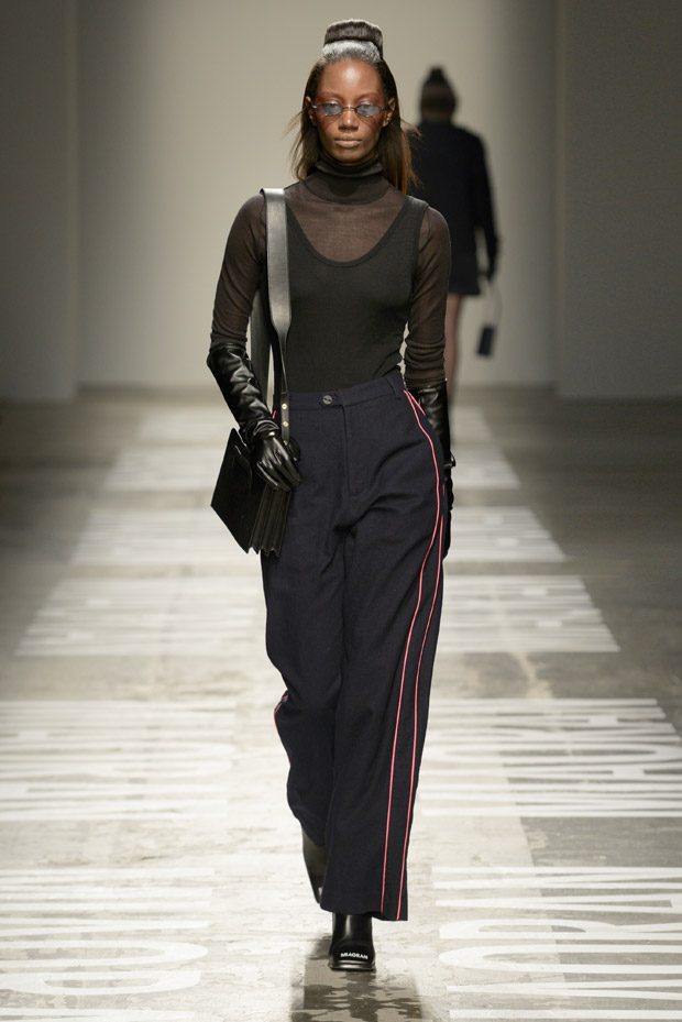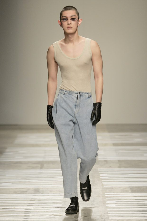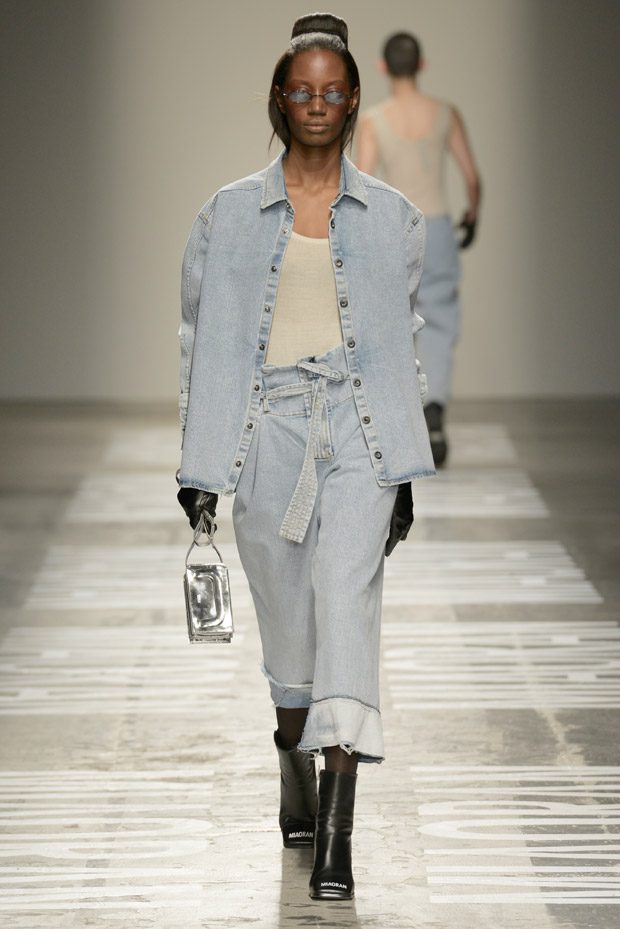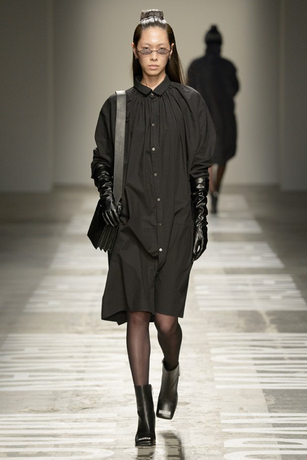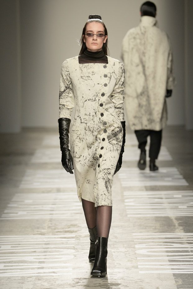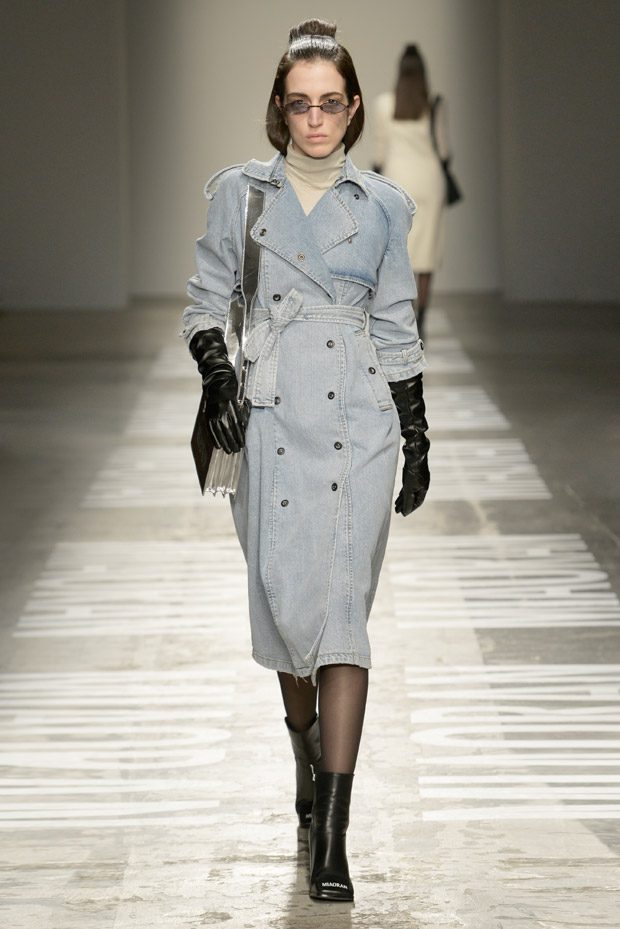 “Photos taken on casual strolls around the city are blown up and film printed onto clothes, while Chinese motifs are printed on the inside, or turned into macro jacquards on knits. Washed denim in big shapes provides a workwear tingle. Milan’s smog leaves a dusty patina over coats as the familiar is subverted playing with proportions and textures.