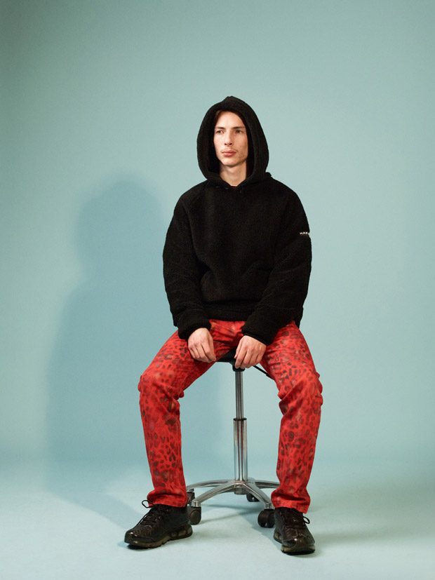“The collection is for those who don’t take themselves too seriously. Accessories for AW19 are bold and playful, outdoor dry bags have been reimagined, padded like puffa jackets and offered in red, yellow, black and leopard print. Alongisde faux fur hats are reminiscent of the 1990’s style of the lead singer of Jamiroquai.