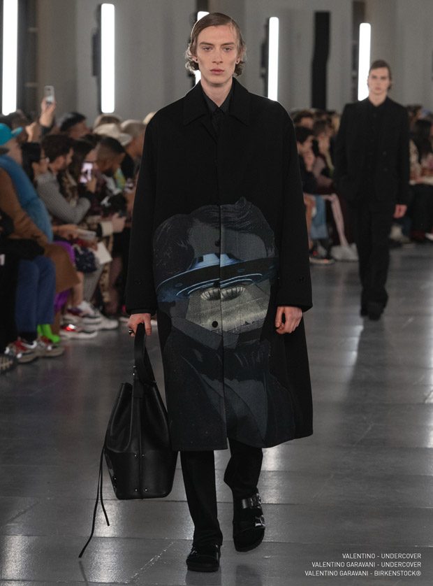 Bringing the street’s attitude in the Atelier, enhancing the tension between opposites in order to find with ease a contemporary emblem. The language of Couture is stained to become more genuine, opening itself to alien but at the same time authentic elements. Valentino in collaboration with Birkenstock: a universal sign that has been universally adopted and included in the repertoire of the Maison. Valentino in collaboration with Undercover: a dialogue with Jun Takahashi and his off way of looking to the street through graphics that go through times and styles, that are then reread in a Valentino key, with intarsias, embroideries, jacquards and prints, that multiply with a rhythm, that broadened, that condense.“