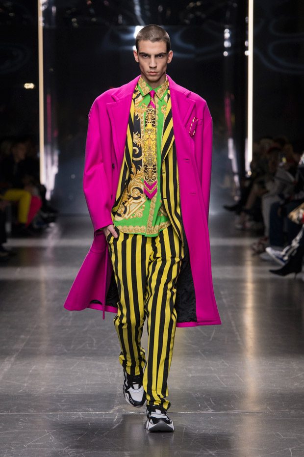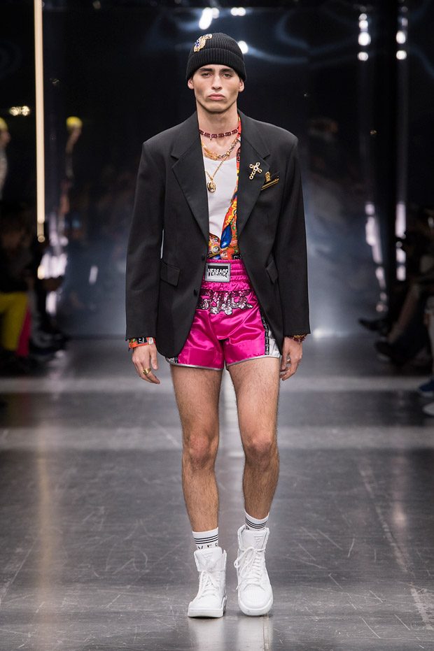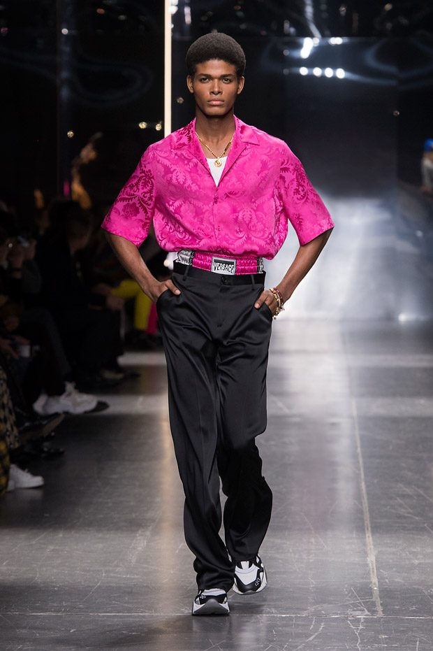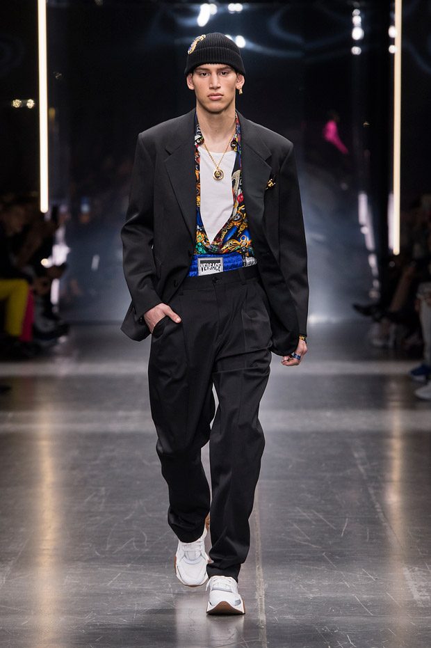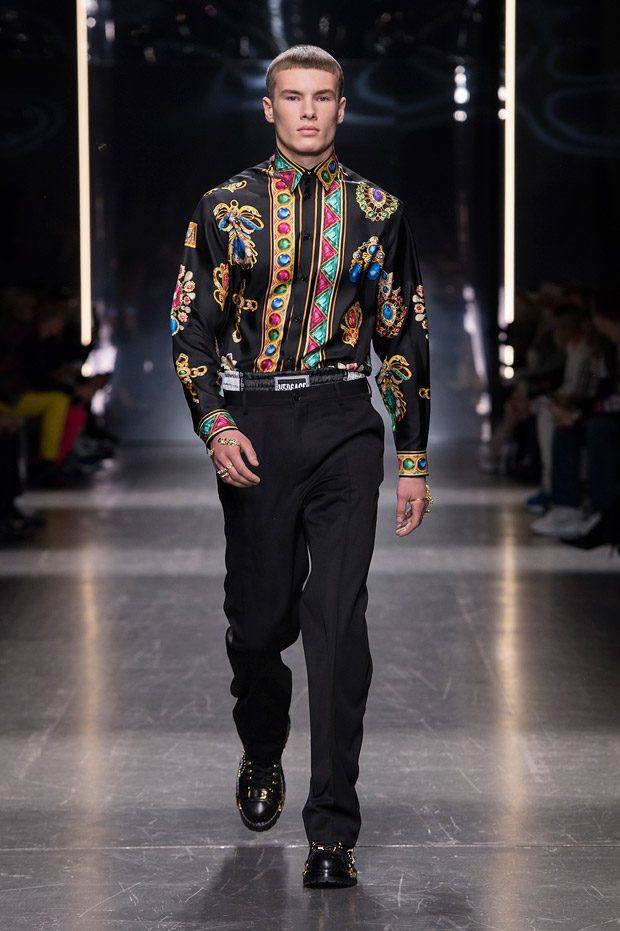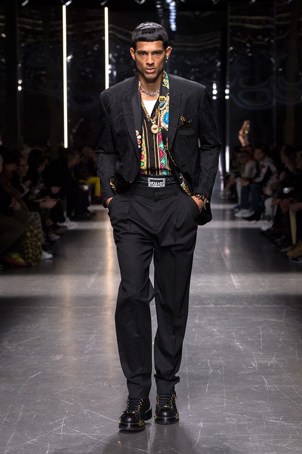“In the ‘90s there was such a specific idea of A man but, since then, fashion has evolved dramatically and today one cannot define men in just that same, clear way. Everything has changed, and today’s society allows everyone a greater freedom to express themselves with their clothes as well as with their actions. What I wanted to show in this collection are the different facets of a man, who, like everyone, dresses according to the occasion and has gained the courage that he didn’t have before. If I had to find a word that defines today’s men, it would be daring.” – Donatella Versace