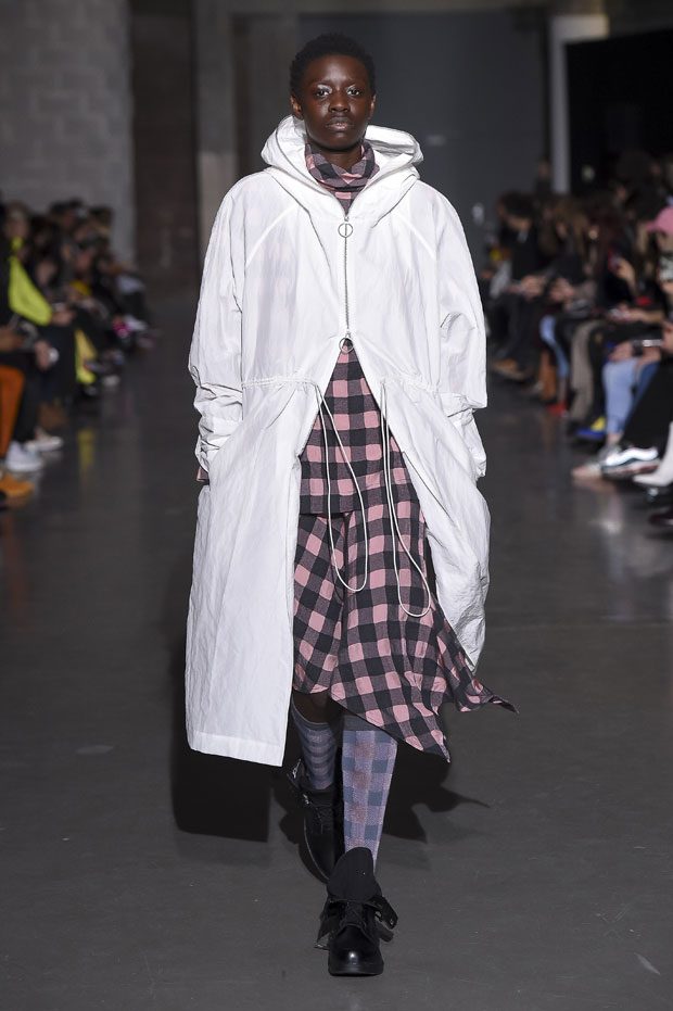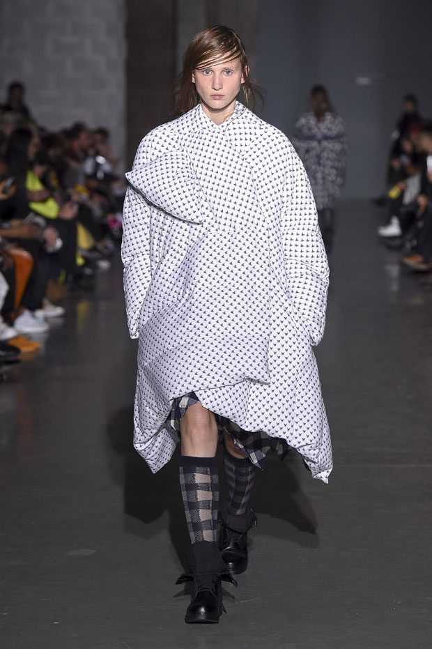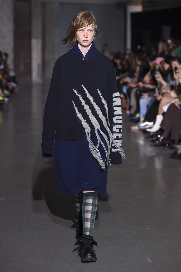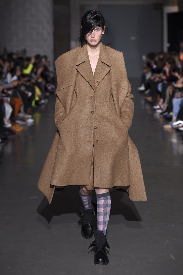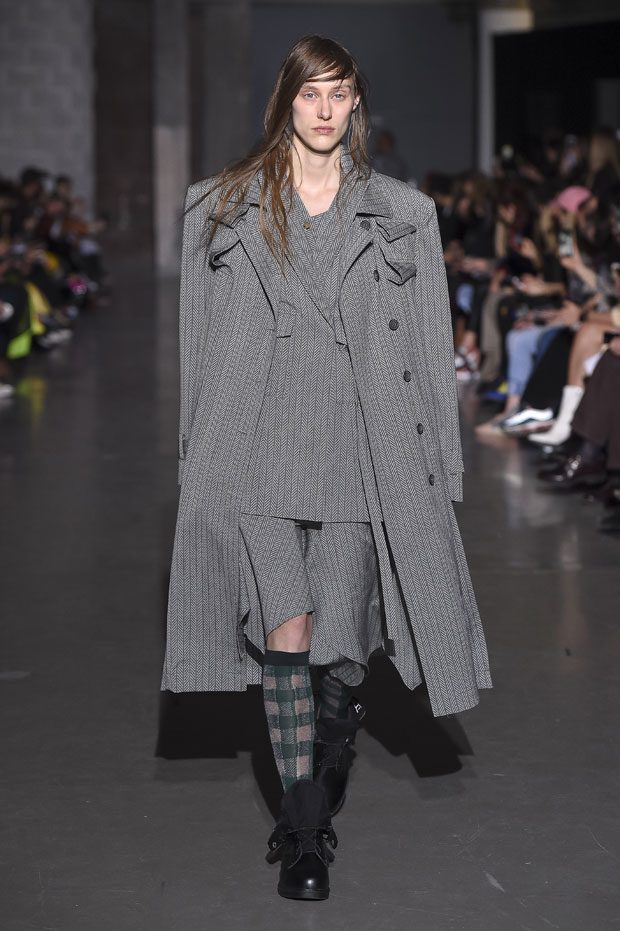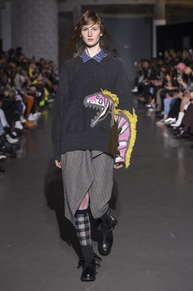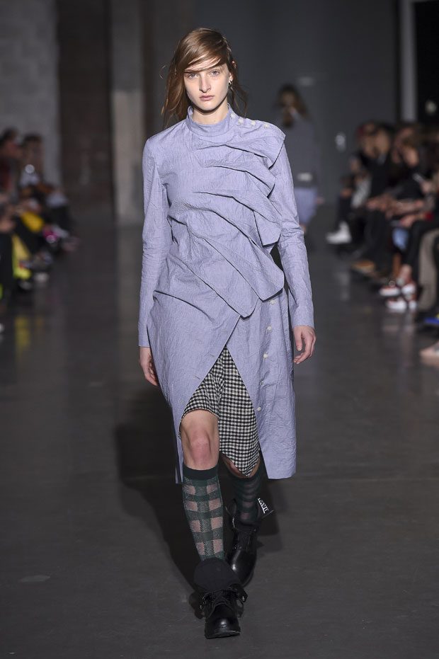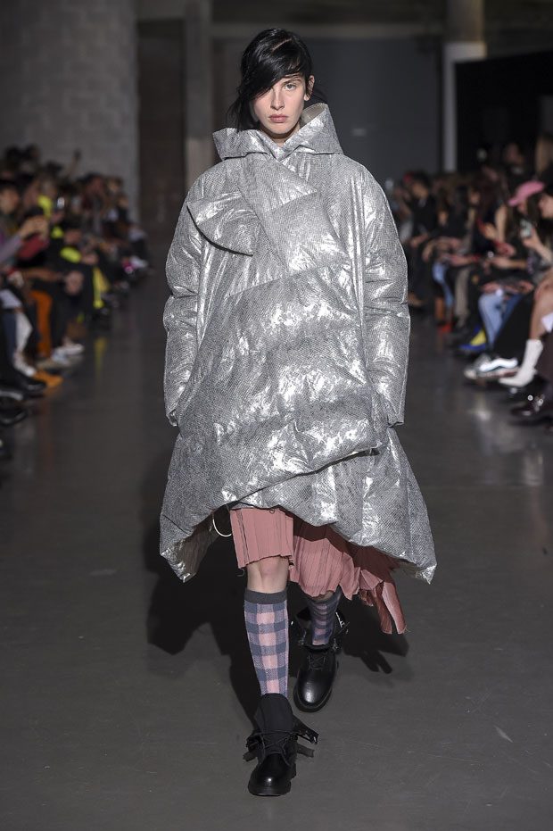Dangerous animals are approaching, but there’s no need to be alarmed. Child like drawing dinosaurs came in ‘crazy’ fringes, and the ‘scary’ claw scratches are even cute in a way. Apart from the eye-catching knitwear and prints, dinosaurs are hidden in the silhouette, turning their spiky bones into asymmetrical ruffles and pleats. Loud and powerful, are not only to describe dinosaurs, but also the 80s vibe. DAWEI turned to the disco age of shoulder pads and shimmering fabrics, adding a nostalgia touch into his modern looks. DAWEI’s signature urban, minimal style are still playing the main role in the collection, with silk print total look, gingham halterneck dress, and winter staple wool coat, paired up with sporty high socks. – from Dawei