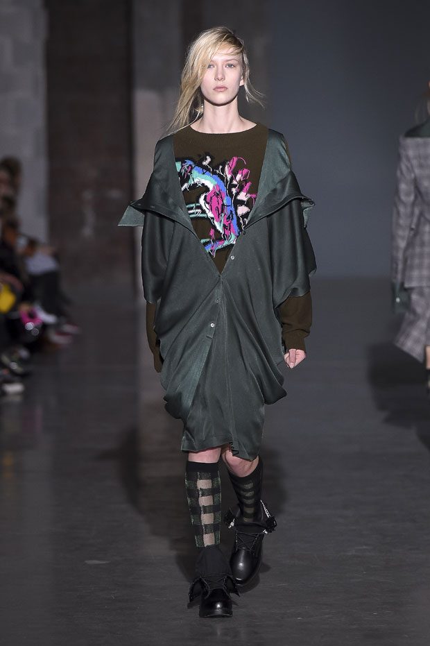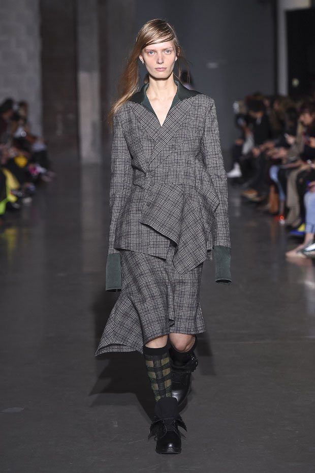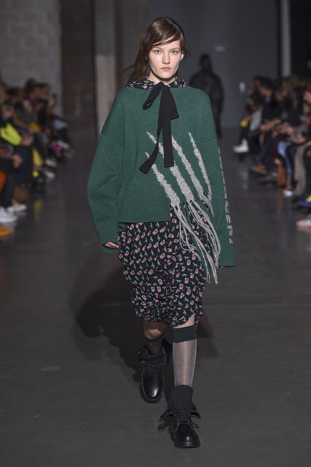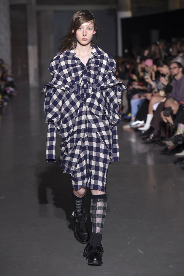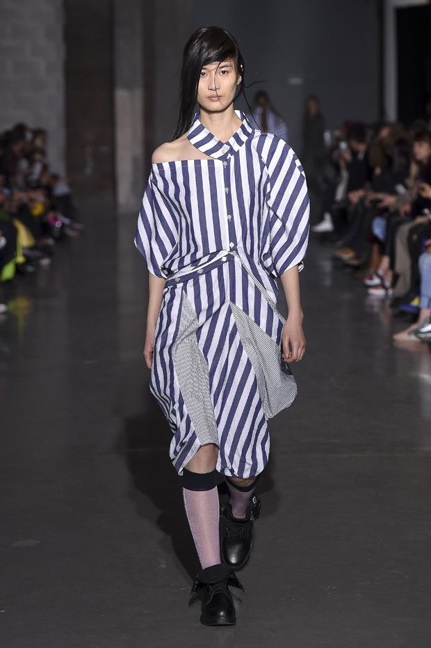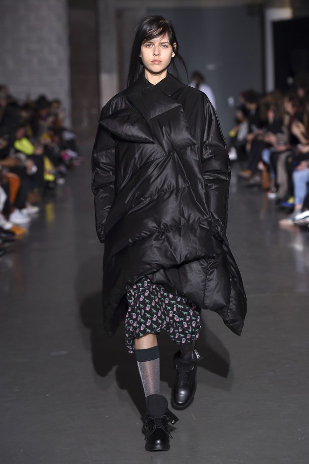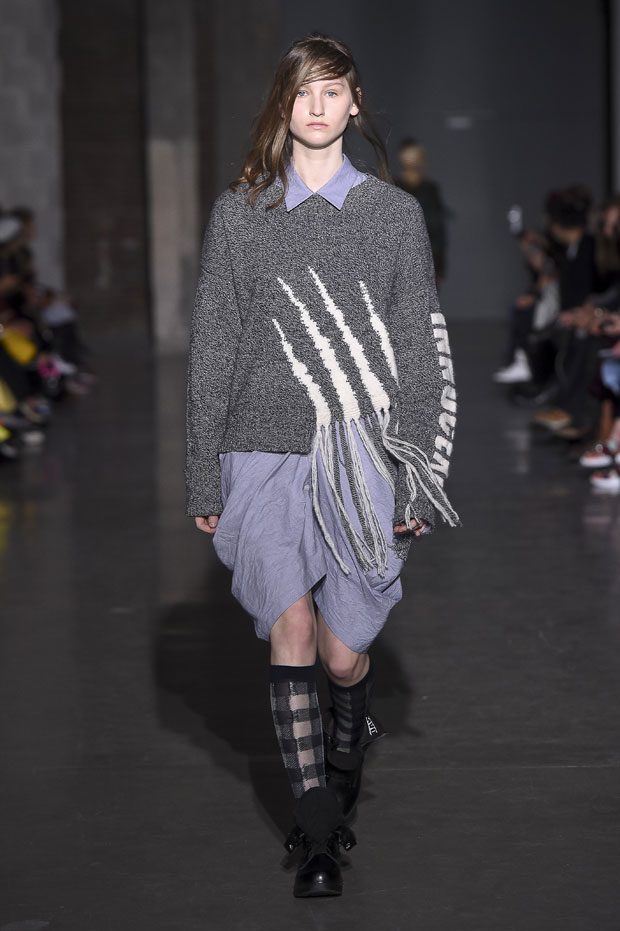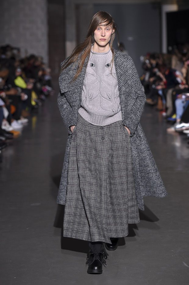 Dangerous animals are approaching, but there’s no need to be alarmed. Child like drawing dinosaurs came in ‘crazy’ fringes, and the ‘scary’ claw scratches are even cute in a way. Apart from the eye-catching knitwear and prints, dinosaurs are hidden in the silhouette, turning their spiky bones into asymmetrical ruffles and pleats. Loud and powerful, are not only to describe dinosaurs, but also the 80s vibe. DAWEI turned to the disco age of shoulder pads and shimmering fabrics, adding a nostalgia touch into his modern looks. DAWEI’s signature urban, minimal style are still playing the main role in the collection, with silk print total look, gingham halterneck dress, and winter staple wool coat, paired up with sporty high socks. – from Dawei