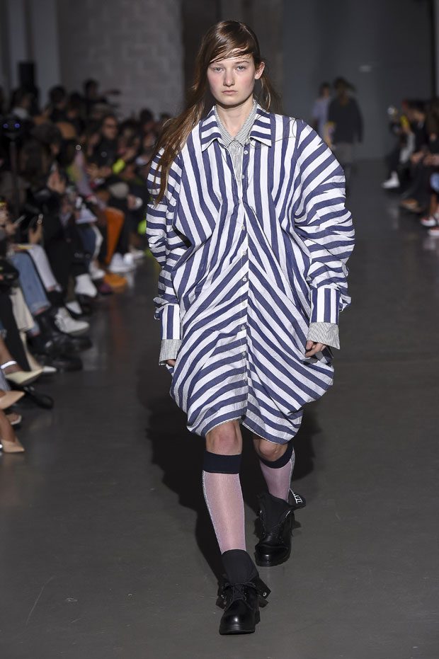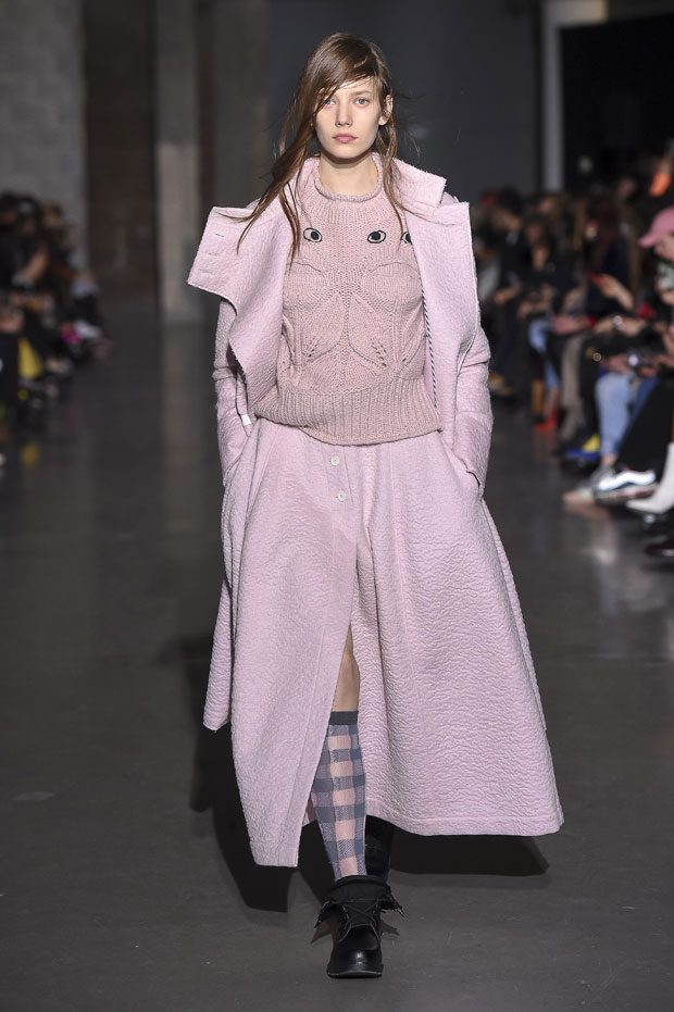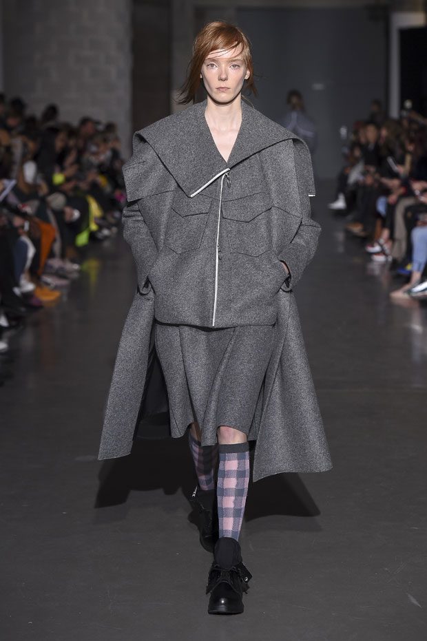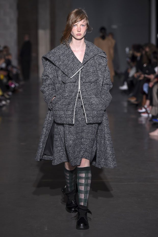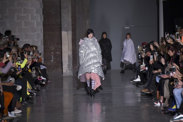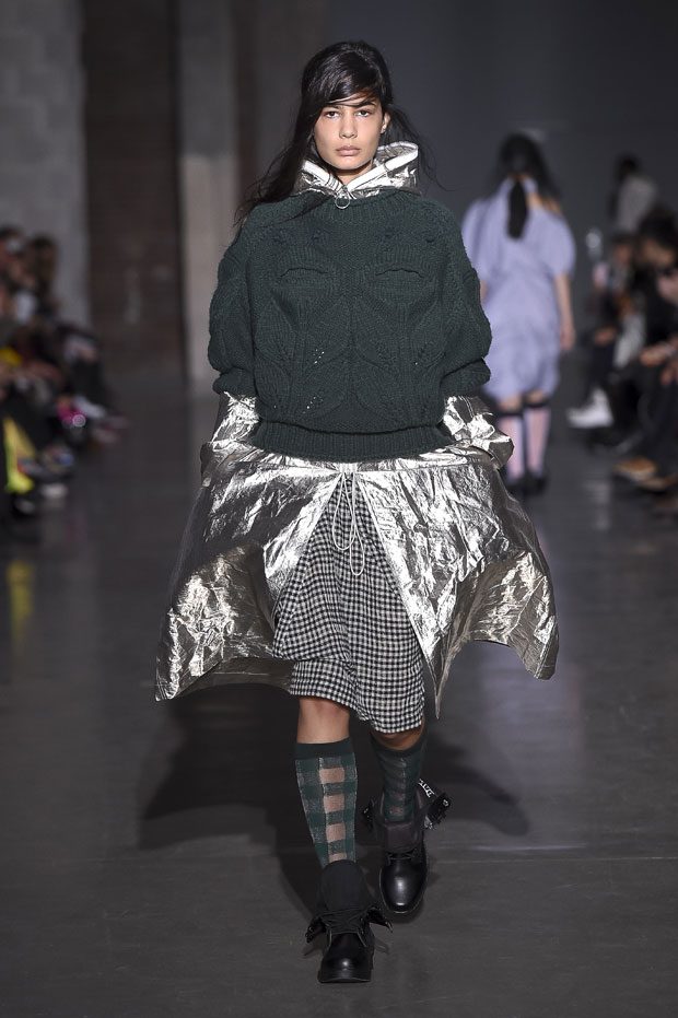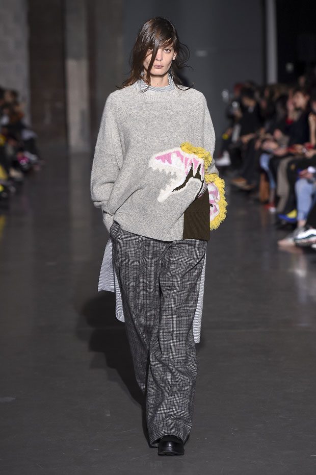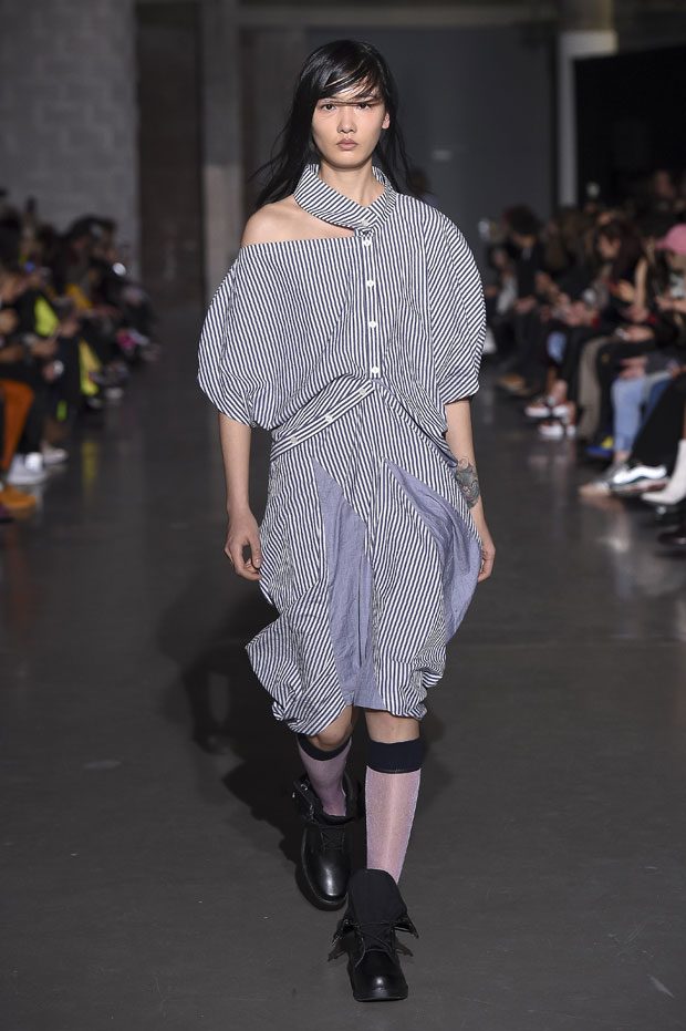 Dangerous animals are approaching, but there’s no need to be alarmed. Child like drawing dinosaurs came in ‘crazy’ fringes, and the ‘scary’ claw scratches are even cute in a way. Apart from the eye-catching knitwear and prints, dinosaurs are hidden in the silhouette, turning their spiky bones into asymmetrical ruffles and pleats. Loud and powerful, are not only to describe dinosaurs, but also the 80s vibe. DAWEI turned to the disco age of shoulder pads and shimmering fabrics, adding a nostalgia touch into his modern looks. DAWEI’s signature urban, minimal style are still playing the main role in the collection, with silk print total look, gingham halterneck dress, and winter staple wool coat, paired up with sporty high socks. – from Dawei