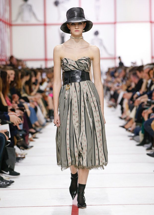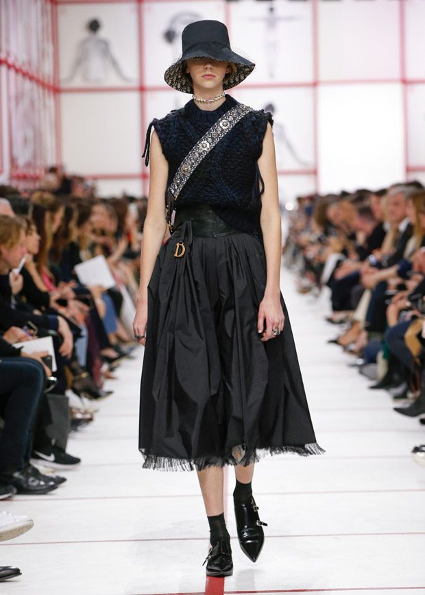 Fascinated by the mix of classicism and subversion, elegance and rebellion inherent in English culture, Christian Dior drew from it many sources of inspiration, as illustrated by the exhibition Christian Dior: Designer of Dreams, now at the Victoria & Albert Museum in London. One by one, Maria Grazia Chiuri reclaims Dior codes, drawing in turn from its lexicon to create and reinvent the designs of tomorrow. Thus, the Bar suit is revisited along a more masculine line, through cut, fabric and a velvet collar. It converses with gathered skirts made suppler through the use of technical fabrics that are also worked into dresses inspired by Christian Dior’s nipped-waist silhouettes. A conceptual and stylistic reinterpretation of the Fifties infused with the spirit of “sportswear”, mixed with the House’s signature elegance.“