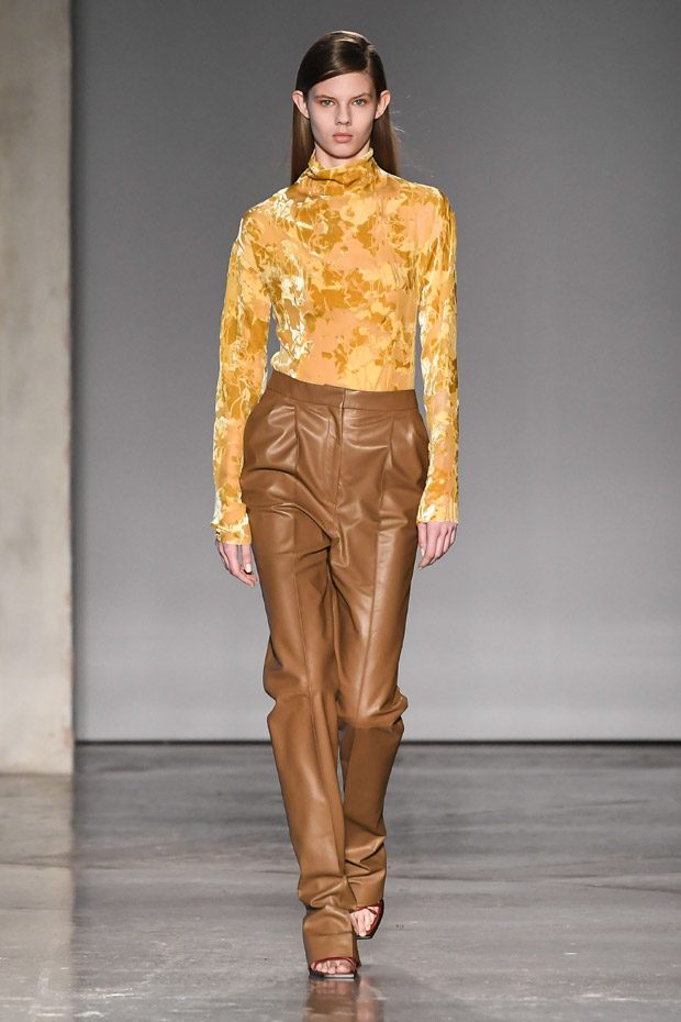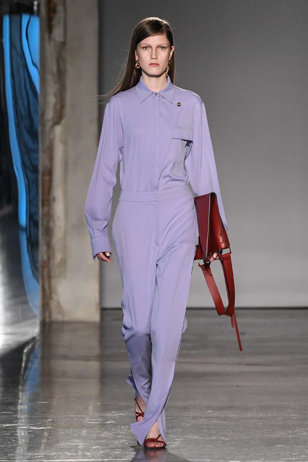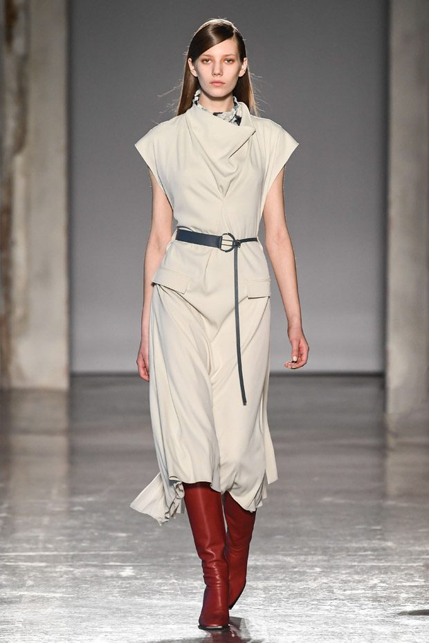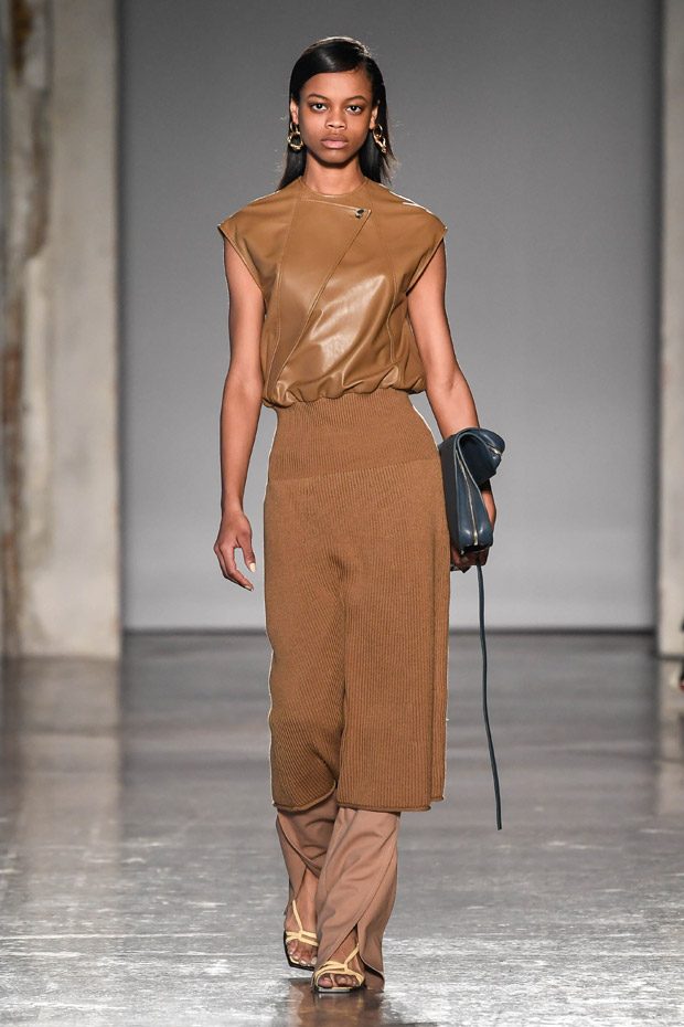 The silhouette is long and loose, sometimes rippled from light draperies, restrained by metal rings covered in leather; vertical lines emerge from ribbed wool that create overproportioned knitwear collected at the waist. Plain leather combined with colored shearling form oversized bags. Knee high boots show a squared plant highlighted by contrasting welt and sandals crafted with woven lists bare the foot.“