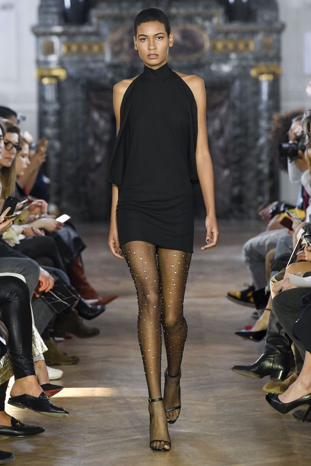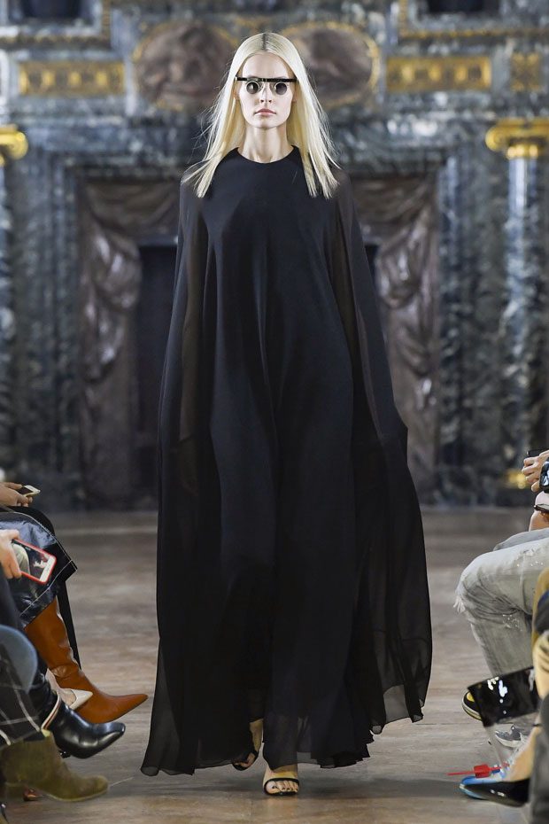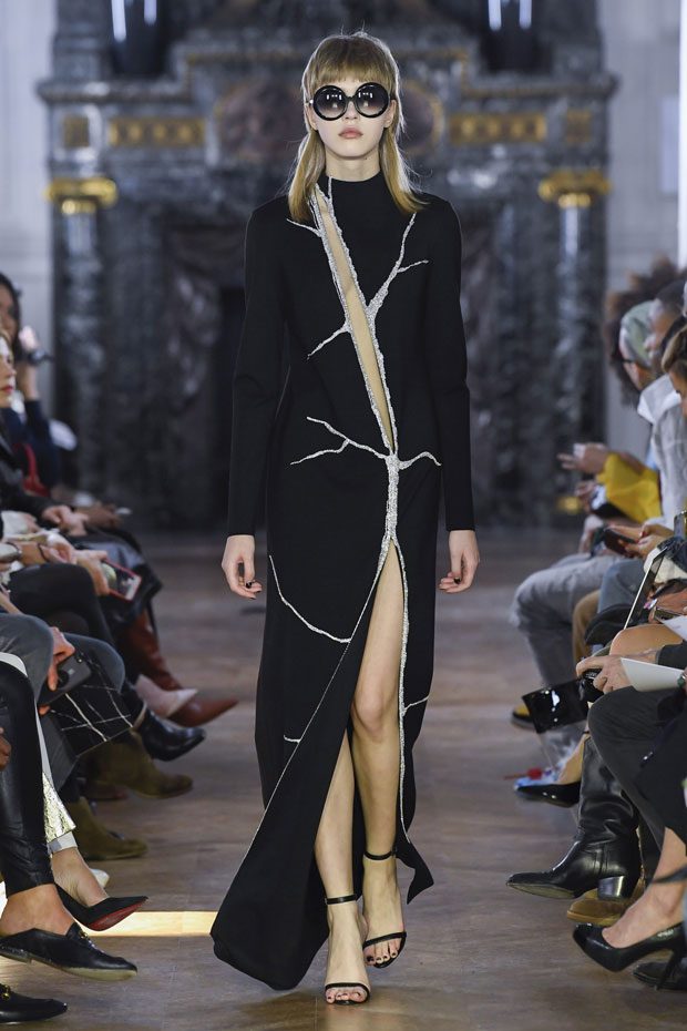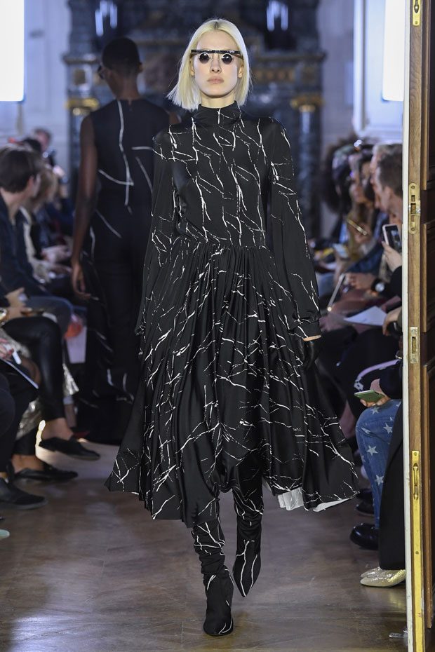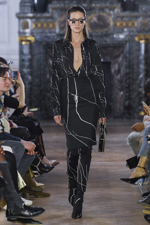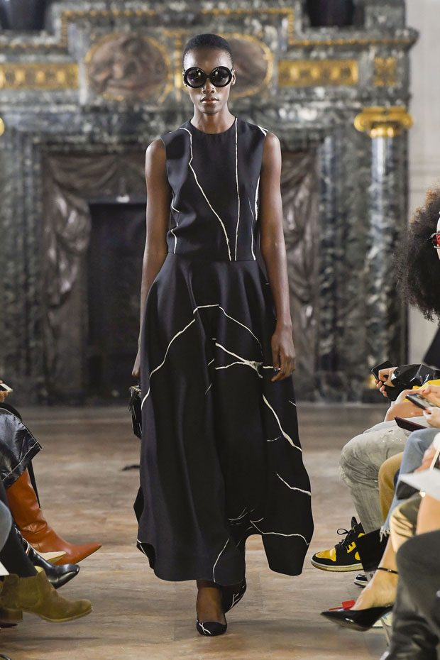This collection is a homage to Guy Laroche. Laroche, the marble, as much a play on words, as an aesthetic gesture. Cutting and carving, a vocabulary adopted in Couture. The stone itself, conjured by trompe-l’oeil on double-faced crêpe, flowing through draped jersey, or intimated on diaphanous chiffon, with gleaming veins chased in rhinestone embroidery. Neoprene bevelled to a sharp edge and seamlessly joined. Sculptural bags as if carved from polished marble. Legs enveloped in marbled viscose knit, seemingly petrified. Lapidary eye shields mounted on a black lacquer frame, like portholes onto the unseen. – from Guy Laroche