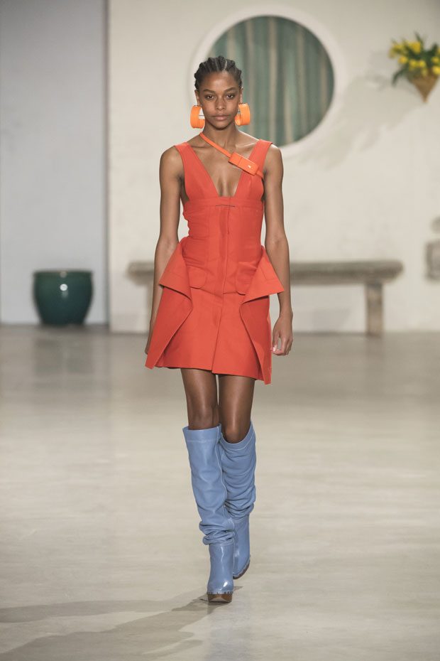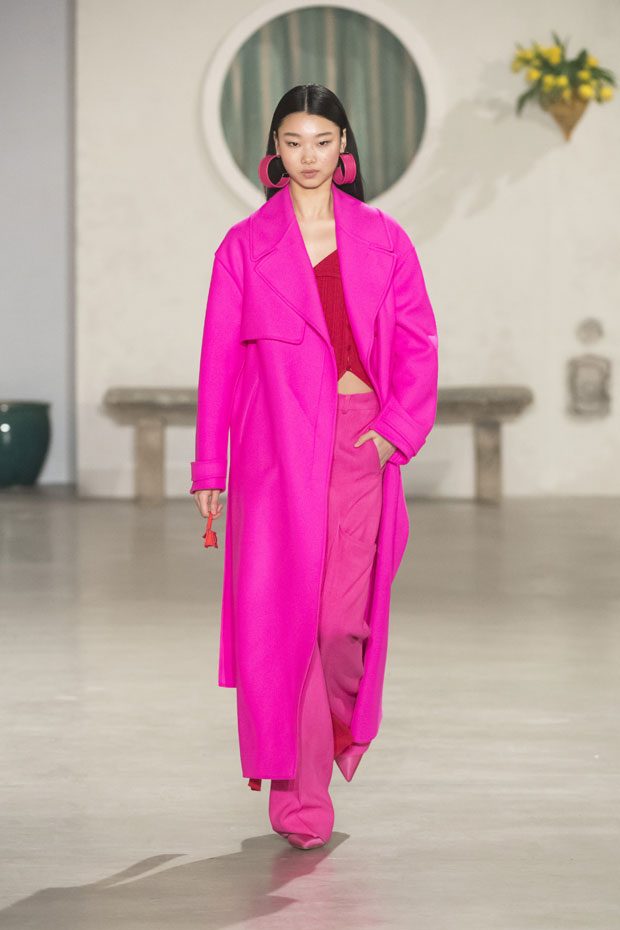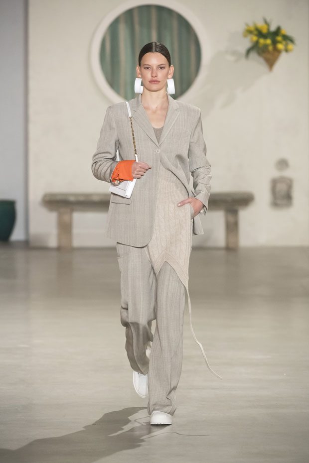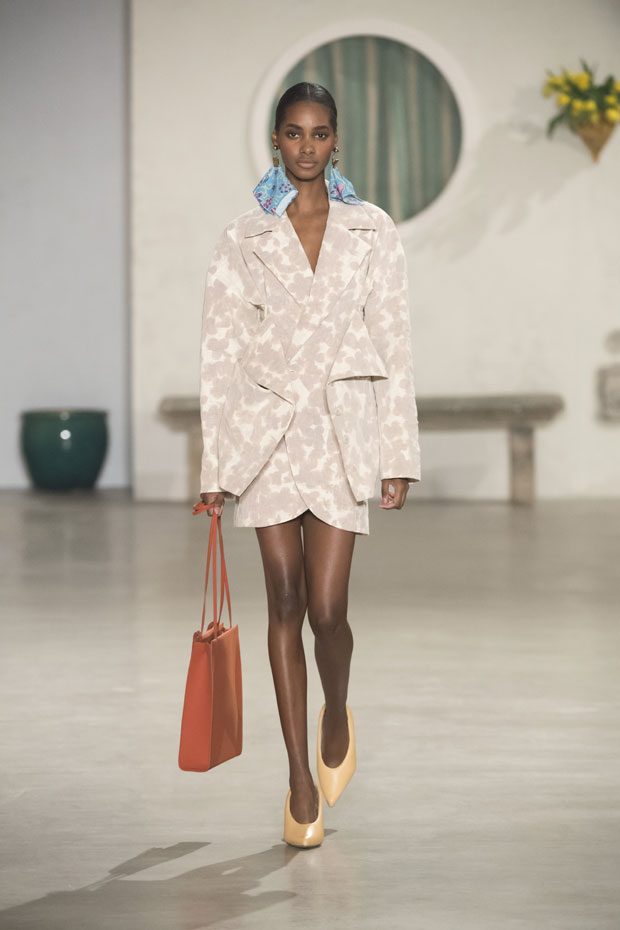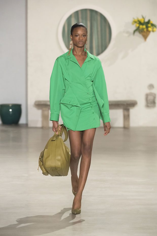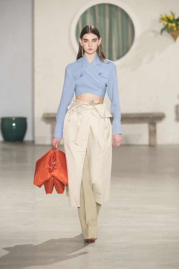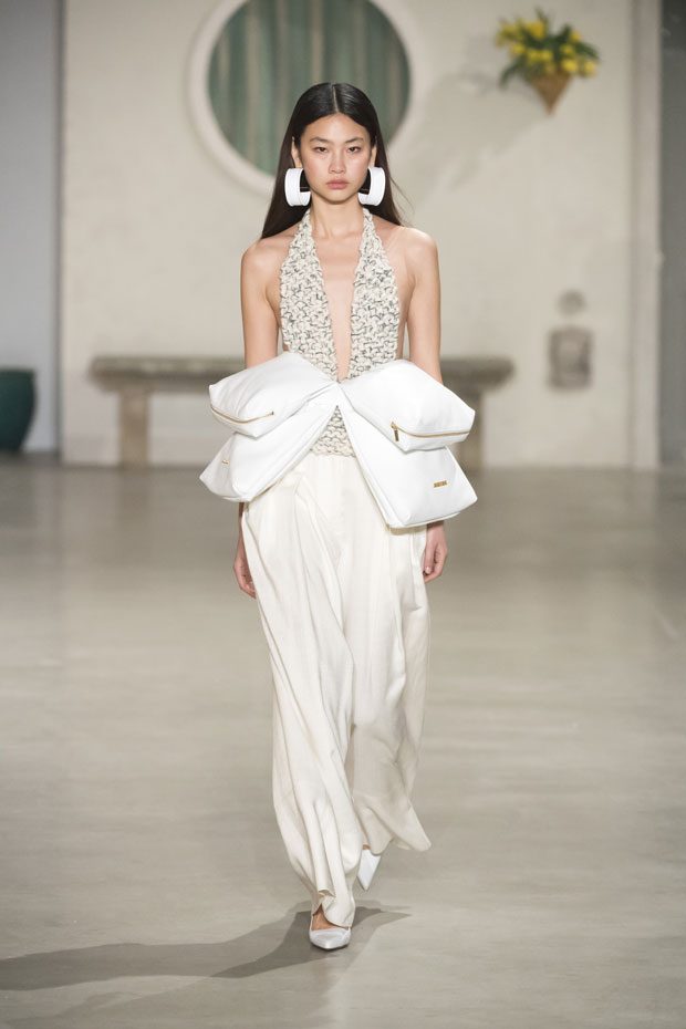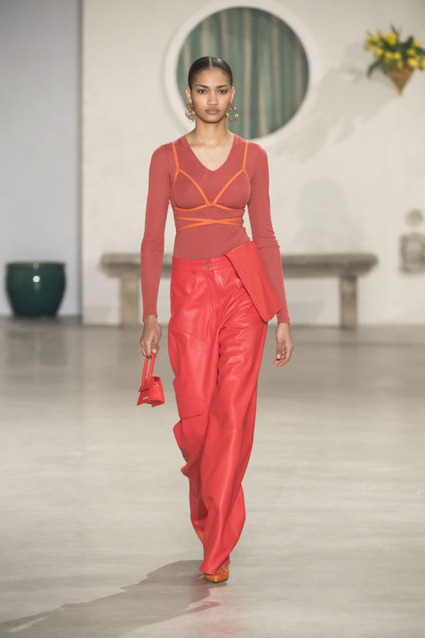 Against a bright architectural backdrop that draws from Les Demoiselles de Rochefort and the island of Murano, the collection shares Simon’s obsessions as an evolved vision of the Jacquemus woman. Tailoring and workwear re-envision a masculine influence with distinct fluidity. Adaptations to suits and cargo-pocket jeans shift the sex appeal. Thick apron straps outline exposed backs and shoulders. Construction and character define the season’s statement pieces: a fuchsia double-face wool trench, a silk gilet with oversize utility pockets, a suit punctuated with metal rings can be customized with flower buds or other ephemera. Doubled-up nylon waist bags give the impression of a present-day pannier.– from Jacquemus