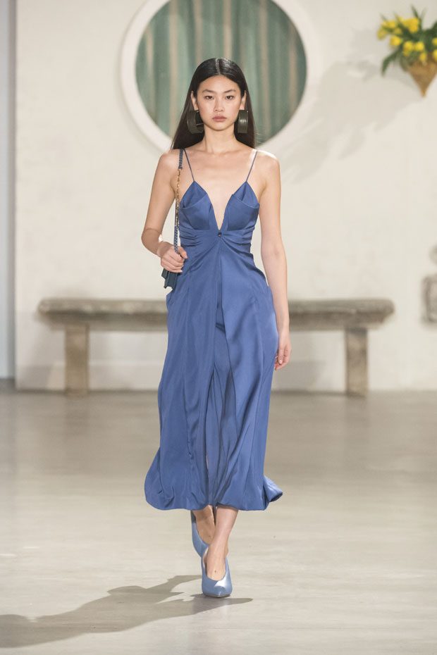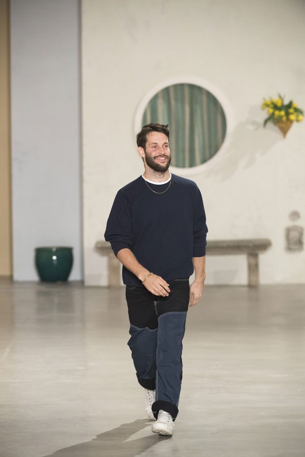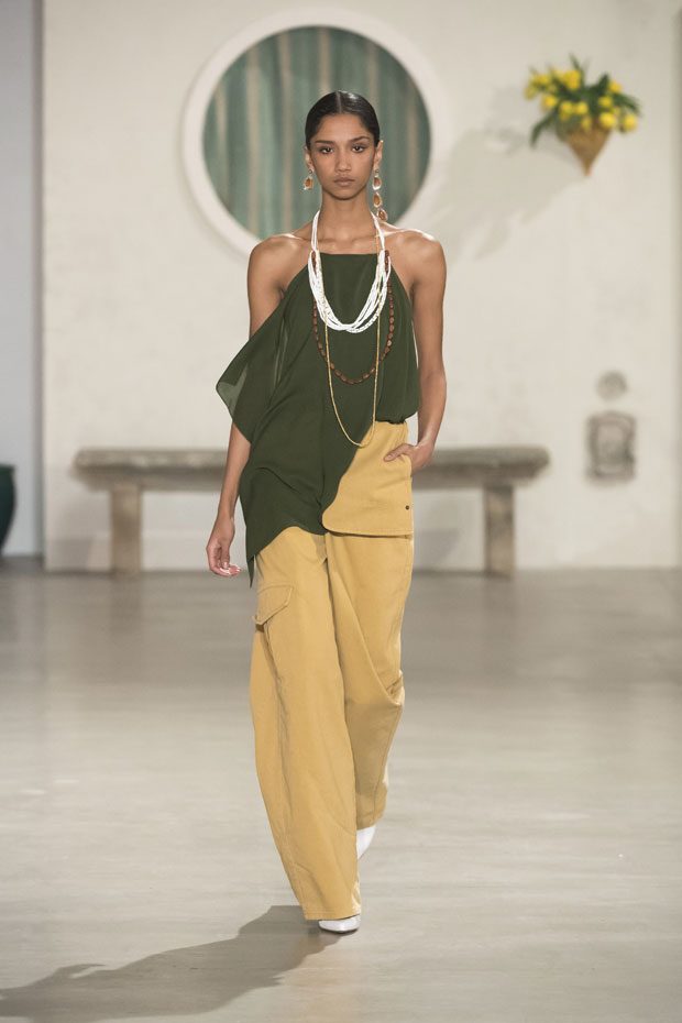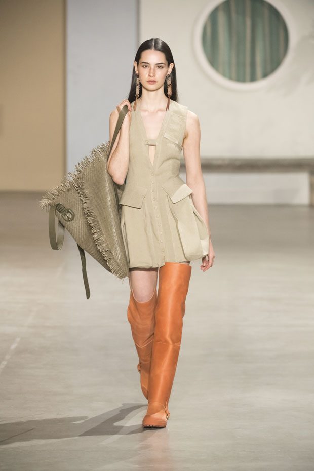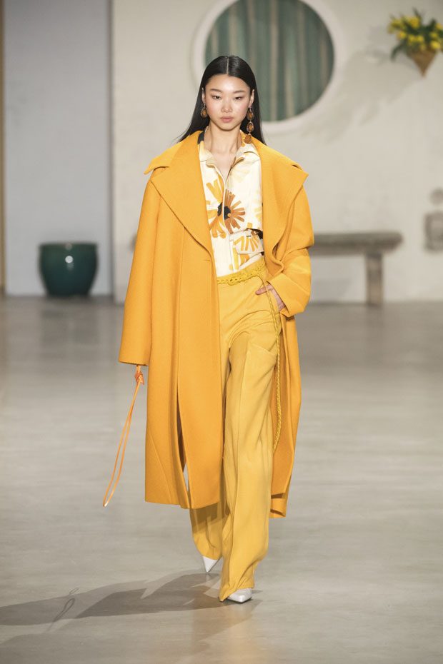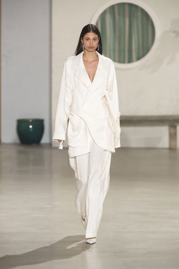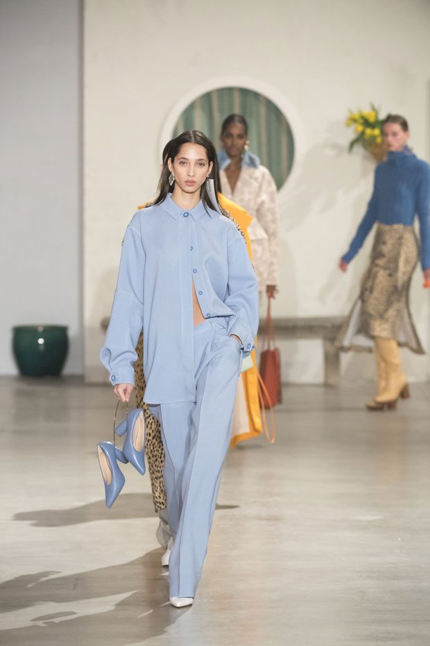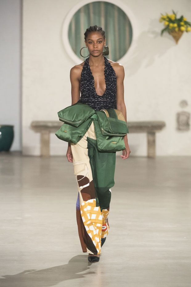 Against a bright architectural backdrop that draws from Les Demoiselles de Rochefort and the island of Murano, the collection shares Simon’s obsessions as an evolved vision of the Jacquemus woman. Tailoring and workwear re-envision a masculine influence with distinct fluidity. Adaptations to suits and cargo-pocket jeans shift the sex appeal. Thick apron straps outline exposed backs and shoulders. Construction and character define the season’s statement pieces: a fuchsia double-face wool trench, a silk gilet with oversize utility pockets, a suit punctuated with metal rings can be customized with flower buds or other ephemera. Doubled-up nylon waist bags give the impression of a present-day pannier.– from Jacquemus