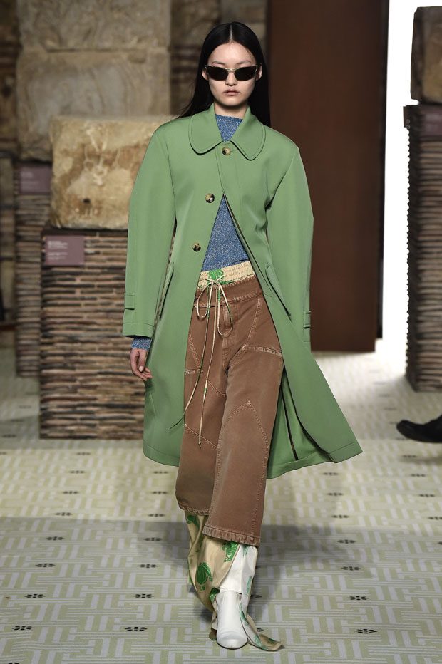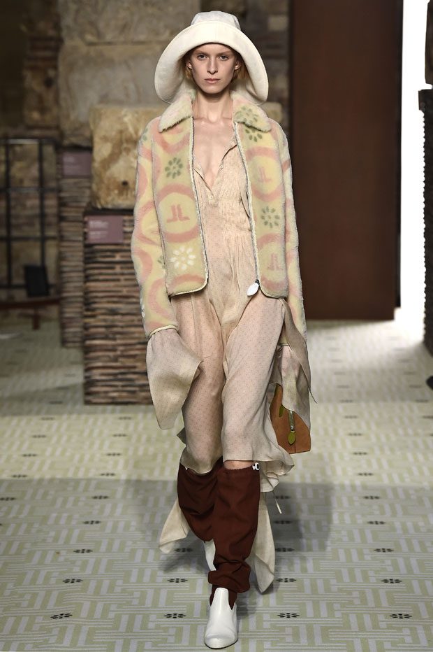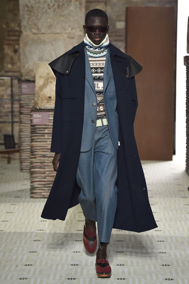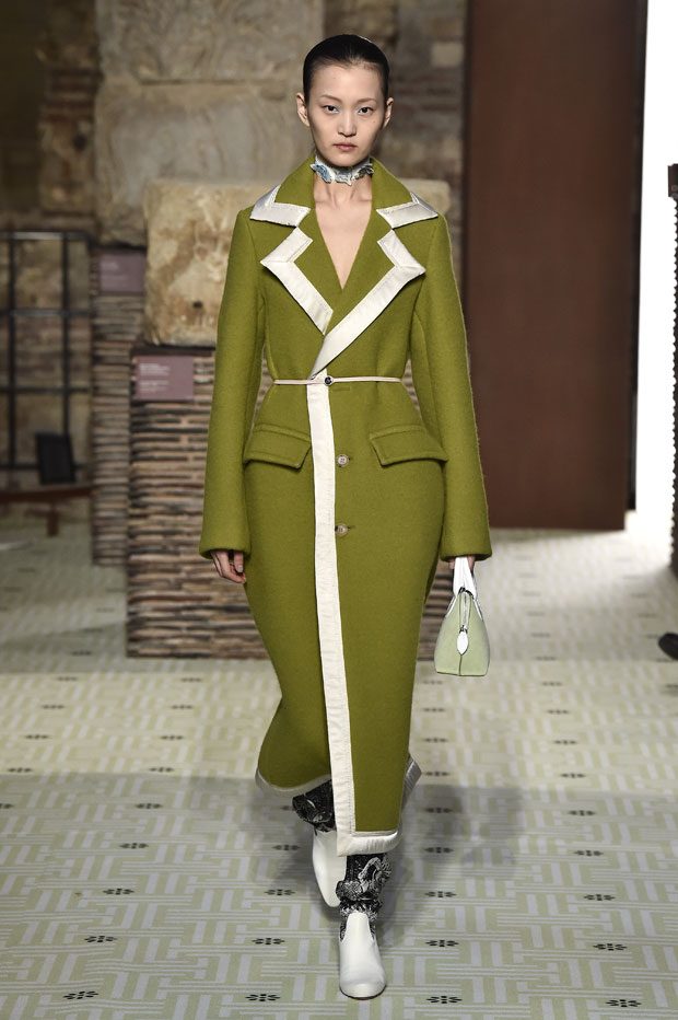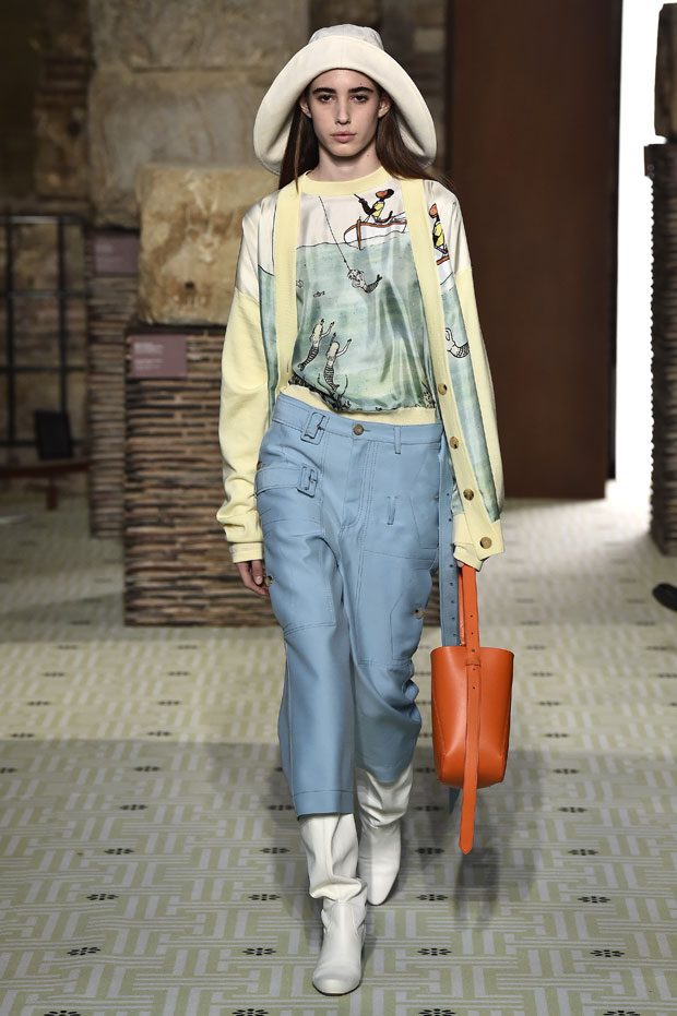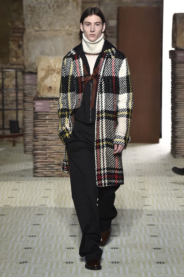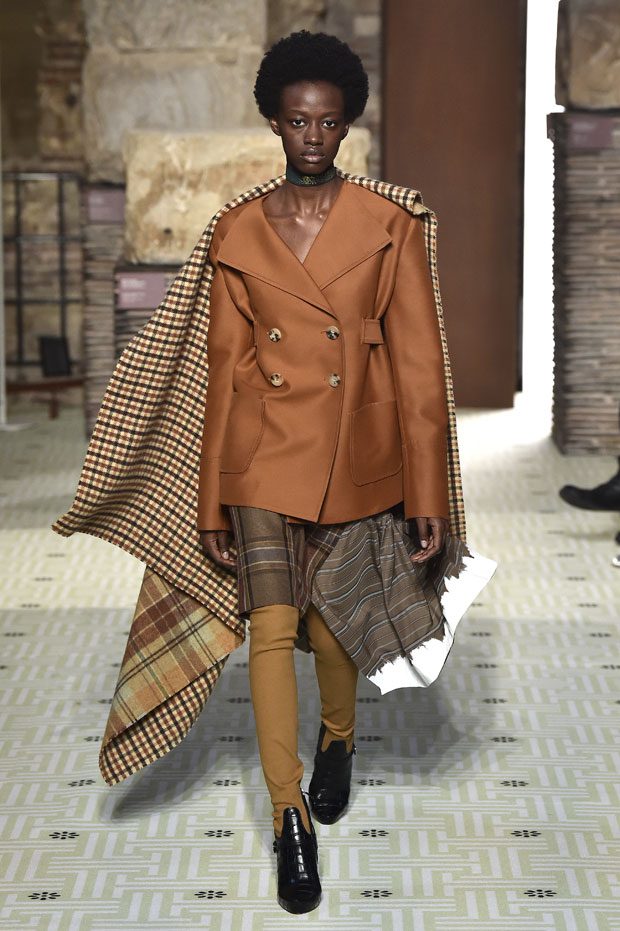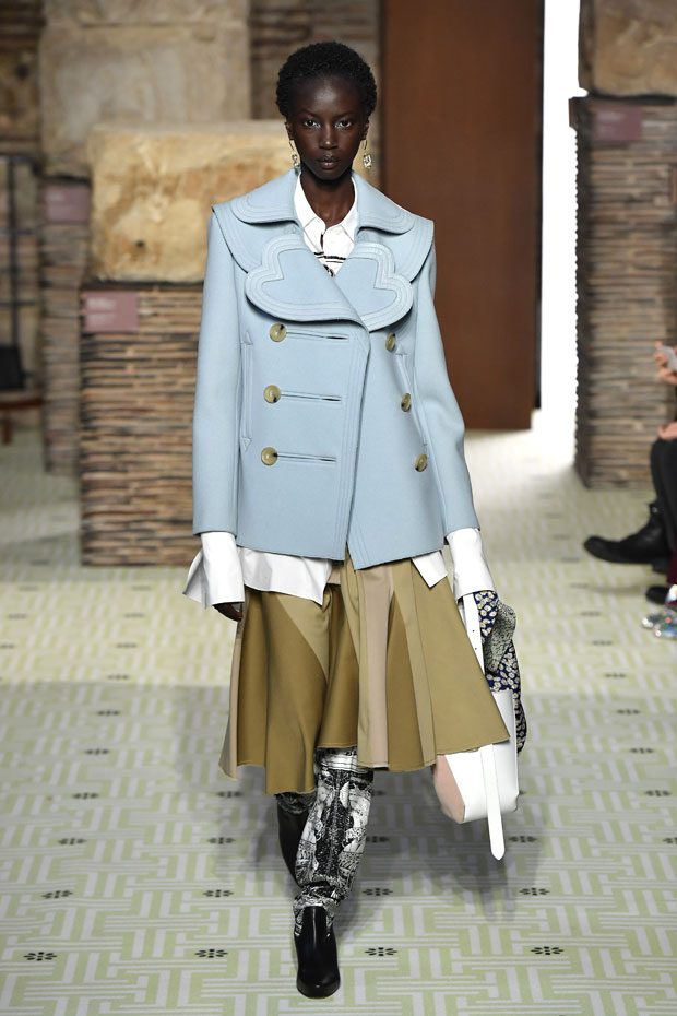 Reviving Lanvin’s playful narrative in a symphony of romantic archetypes, Sialelli draws upon a multitude of moods: from nautical to bucolic, regal to childlike, the collection personifies lyrical conversations in cloth. Pre-Raphaelite colours depart from Lanvin ‘quattrocento’ blue into powdery shades of avocado, absinthe, banana and bergamot warmed by mahogany, navy, tomato and a blaze of ultraviolet. Inciting pure comfort and a suite of leisurely pursuits, classic shapes are spliced with sensual fabrications, as Norwegian blankets, exotic Fair Isles, and giant clan tartans swaddle inherently French garments. ‘Whole garment’ knits create sinuous volumes shaped in cashmere and lurex, whilst the vareuse from Brittany, the heart-collar caban, zipped blousons and riding coats are rendered in cashmere, gabardine, intarsia shearling or wool gazar. – from Lanvin