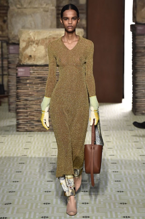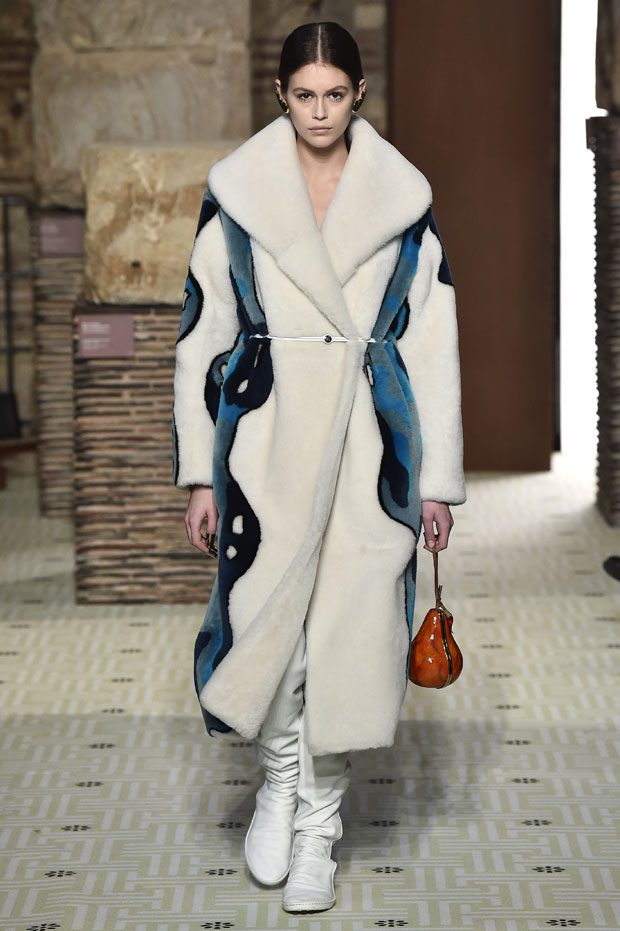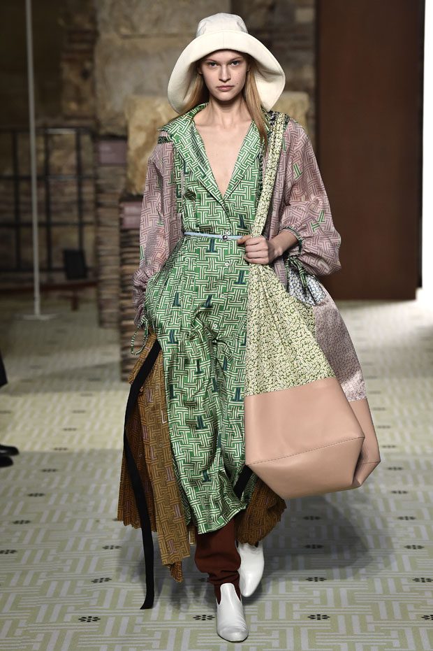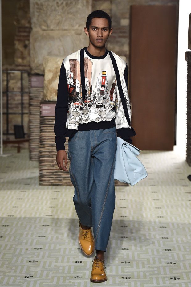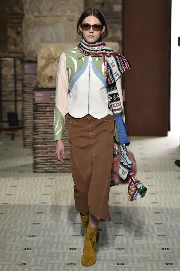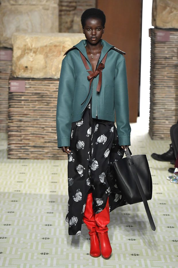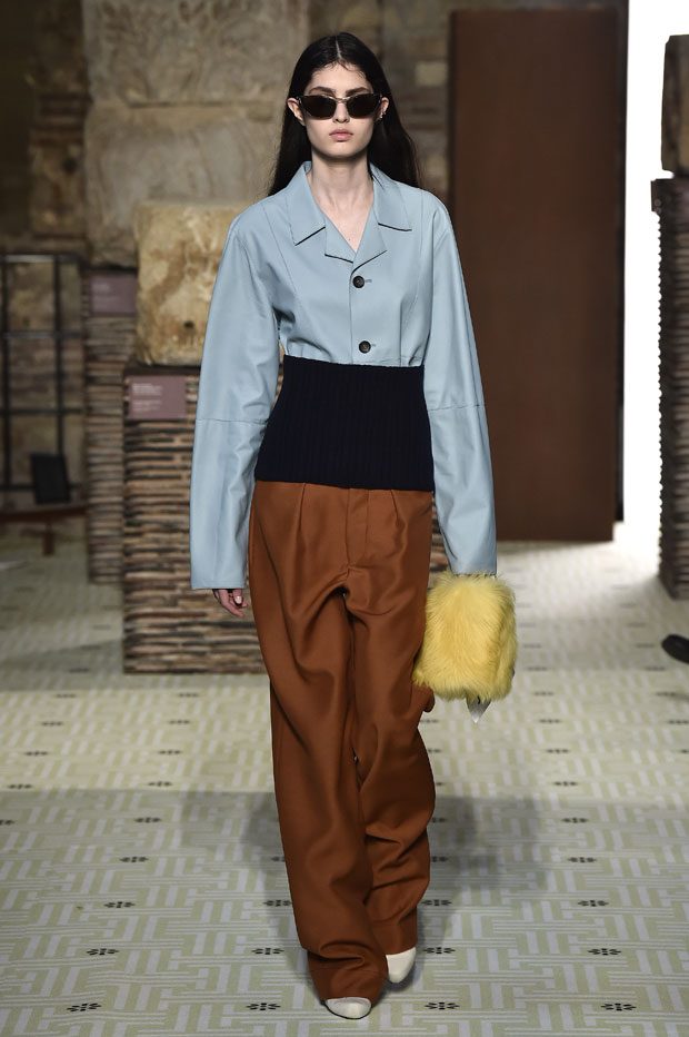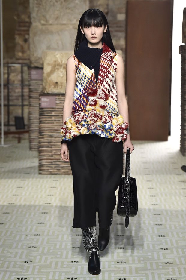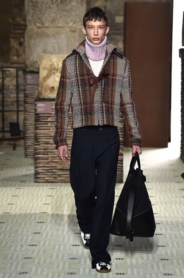 Reviving Lanvin’s playful narrative in a symphony of romantic archetypes, Sialelli draws upon a multitude of moods: from nautical to bucolic, regal to childlike, the collection personifies lyrical conversations in cloth. Pre-Raphaelite colours depart from Lanvin ‘quattrocento’ blue into powdery shades of avocado, absinthe, banana and bergamot warmed by mahogany, navy, tomato and a blaze of ultraviolet. Inciting pure comfort and a suite of leisurely pursuits, classic shapes are spliced with sensual fabrications, as Norwegian blankets, exotic Fair Isles, and giant clan tartans swaddle inherently French garments. ‘Whole garment’ knits create sinuous volumes shaped in cashmere and lurex, whilst the vareuse from Brittany, the heart-collar caban, zipped blousons and riding coats are rendered in cashmere, gabardine, intarsia shearling or wool gazar. – from Lanvin
