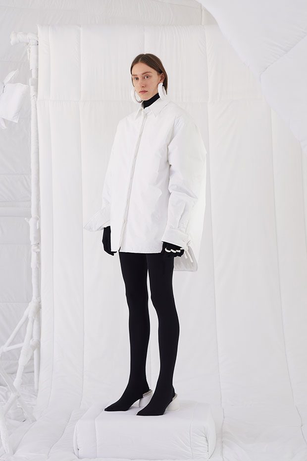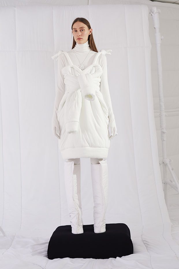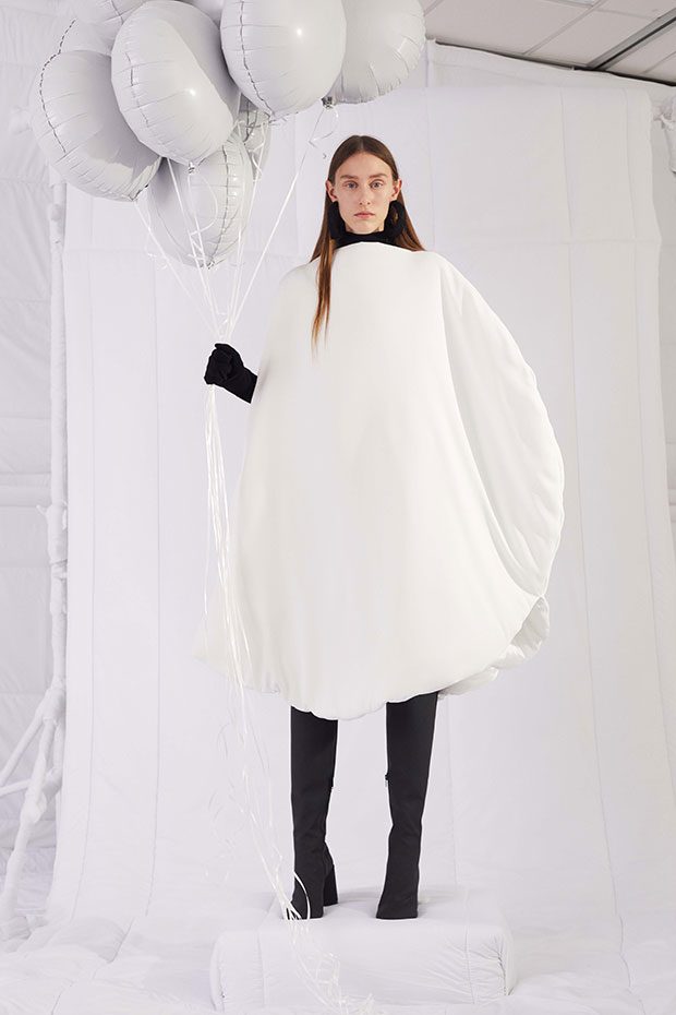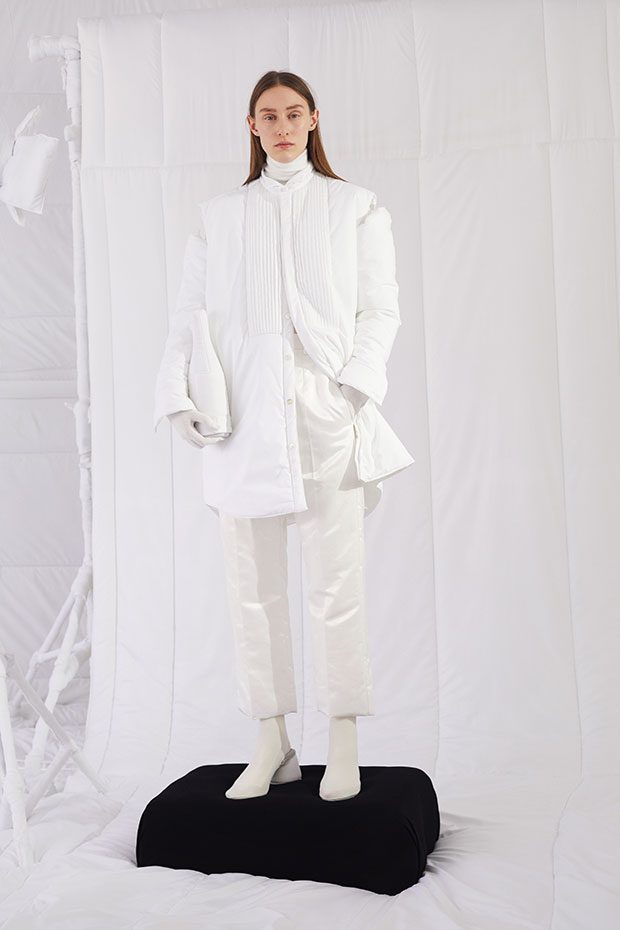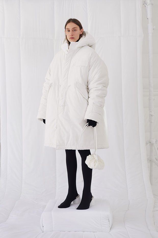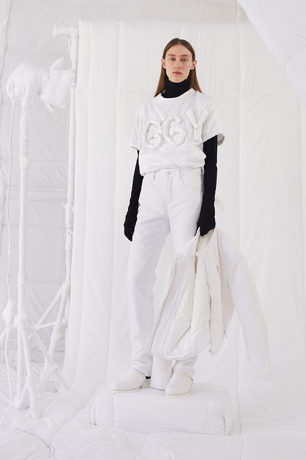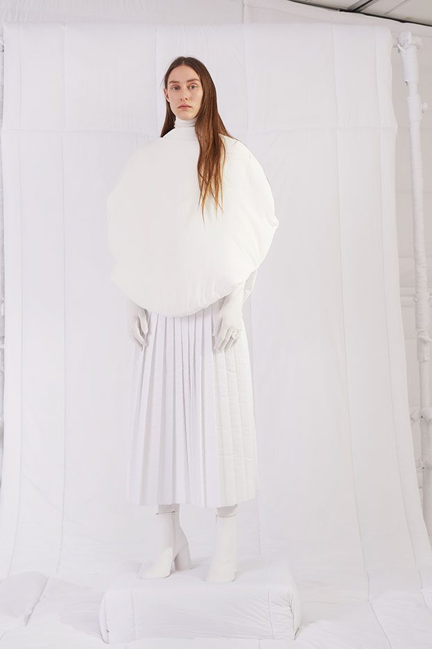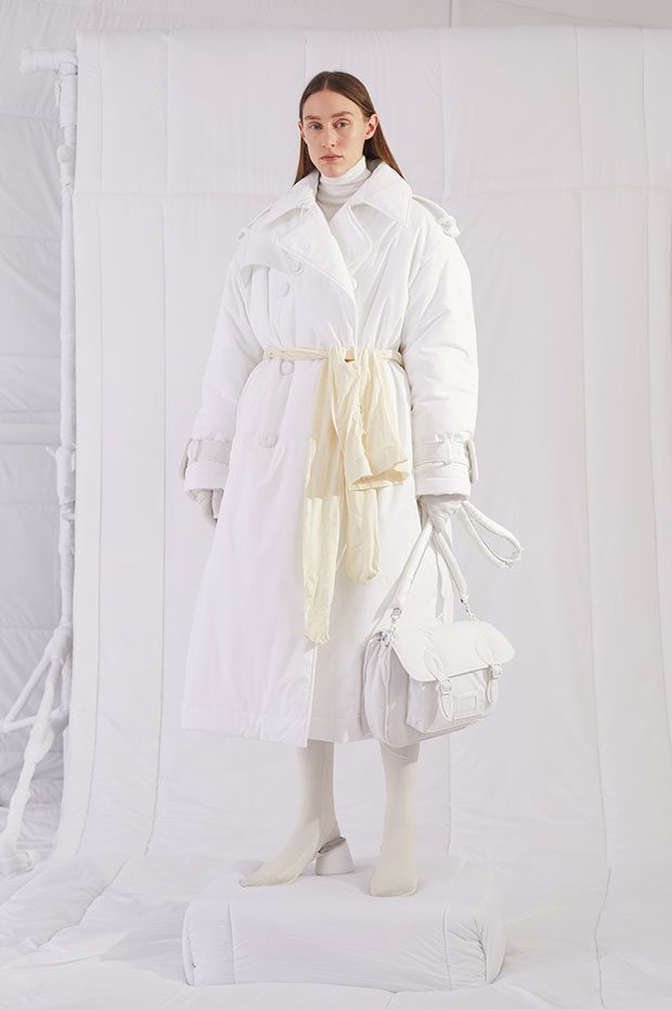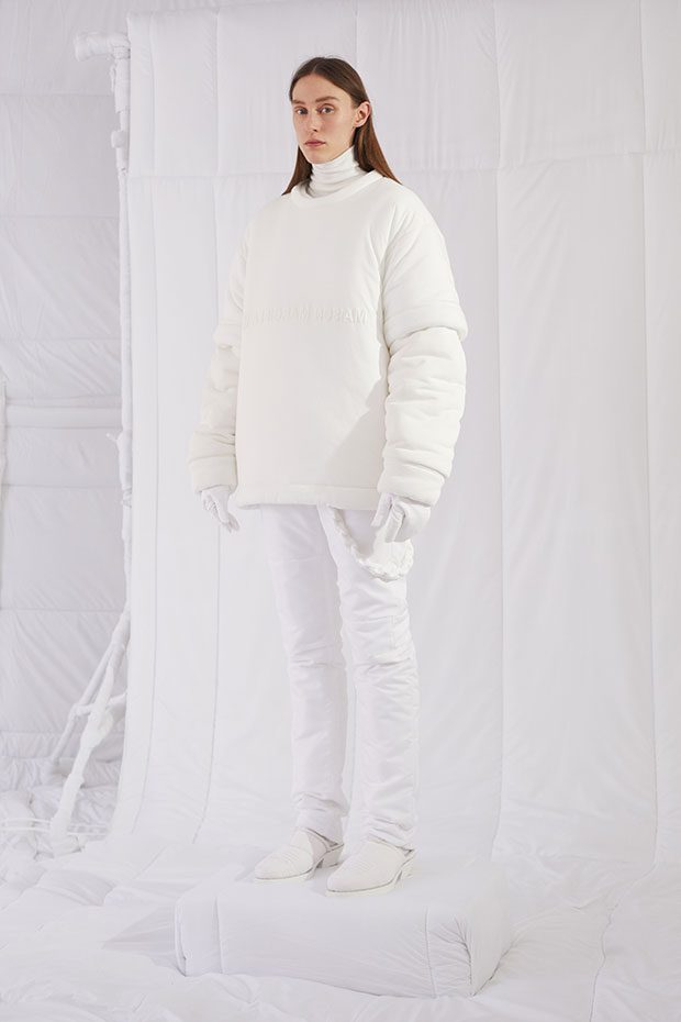 An entire wardrobe of MM6 classics reimagined in puffed-up, padded forms. A representative of the collective identity of the house, the Autumn-Winter 2019 collection is unified and mysterious; democratic and inclusive. Individual garments remain humble – never overridden by the concept. Instead, the MM6 wardrobe, which encompasses ready-to-wear, accessories, footwear and jewellery for women, continues to evolve and build upon its own modern wearability. Presented in an immersive, padded world inside the Maison Margiela store in Milan – where even skirting boards and chandeliers are transformed – the brand finds a temporary home in Italy for the season. Alongside a soundtrack of distorted, sleepy techno by Frédéric Sanchez, the environment brings a new conceptuality to the collection. Behaving in a truly inclusive way (echoing the democratic nature of garments) the presentation is open to members of the public – true fans of MM6 – and five limited-edition pieces are available to purchase immediately after. – from MM6 Maison Margiela