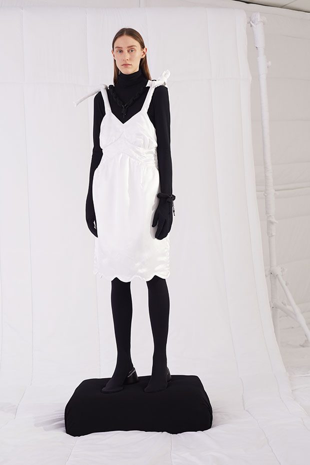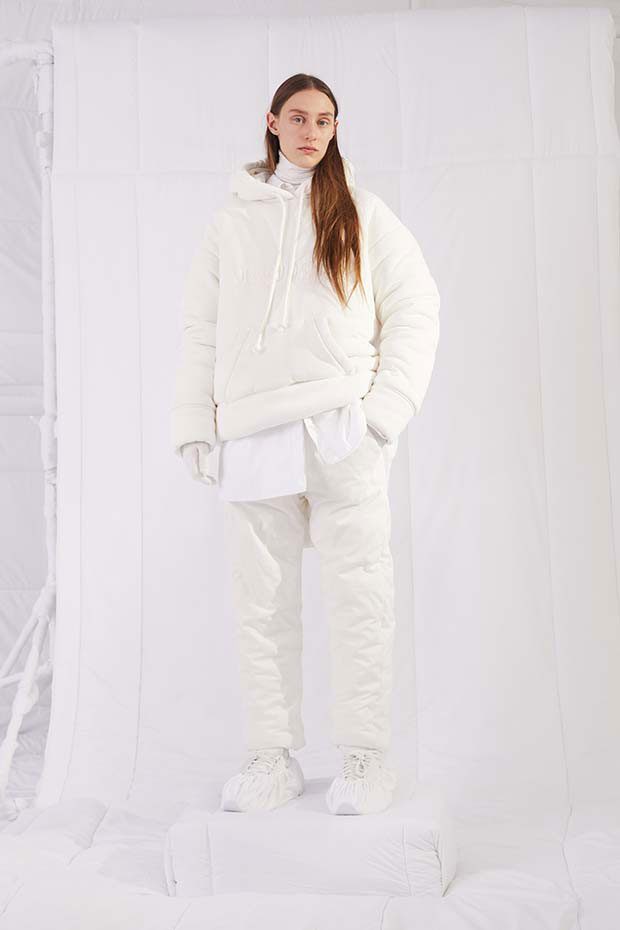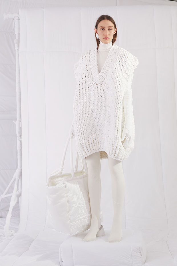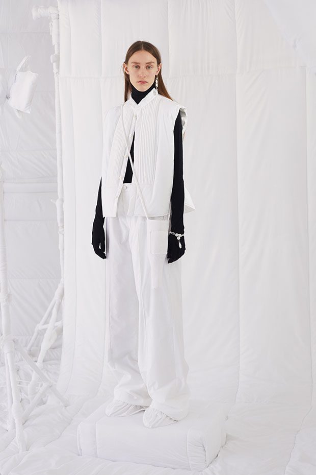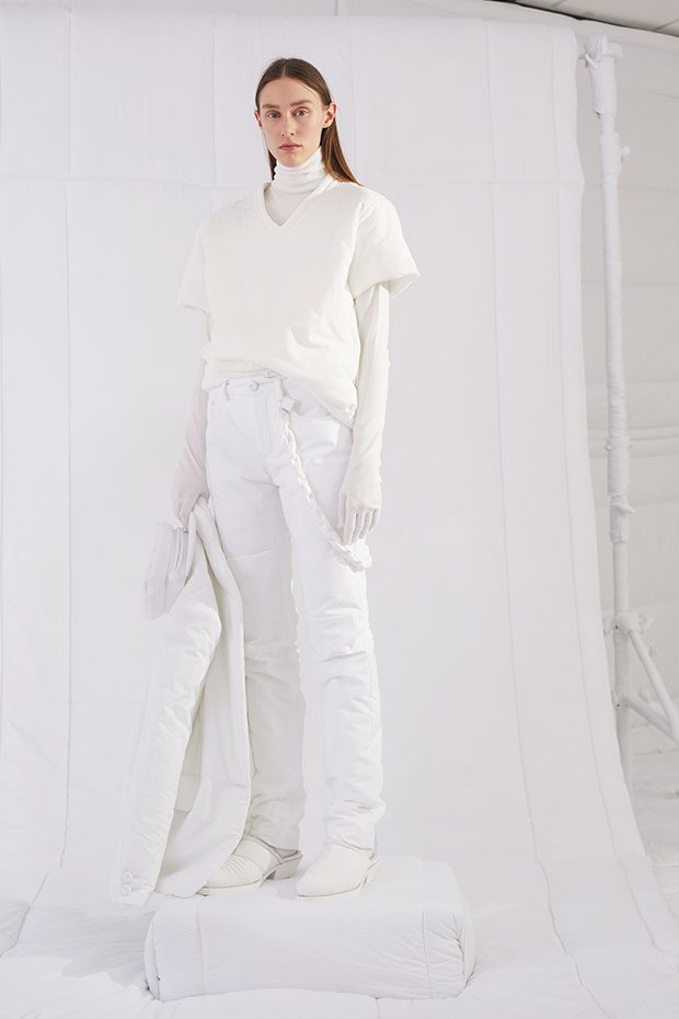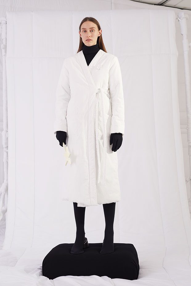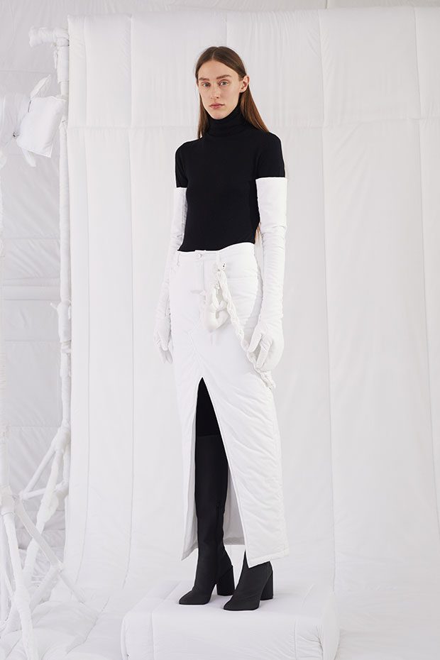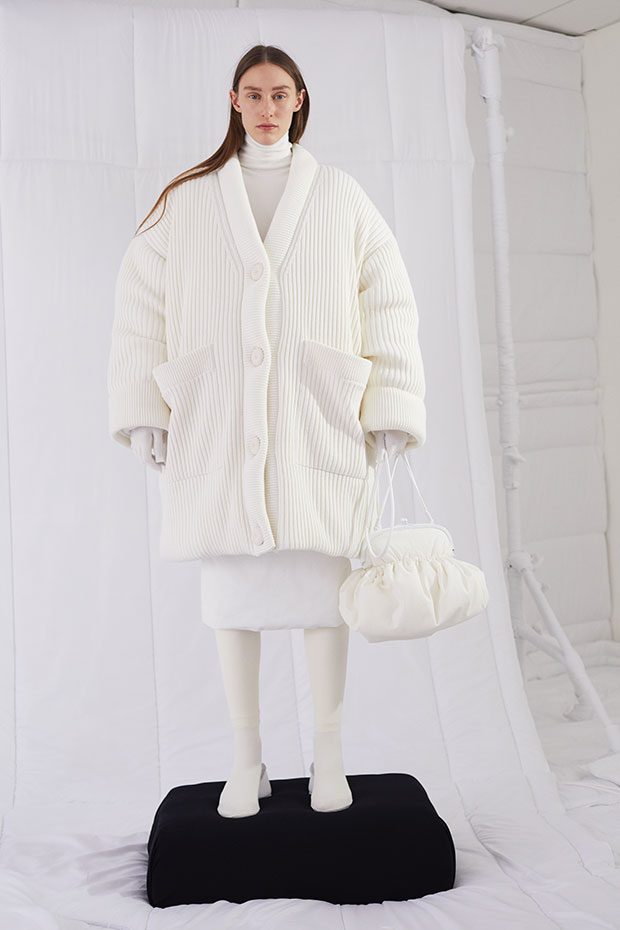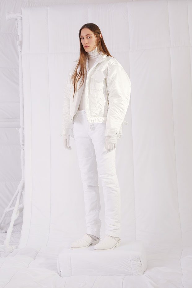 An entire wardrobe of MM6 classics reimagined in puffed-up, padded forms. A representative of the collective identity of the house, the Autumn-Winter 2019 collection is unified and mysterious; democratic and inclusive. Individual garments remain humble – never overridden by the concept. Instead, the MM6 wardrobe, which encompasses ready-to-wear, accessories, footwear and jewellery for women, continues to evolve and build upon its own modern wearability. Presented in an immersive, padded world inside the Maison Margiela store in Milan – where even skirting boards and chandeliers are transformed – the brand finds a temporary home in Italy for the season. Alongside a soundtrack of distorted, sleepy techno by Frédéric Sanchez, the environment brings a new conceptuality to the collection. Behaving in a truly inclusive way (echoing the democratic nature of garments) the presentation is open to members of the public – true fans of MM6 – and five limited-edition pieces are available to purchase immediately after. – from MM6 Maison Margiela