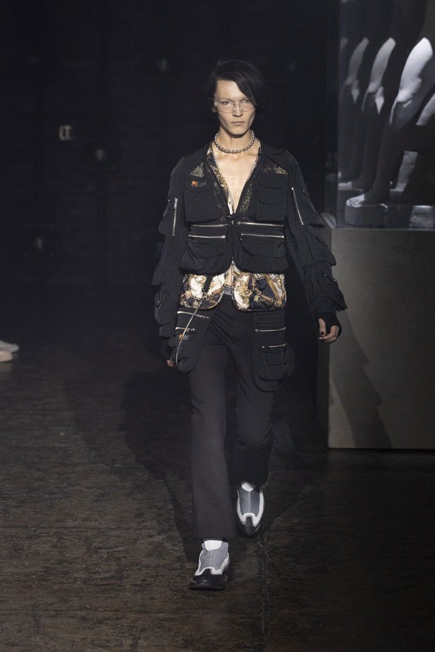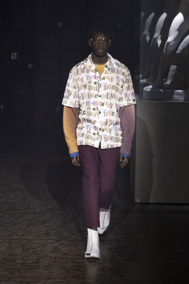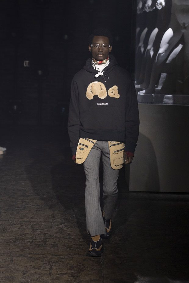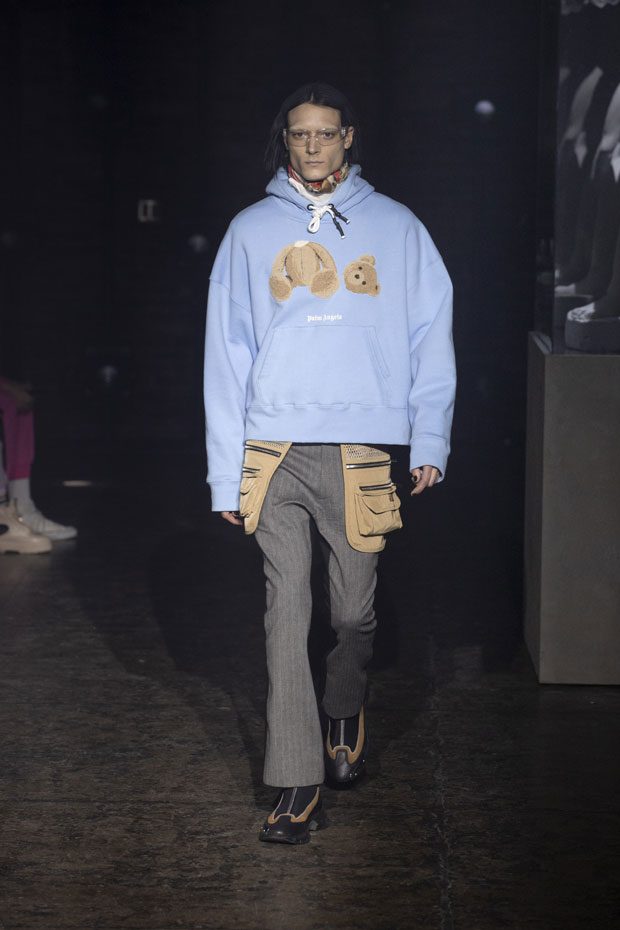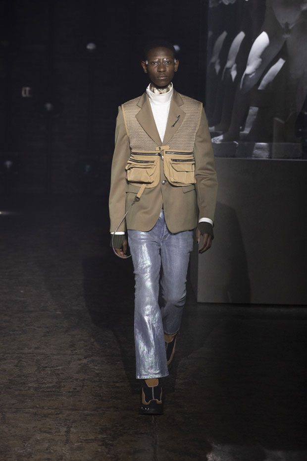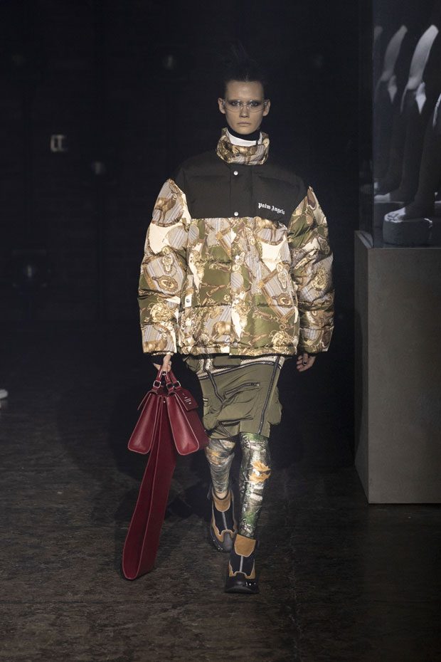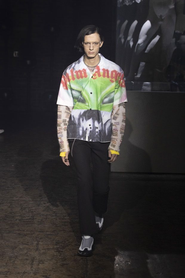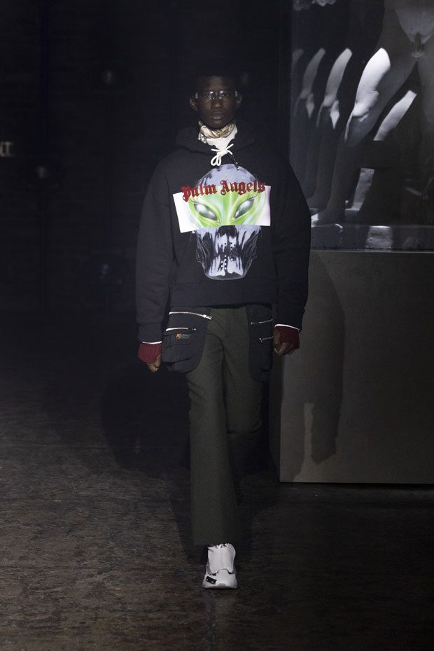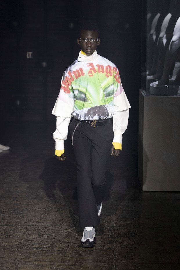 A foray into personal passions and obsession shapes the collection. The spirit is consistent: tropes taken from different cultures and their dress codes are clashed into non codified mixtures, creating biased iconographies. This season, the sartorial takes the lead, as the properness of formality becomes the vehicle for a take on rebellion that’s considered as opposed to loud, and assertive. It’s sartorial charged with a definite subcultural aura: the solaro two-tone fabric, zippered closures, boxy jackets and stovepipe trousers, as well as the frilly blouses are redolent of the Sixties. This clean language is constantly distorted with insertions hinting to the worlds of fishing & hunting and skiing: multi-purpose vests with mesh pockets, tool belts, articulated trousers. Sartorial and sportswear merge as prints and patterns progress from hunting camo motifs and acid tie-dye prints to ransom lettering to equestrian scenes worth a very bourgeois foulard. The brass buttons, pinstripe shirting and air of pomp and circumstance are just as bourgeois, but the whole balance is definitely not. Marilyn Manson wanders about. – from Palm Angels