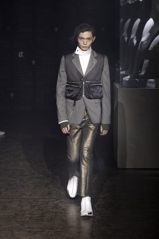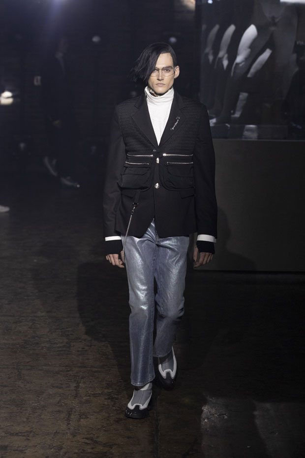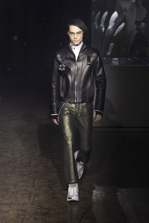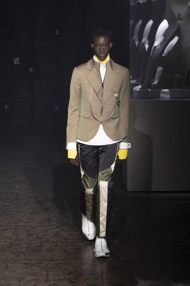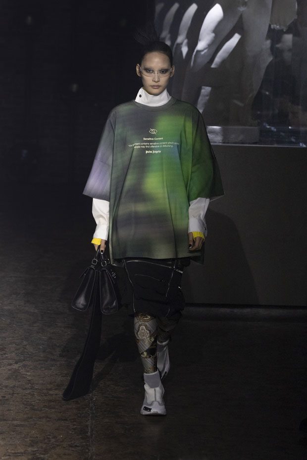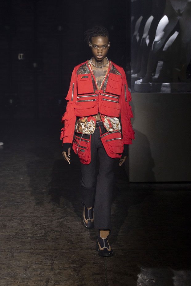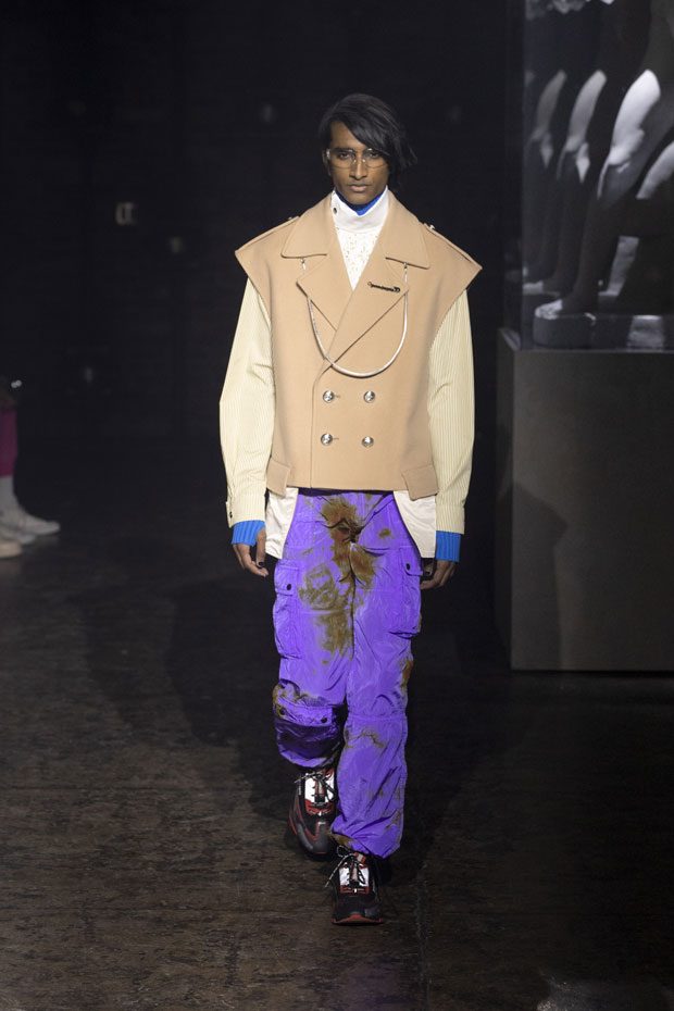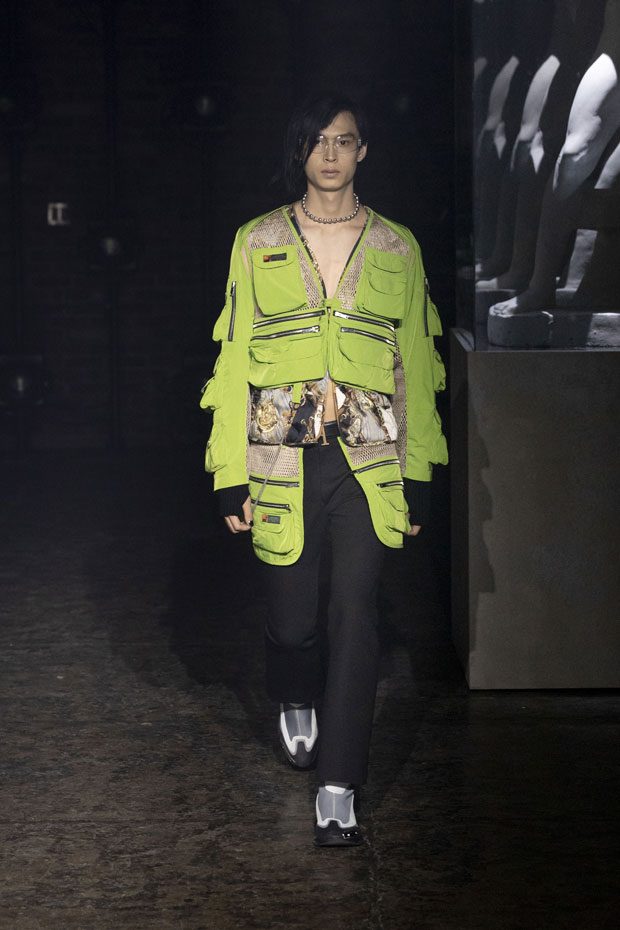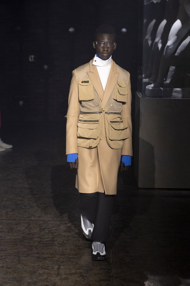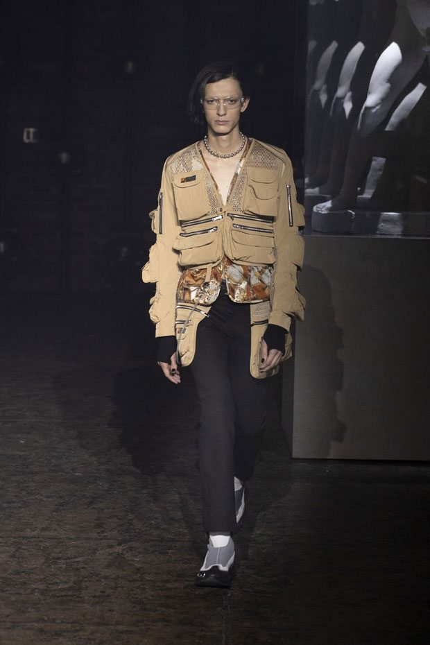 A foray into personal passions and obsession shapes the collection. The spirit is consistent: tropes taken from different cultures and their dress codes are clashed into non codified mixtures, creating biased iconographies. This season, the sartorial takes the lead, as the properness of formality becomes the vehicle for a take on rebellion that’s considered as opposed to loud, and assertive. It’s sartorial charged with a definite subcultural aura: the solaro two-tone fabric, zippered closures, boxy jackets and stovepipe trousers, as well as the frilly blouses are redolent of the Sixties. This clean language is constantly distorted with insertions hinting to the worlds of fishing & hunting and skiing: multi-purpose vests with mesh pockets, tool belts, articulated trousers. Sartorial and sportswear merge as prints and patterns progress from hunting camo motifs and acid tie-dye prints to ransom lettering to equestrian scenes worth a very bourgeois foulard. The brass buttons, pinstripe shirting and air of pomp and circumstance are just as bourgeois, but the whole balance is definitely not. Marilyn Manson wanders about. – from Palm Angels