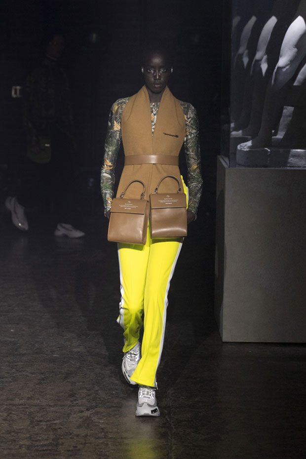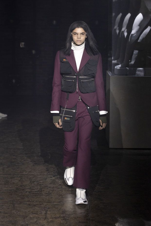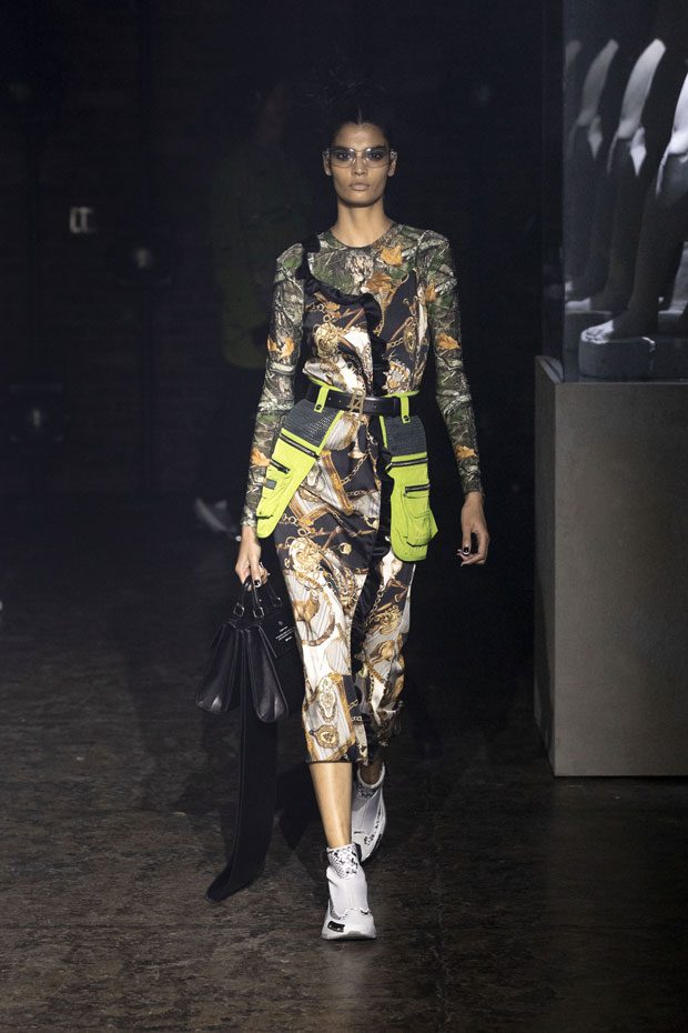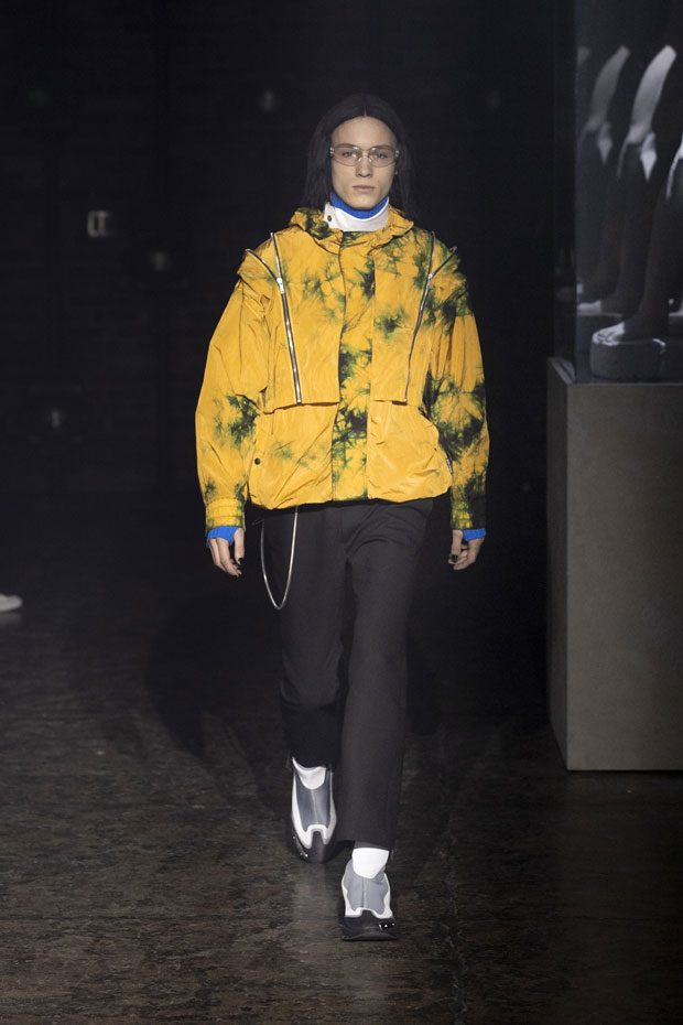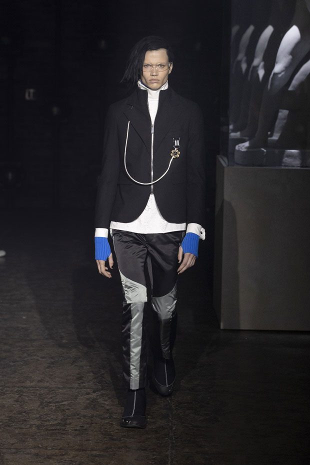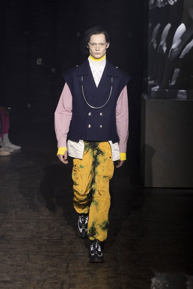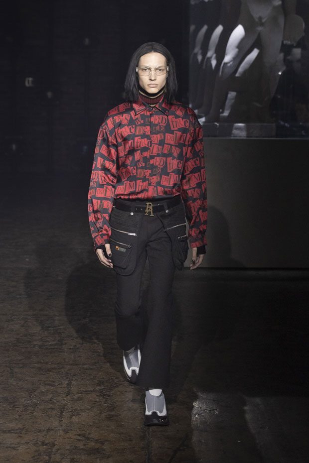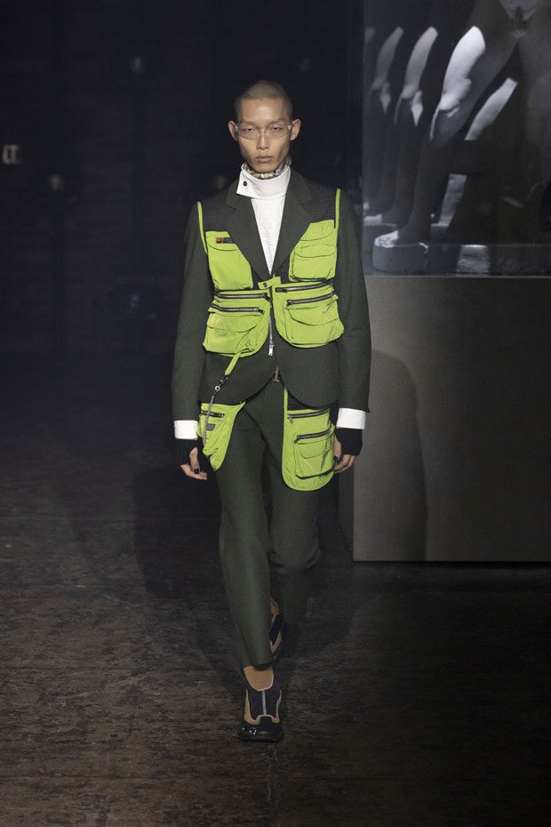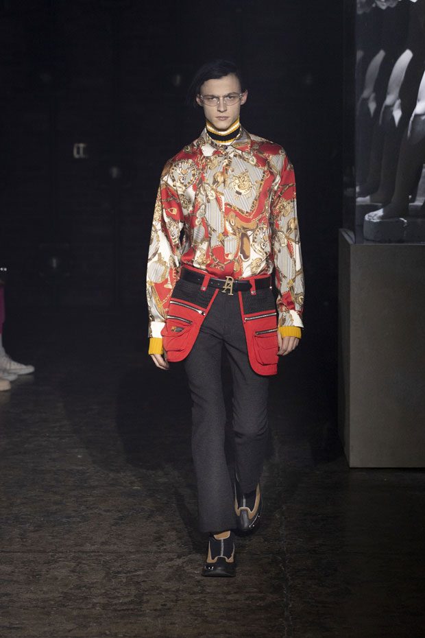 A foray into personal passions and obsession shapes the collection. The spirit is consistent: tropes taken from different cultures and their dress codes are clashed into non codified mixtures, creating biased iconographies. This season, the sartorial takes the lead, as the properness of formality becomes the vehicle for a take on rebellion that’s considered as opposed to loud, and assertive. It’s sartorial charged with a definite subcultural aura: the solaro two-tone fabric, zippered closures, boxy jackets and stovepipe trousers, as well as the frilly blouses are redolent of the Sixties. This clean language is constantly distorted with insertions hinting to the worlds of fishing & hunting and skiing: multi-purpose vests with mesh pockets, tool belts, articulated trousers. Sartorial and sportswear merge as prints and patterns progress from hunting camo motifs and acid tie-dye prints to ransom lettering to equestrian scenes worth a very bourgeois foulard. The brass buttons, pinstripe shirting and air of pomp and circumstance are just as bourgeois, but the whole balance is definitely not. Marilyn Manson wanders about. – from Palm Angels