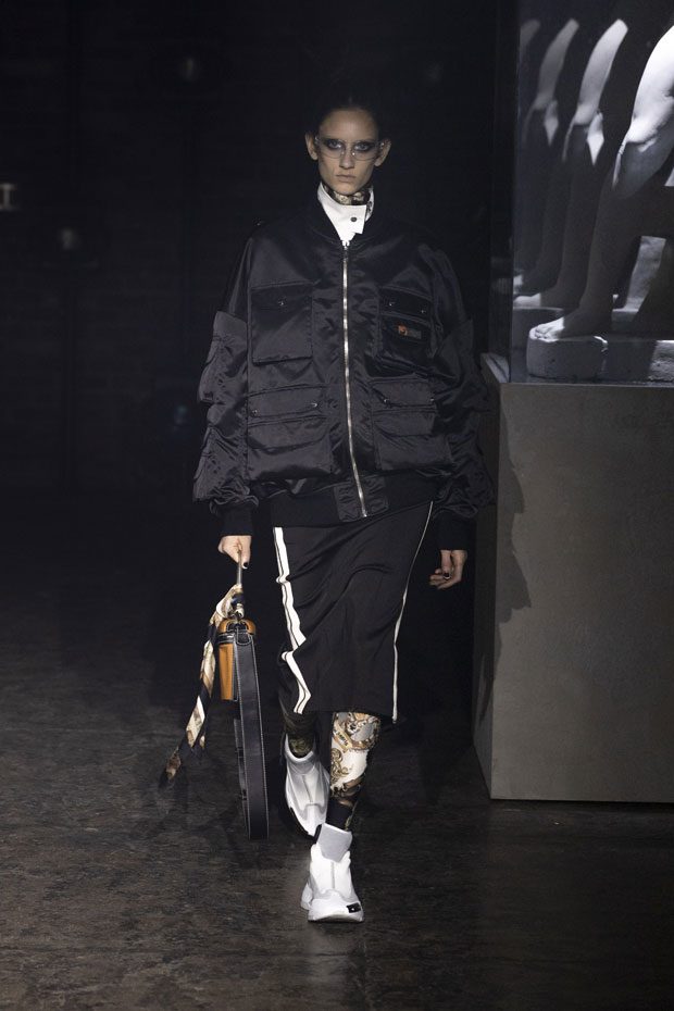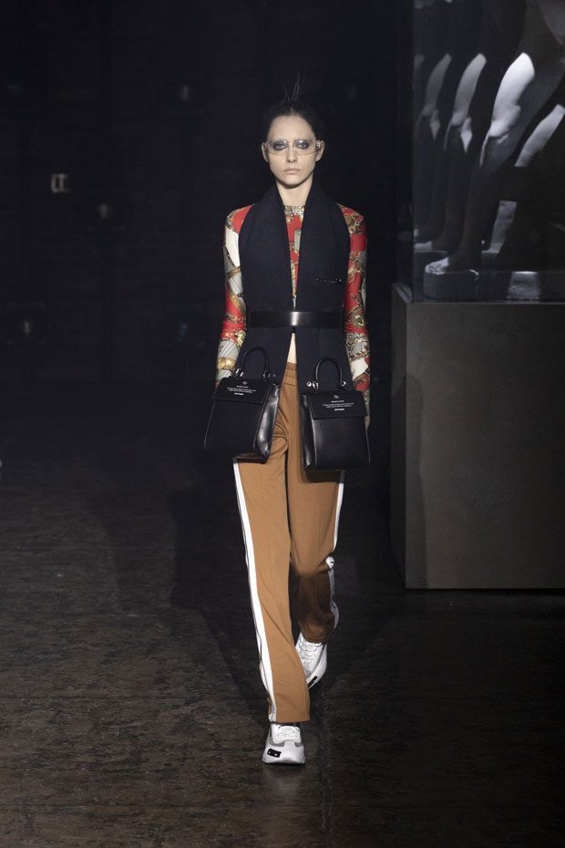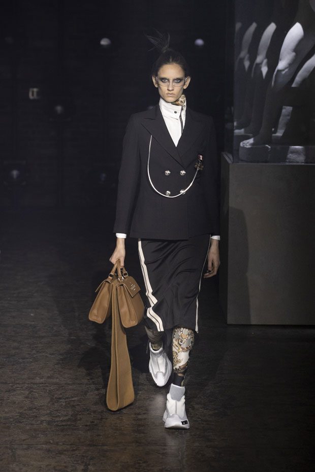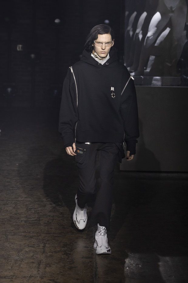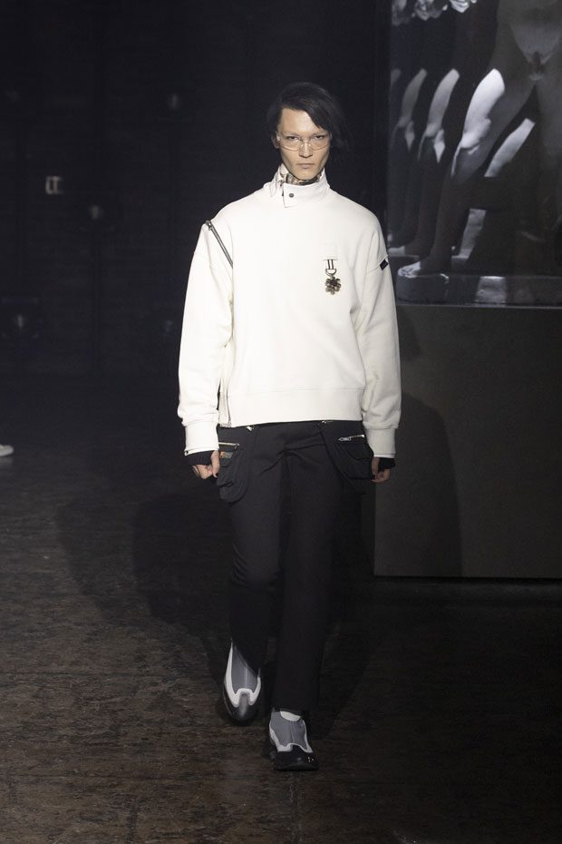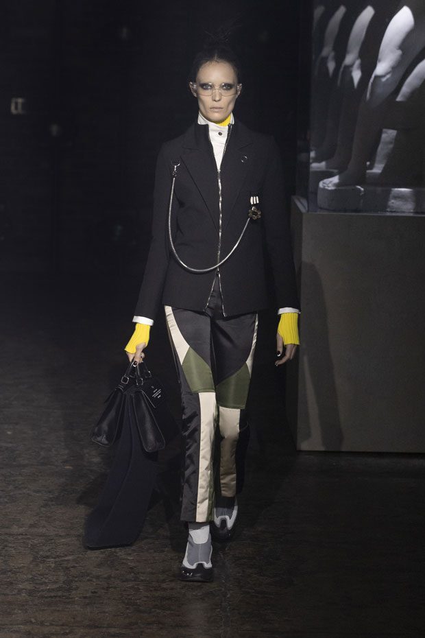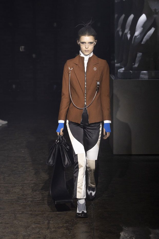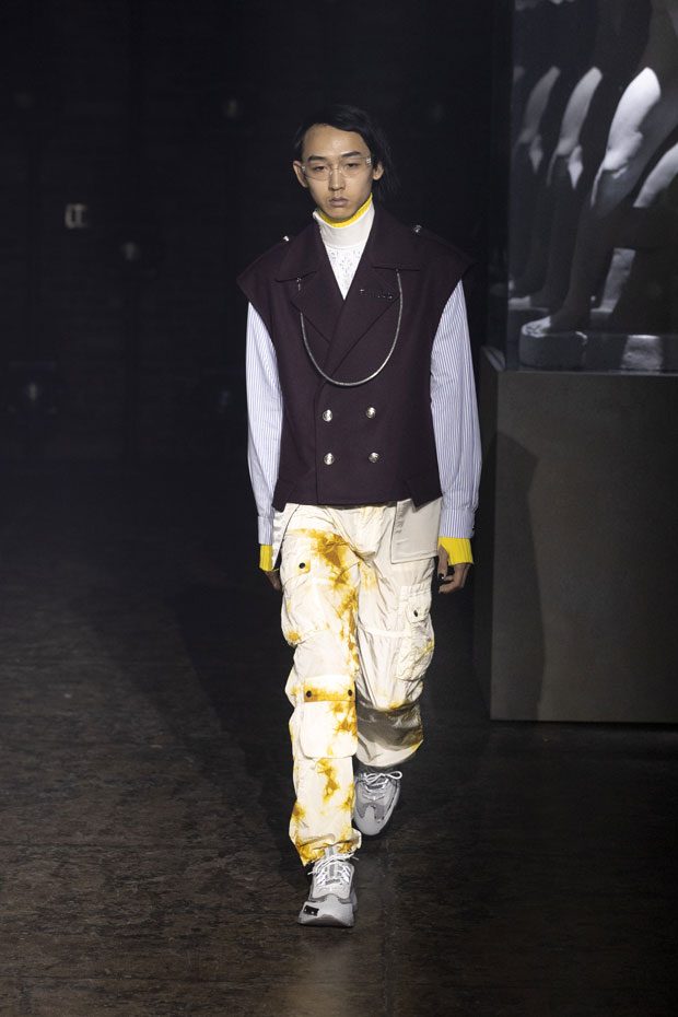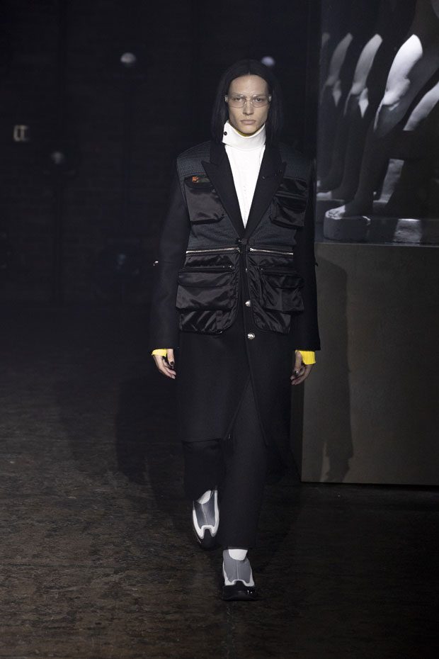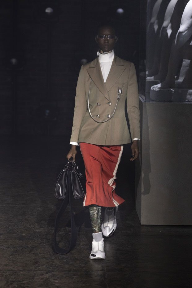 A foray into personal passions and obsession shapes the collection. The spirit is consistent: tropes taken from different cultures and their dress codes are clashed into non codified mixtures, creating biased iconographies. This season, the sartorial takes the lead, as the properness of formality becomes the vehicle for a take on rebellion that’s considered as opposed to loud, and assertive. It’s sartorial charged with a definite subcultural aura: the solaro two-tone fabric, zippered closures, boxy jackets and stovepipe trousers, as well as the frilly blouses are redolent of the Sixties. This clean language is constantly distorted with insertions hinting to the worlds of fishing & hunting and skiing: multi-purpose vests with mesh pockets, tool belts, articulated trousers. Sartorial and sportswear merge as prints and patterns progress from hunting camo motifs and acid tie-dye prints to ransom lettering to equestrian scenes worth a very bourgeois foulard. The brass buttons, pinstripe shirting and air of pomp and circumstance are just as bourgeois, but the whole balance is definitely not. Marilyn Manson wanders about. – from Palm Angels