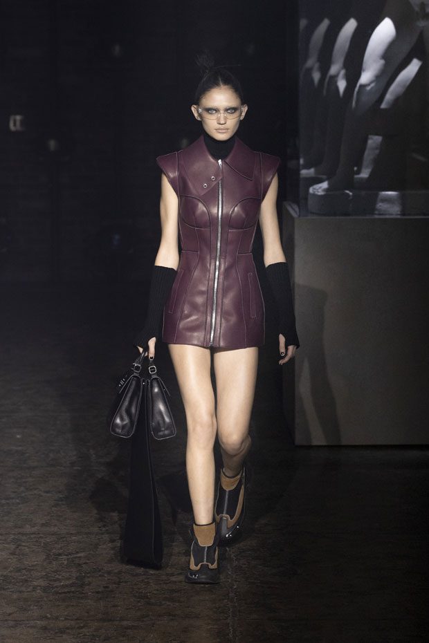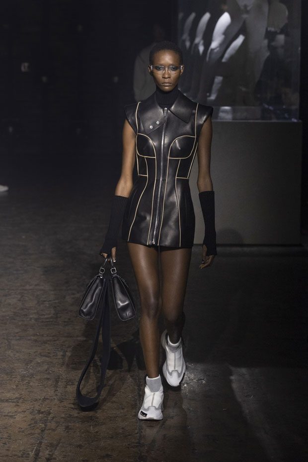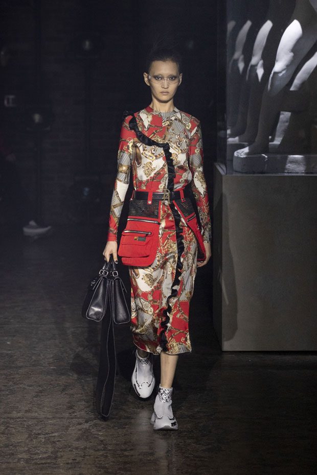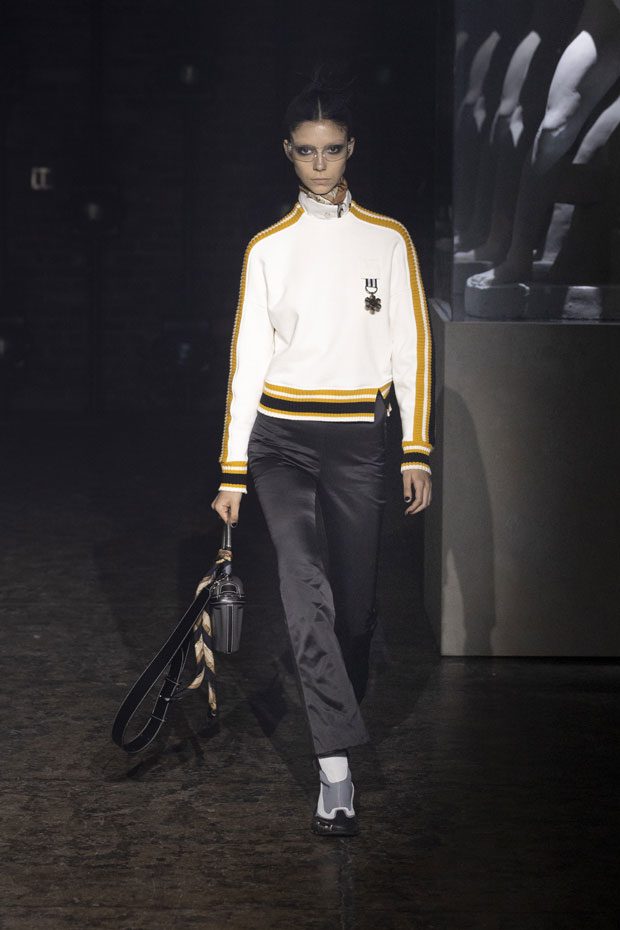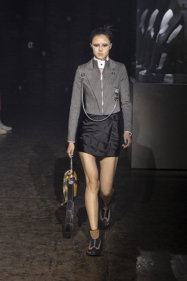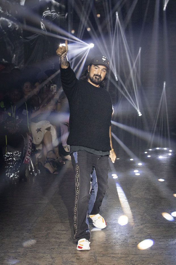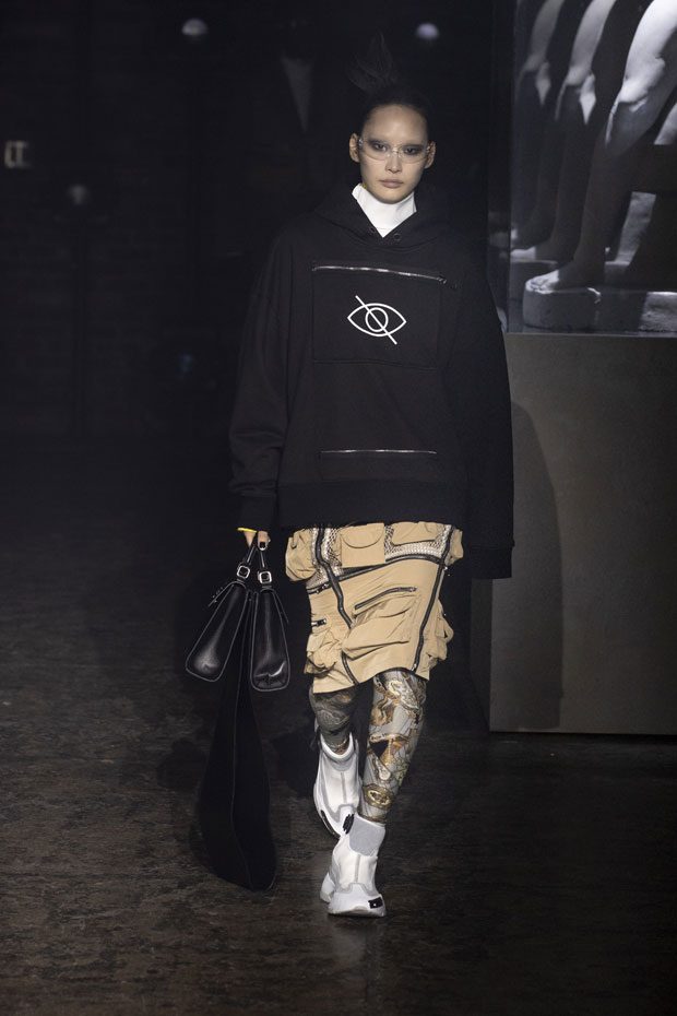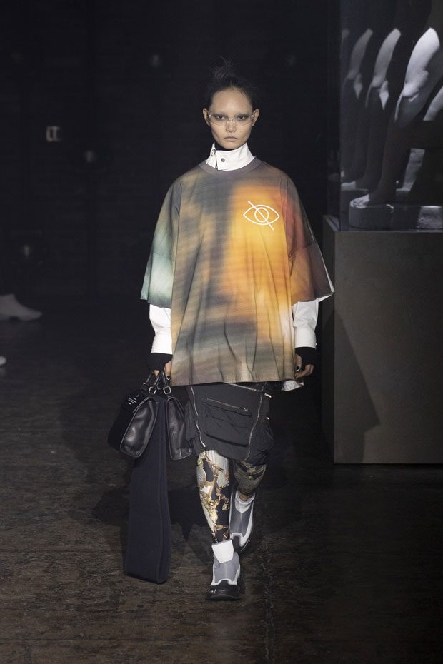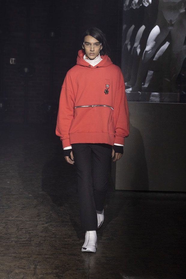 A foray into personal passions and obsession shapes the collection. The spirit is consistent: tropes taken from different cultures and their dress codes are clashed into non codified mixtures, creating biased iconographies. This season, the sartorial takes the lead, as the properness of formality becomes the vehicle for a take on rebellion that’s considered as opposed to loud, and assertive. It’s sartorial charged with a definite subcultural aura: the solaro two-tone fabric, zippered closures, boxy jackets and stovepipe trousers, as well as the frilly blouses are redolent of the Sixties. This clean language is constantly distorted with insertions hinting to the worlds of fishing & hunting and skiing: multi-purpose vests with mesh pockets, tool belts, articulated trousers. Sartorial and sportswear merge as prints and patterns progress from hunting camo motifs and acid tie-dye prints to ransom lettering to equestrian scenes worth a very bourgeois foulard. The brass buttons, pinstripe shirting and air of pomp and circumstance are just as bourgeois, but the whole balance is definitely not. Marilyn Manson wanders about. – from Palm Angels