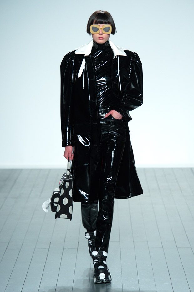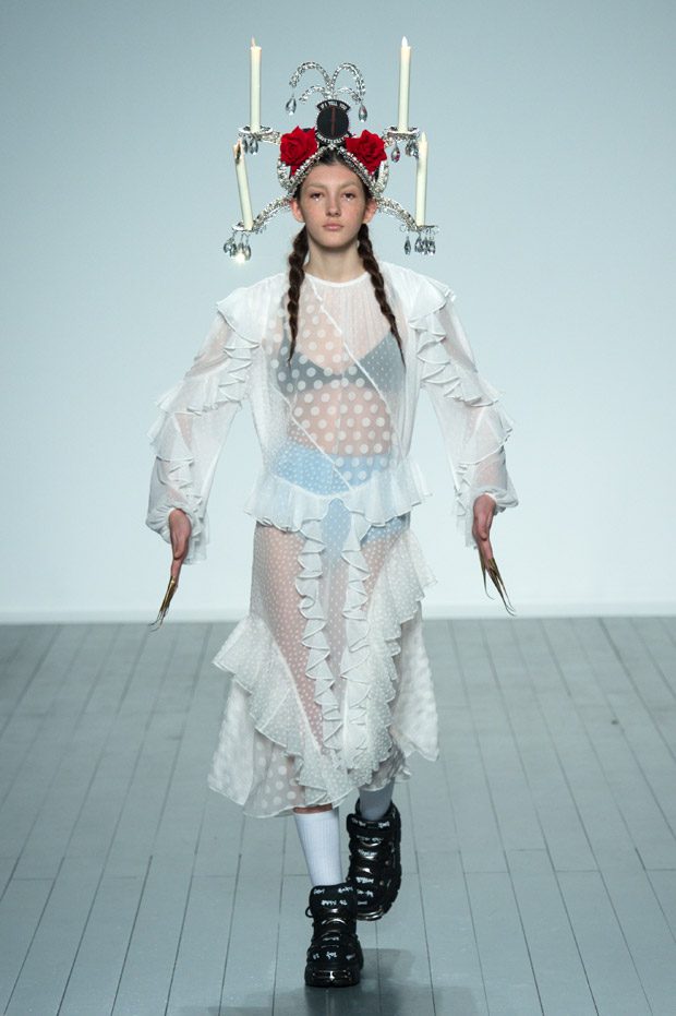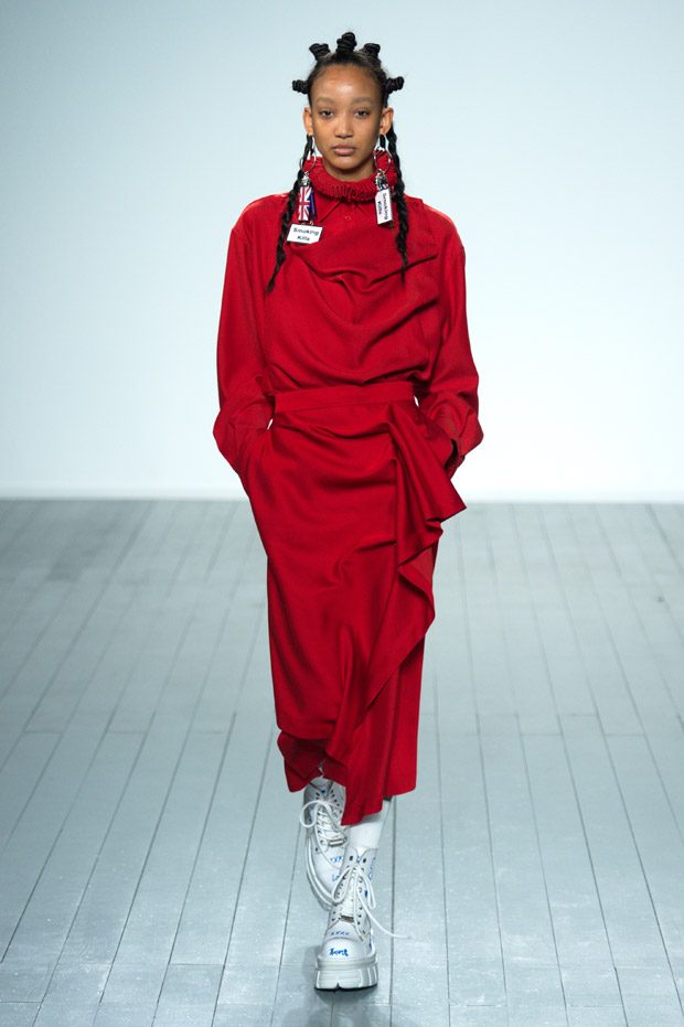 Historical dresscode’s play a strong role, with Elizabethan collars and pourpoint jackets given modern update reproduced in sporty sweatshirt fabrics and silk dressed paired with bulky sneakers, reaffirming the anarchic punk attitude. Checks, patterns, dots, leopard print, vivid bold acid shades, frills and military detailing are blended be to create the perfect balance of oddities to create something new exciting a fresh.“