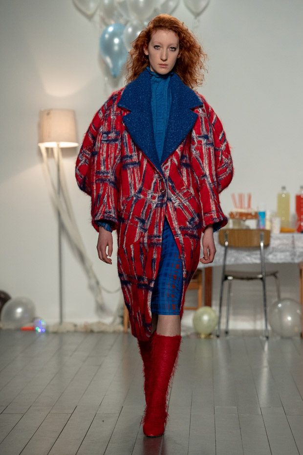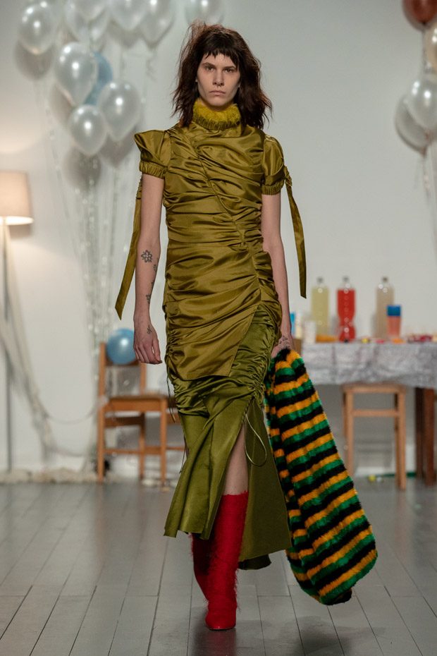 “What is suitable for adults is considered. Malone speaks the language of bad taste, where words which would typically make the fashion-literate wince – ‘fuzzy’, ‘cuddly’ – are warmly embraced. Striped stoles rendered in ‘fun fur’ are made from repurposed dog beds, frock coats are fashioned from workwear twills typically found in school uniforms. Retro party plates inspired the prints seen across recycled, organic cotton jersey. Waste is limited – dresses are cut from precisely one metre of woven fabric and shaped through contouring by hand. Much of the colour palette takes cues from the tonal browns of ‘bad, mum lipstick’ and the optimistic brights of street party flags. Bra cups deliberately sit away from the body, artfully awkward.
