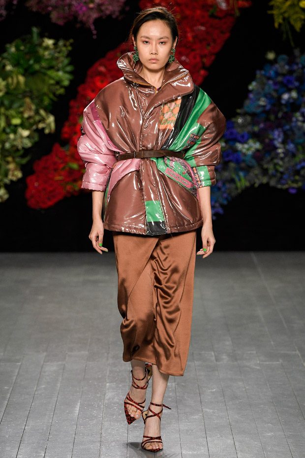 Einer builds on this with puffa jackets that riff more on the side of a gardening jacket – for Einer’s grandmother was a keen gardener and once won a prize for the most beautiful garden given by Estonian president. It’s in this cherished memory that the collection is peppered with references: big retro crystal-shaped floral earrings – there are bold and bright snakes and geckos too; rich, lush mossy greens for a show-stopping sequin and frayed silk bomber-puffa; and the floral jacquard wrap-around buckled skirts, which also appear in tartan.“