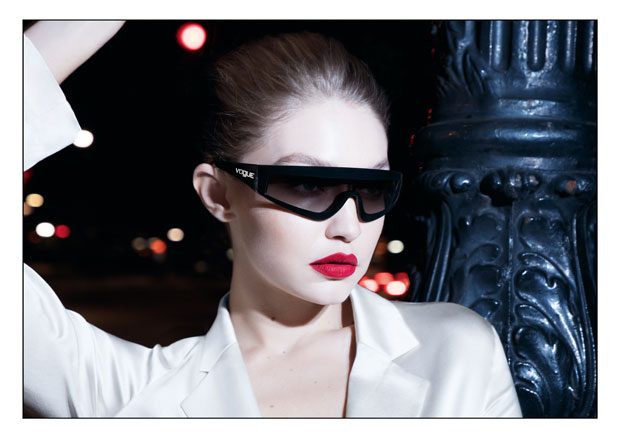 Inspired by the many moods of the metropolis, and the people and places that make it her home, each style in the new collection was designed and named by Gigi herself and captures a moment in her life. From the edgy retro-future reality of a “city that never sleeps” to the A-list glamour of exclusive Manhattan clubs, Gigi invites us to max-out on the latest trends with one-of-a-kind personality. Framing her spontaneous it-girl style, the eclectic selection highlights the future-focused vision of contemporary women whose look says it all: be it a visor or wrapped shield, a petite metal cat-eye or dazzling low-cut shapes with uber-fashionable 90’s style, this attitude-packed collection is everything you want it to be, and more. – from Vogue Eyewear
