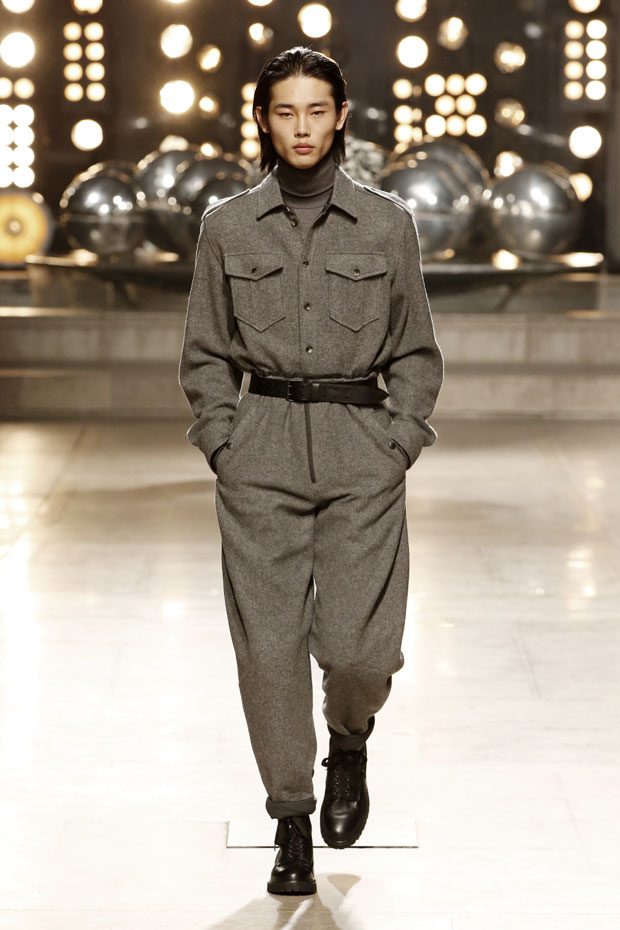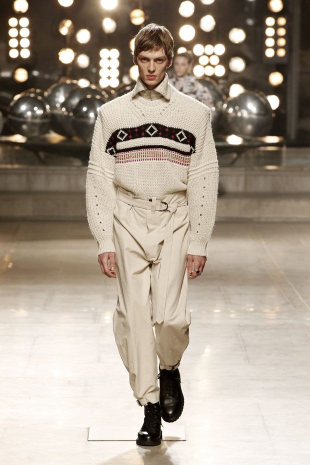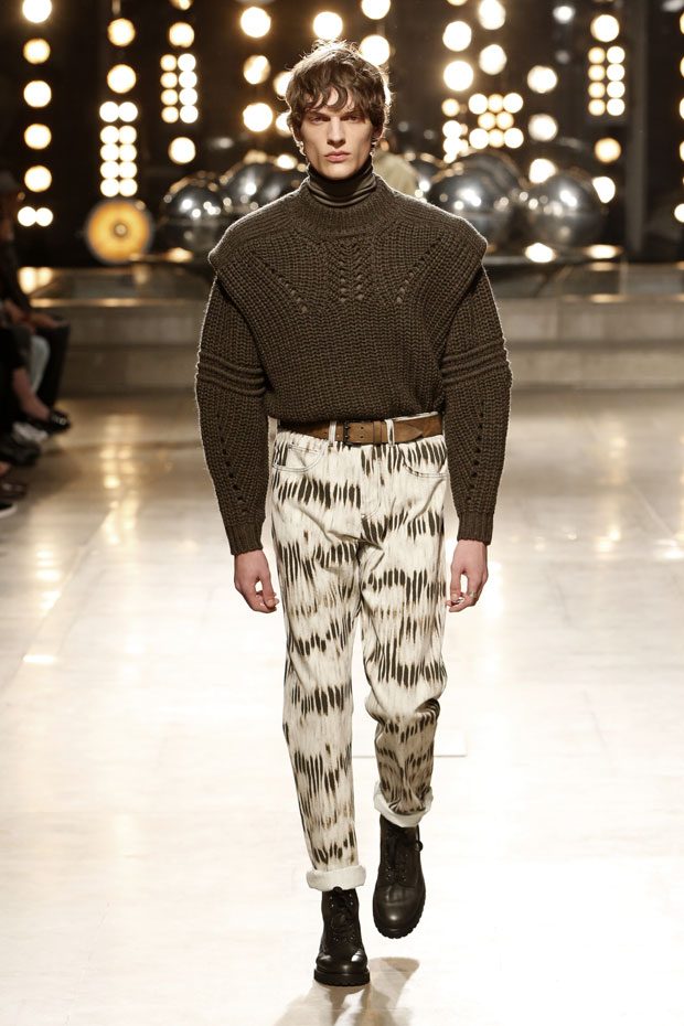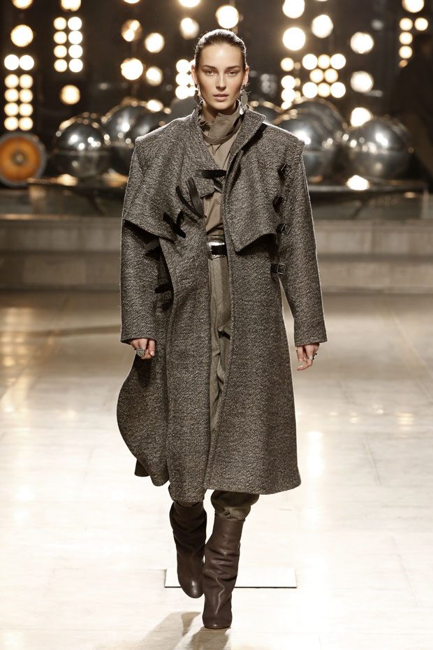 This woman knows exactly who she is. She’s travelled all over the world, bringing back images, colours and cultures that have permeated her personality. She could be a reporter, like photographer Marie-Laure de Decker, the icon so dear to Isabel who has captured the reality and beauty of our world for 50 years. Fed by military inspiration and codes adopted from a masculine wardrobe, celebrates, her adventurer style celebrates cultures, comfort and craft: printed and quilted cotton twills, Indonesian ikats, earthy colours, all-terrain knits, sarong-style draped leather skirts, tie-dye camouflage prints… The thigh-high boots toy with volumes, the Berber-inspired silver jewellery is worn en masse, the Australian shearling and moleskin down jacket warm up the look, cinched with wide belts in leather and metal. A collection that celebrates freedom, self-confidence and adventure. – from Isabel Marant