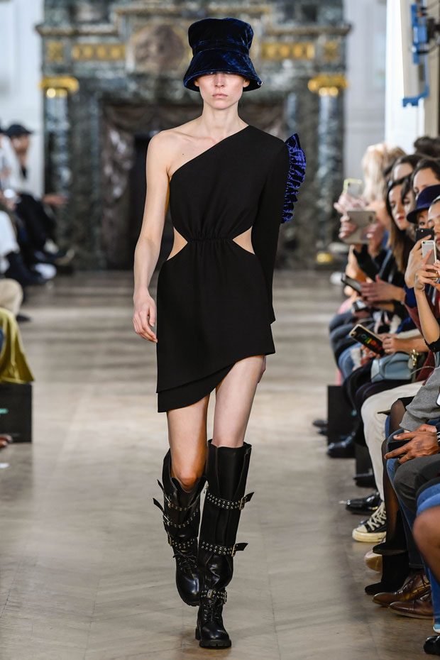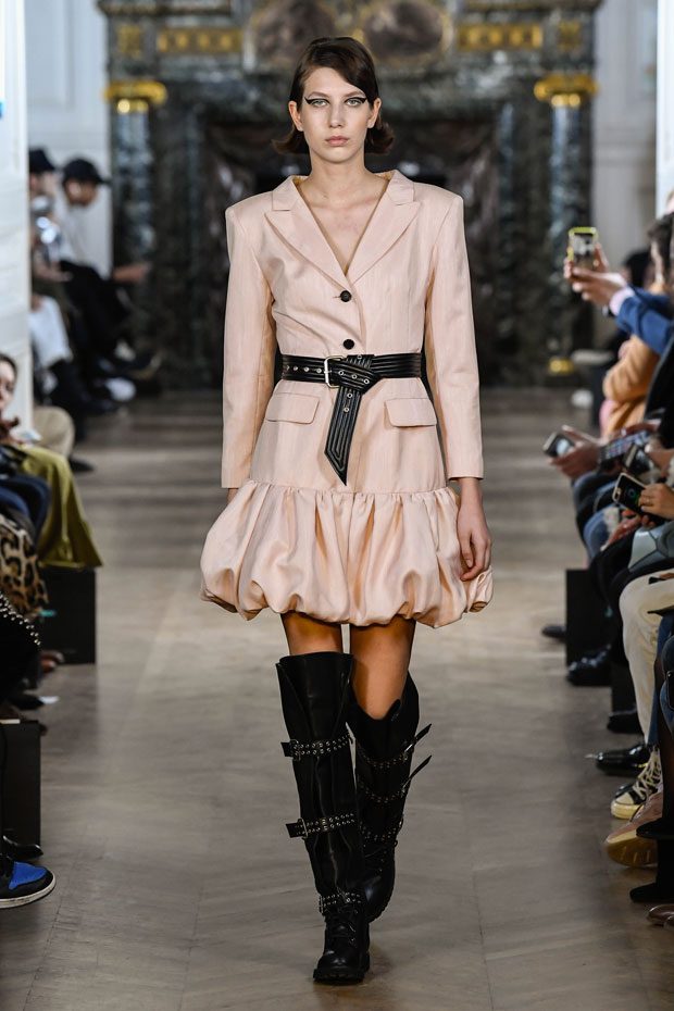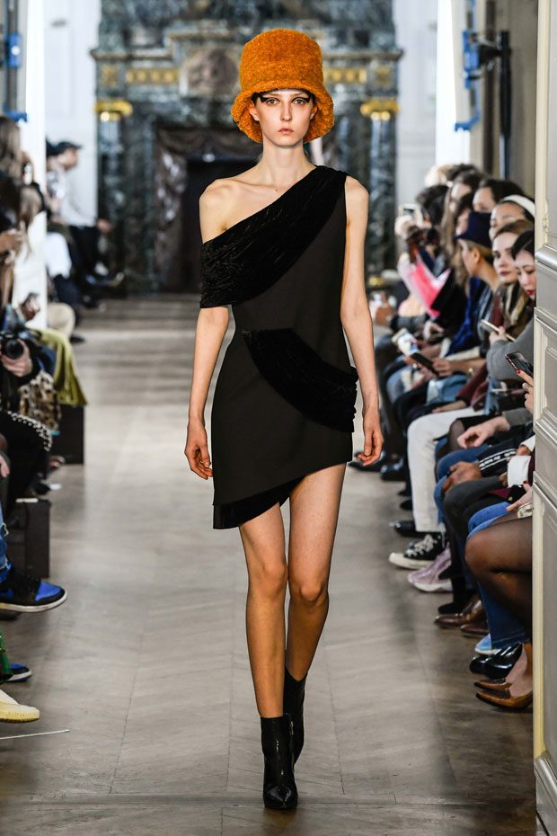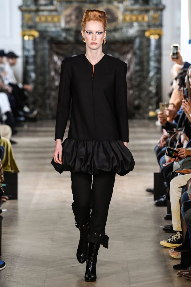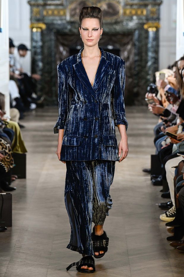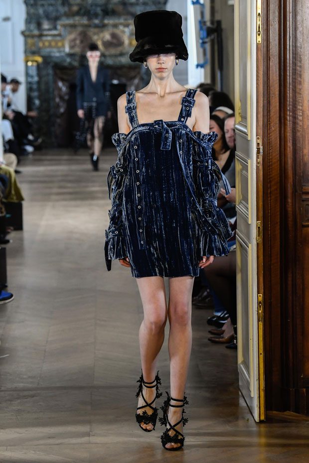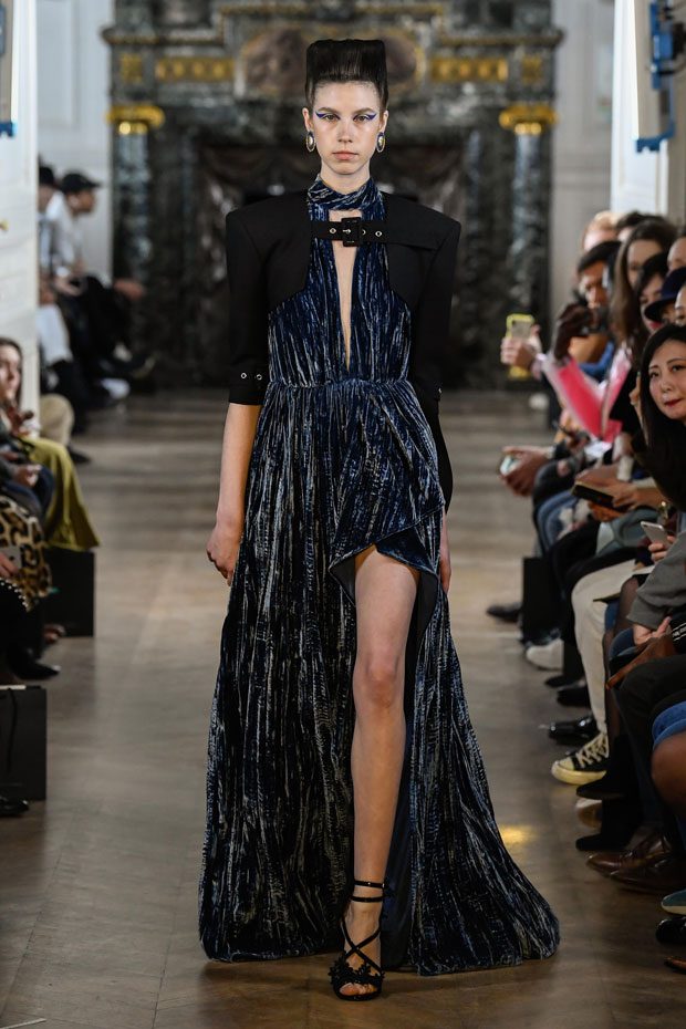 This collection Liu Chao was searching the “neutrality” culture since the beginning of the time, trying to combine the business women from the 80s, Peter Burns’s neutrality dress code and the French haute couture spirit together. In this collection, the designer has used a lot of velvet as material. The woman to whom he speaks is an independent woman, strong, with character, who has self-confidence and who is interested in fashion. She wants a wardrobe that allows her to go to work as well as to go out in the evening. All the accessories she wears on this runway are pieces found on the Paris flea markets. – from Liu Chao