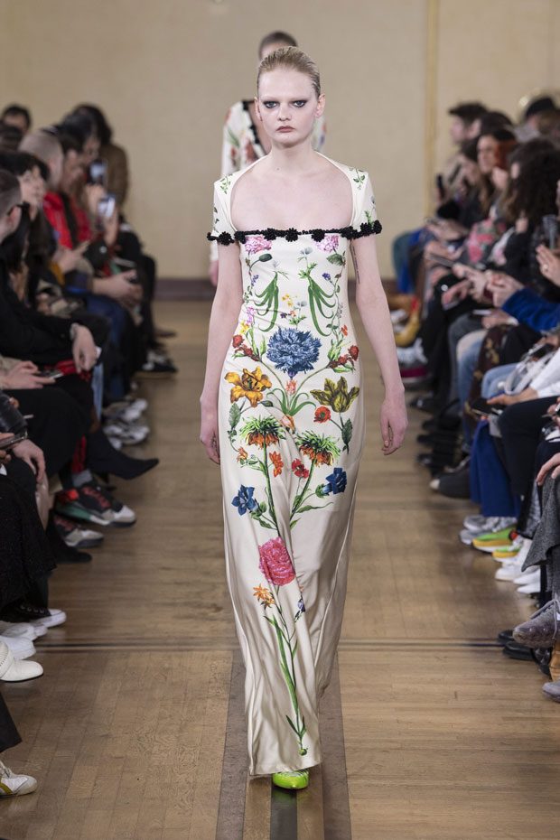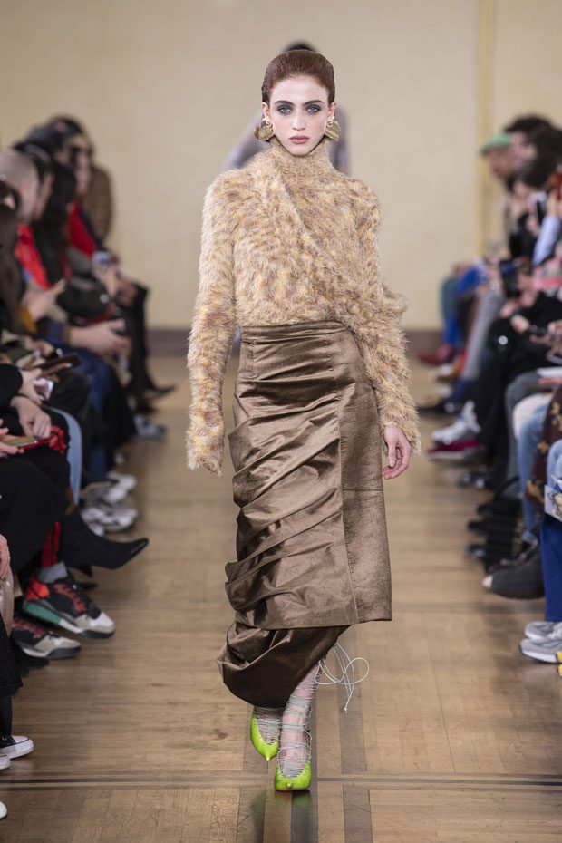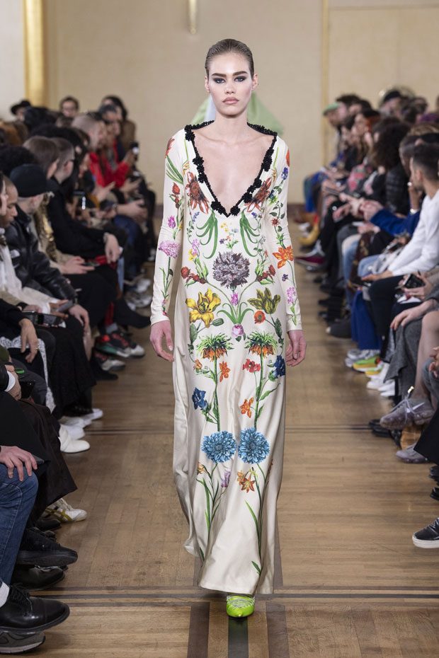 Glenn Martens creates a renewed sense of evening elegance, sensuality and drama, executed with the craft and wit Y/PROJECT is renowned for. Inspirations run from the Middle Ages to the 70s, bringing in an incredibly rich variety of fabrics, textures, colors and prints. The blending of corduroy, iridescent velvet, linen, faux-leather and fur, pearls, rhinestones, embroidery and Renaissance floral prints gives an extra bohemian accent to this prolific collection. True to Y/PROJECT’s constructionist ethos, deconstructed pieces remain the brand’s main signature: panel, pop up, doubling features continue to punctuate the collection. Panelled shoulders are adapted to a variety of pieces throughout the collection: oversized cardigans, tweed coats with faux-fur details, silk shirt dresses and elegant sweater dresses. The trompe l’oeil hot pants are re-imagined in a tulle stirrup legging version. – from Y/Project