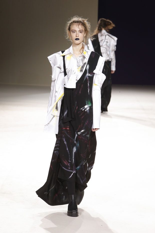 Through the details, Yohji Yamamoto gives an unfinished look to his silhouettes. A desire to put forward a «primitive» aspect and to pay homage to this time when ready-to-wear as we know it today did not exist. This «anti-fashion» period where mothers of families made clothes for themselves and for theirs. This innocent fashion in which these non-fashion professionals worked, cut the fabric spontaneously. In this new collection, innocence is also found in the colors brought to the clothes, such as drawings made by children. – from Yohji Yamamoto
