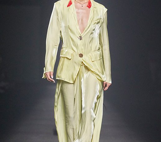 Our collections are a tapestry of elements combining traditionally marine associated garments with modern and technical diving gear. For women, neoprene suiting in orange, violet and black are juxtaposed against crushed wet-look jersey tops and dresses. Skirts in mermaid jacquard linens are adorned with pearl buttons while nylon tops in vivid colors of corals have sleeves rolled up to the shoulder. Transparent suiting complements the prints of shrimp, mermaids and sea lilies. High waisted trousers feature an assembly of embroideries, reminiscent of treasures amassed while diving. Woven ikats feature on either dresses, tops for women or as panelling on shirts and trousers for men. Tailoring in liquid viscose, sun-bleached denims and ikat prints also straddle both collections – Carol Lim & Humberto Leon