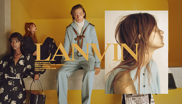 First look at Lanvin‘s Fall Winter 2019.20 campaign featuring models Dotain Yeshitela, Freek Iven, Jeranimo van Russel, Kat Carter, and Sara Grace Wallerstedt captured by fashion photographer Glen Luchford. In charge of styling was Carlos Nazario, with creative direction from Ezra Petronio, and casting direction by Piotr Chamier. Beauty is work of hair stylist Paul Hanlon, and makeup artist Lucia Pieroni.