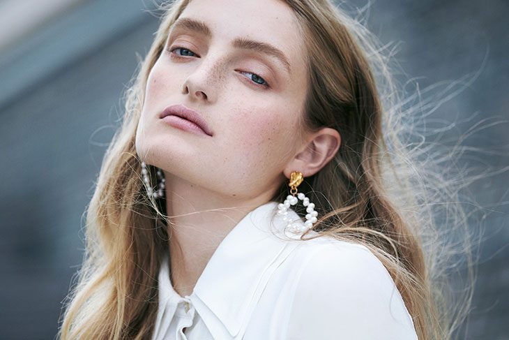Shirt: Shoptye / Pearl earrings: Alighieri