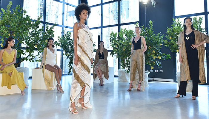The presentation will appear as a light sensorial conversation, a slow stroll admiring dresses in a lemon grove, models on summer-looking swings, smelling citrus perfumes and the fresh caterer’s food on the experimental notes of Mediterranean sounds.